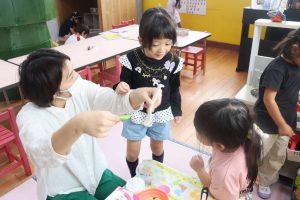 次はスライム粘土🎶はさみで粘土をちょっきん✄