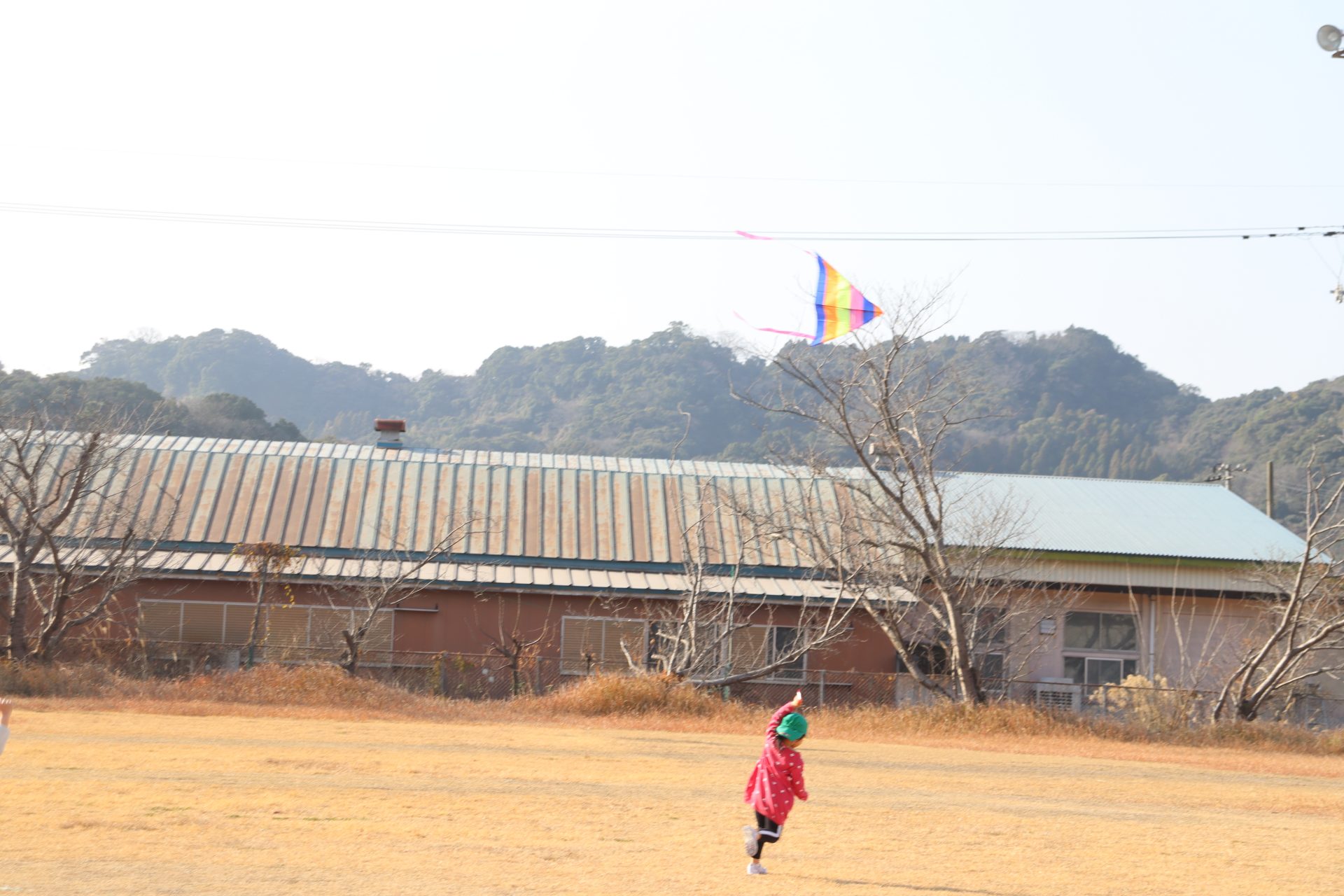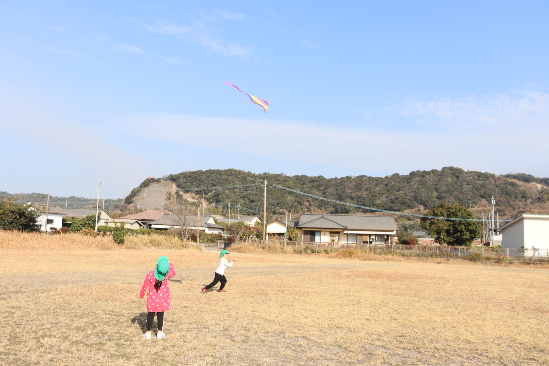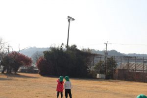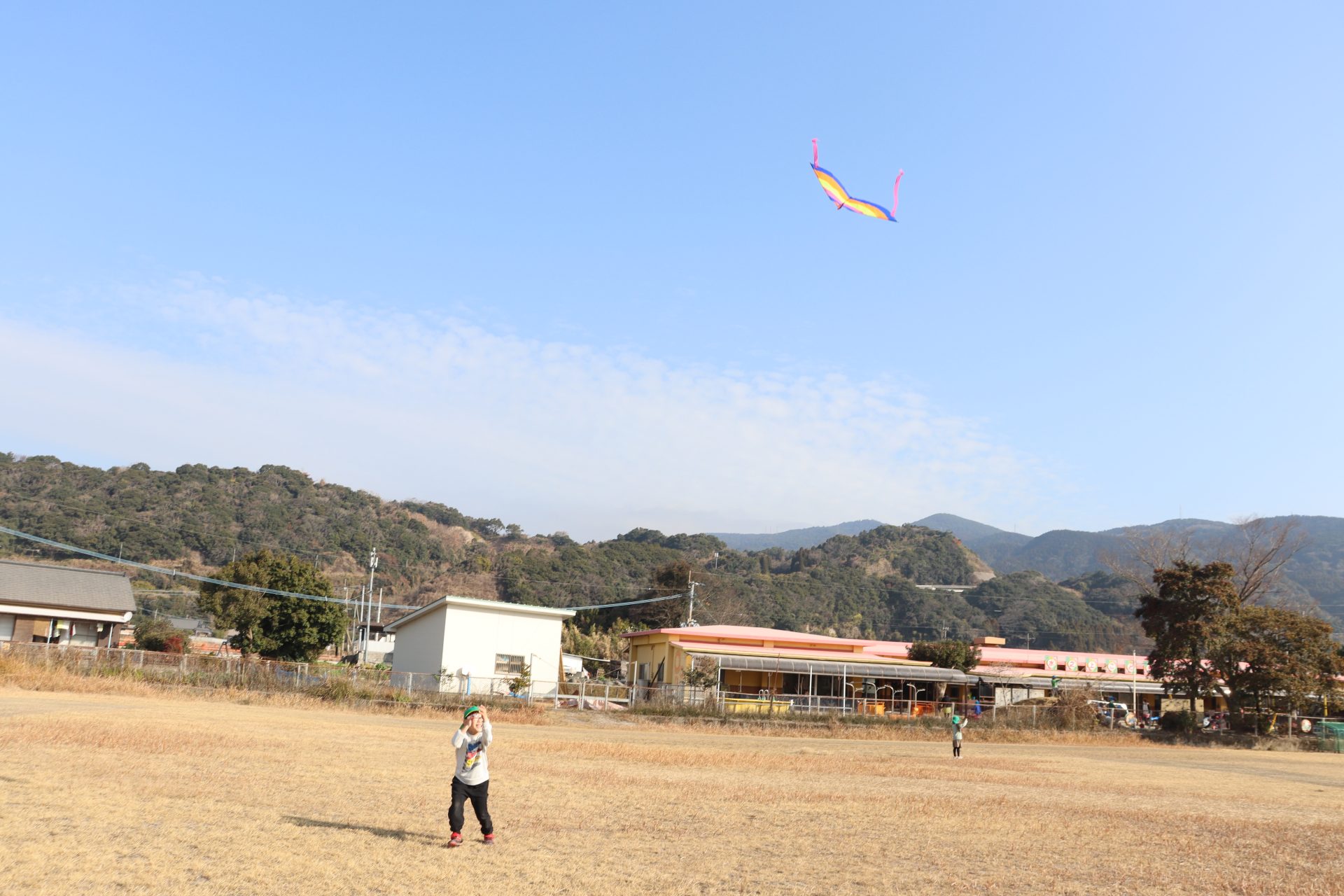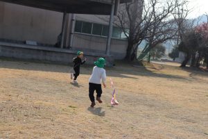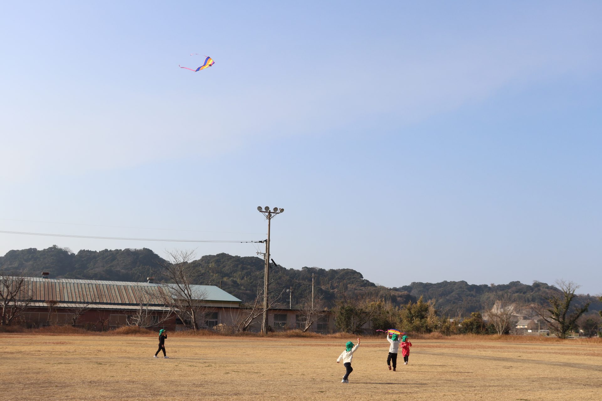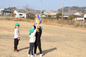 風が程よくあったので、グラウンドで凧あげをしました(*’▽’) 2つしかなかったのですが、子ども達は自然と分かれて、凧が上がるためのお手伝いをしてくれたり、一緒に駆け回ったり、交代をしたりしてそれぞれ楽しんでいました💕上手に上がった凧✨写真が遠いです💦