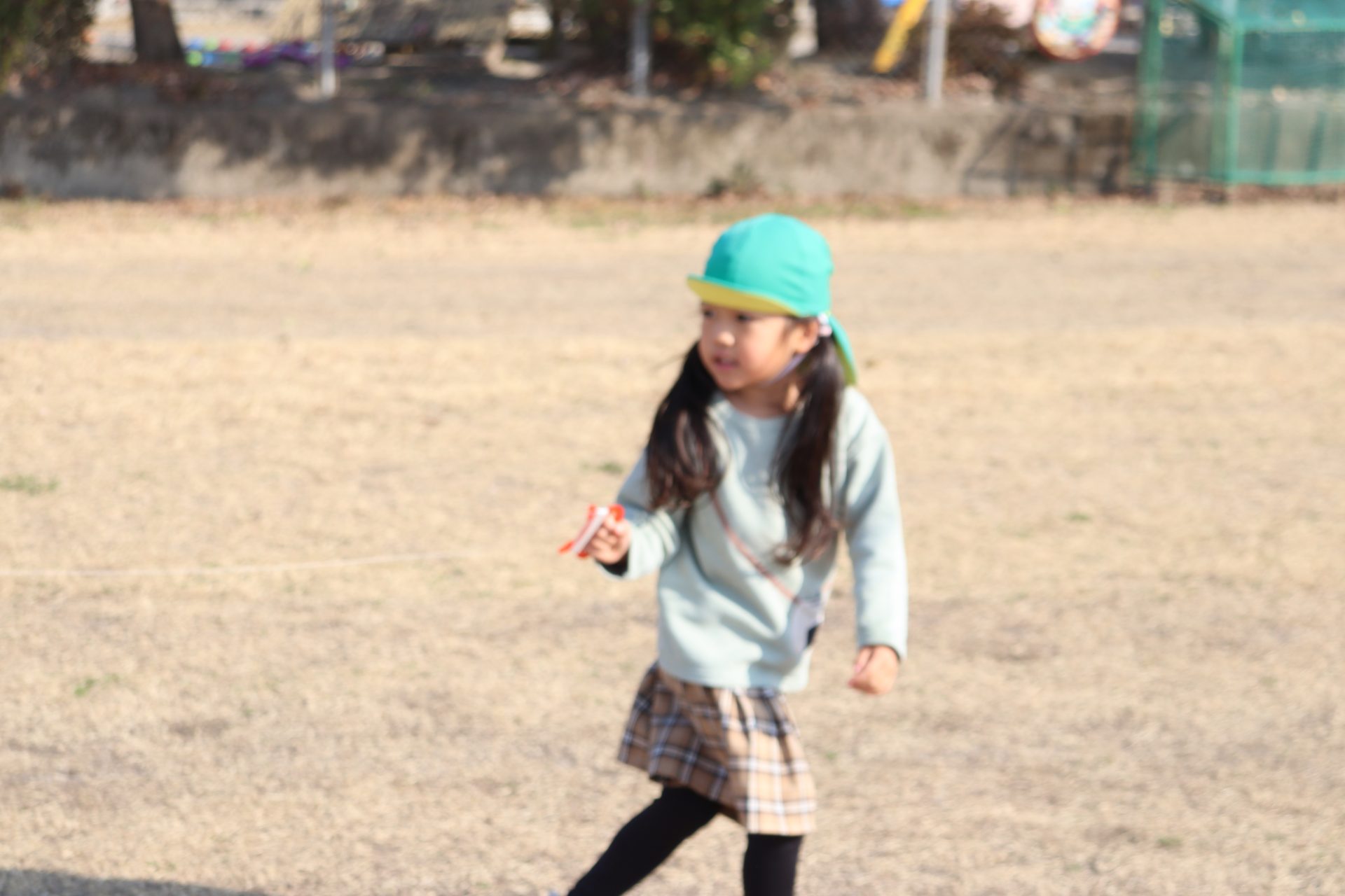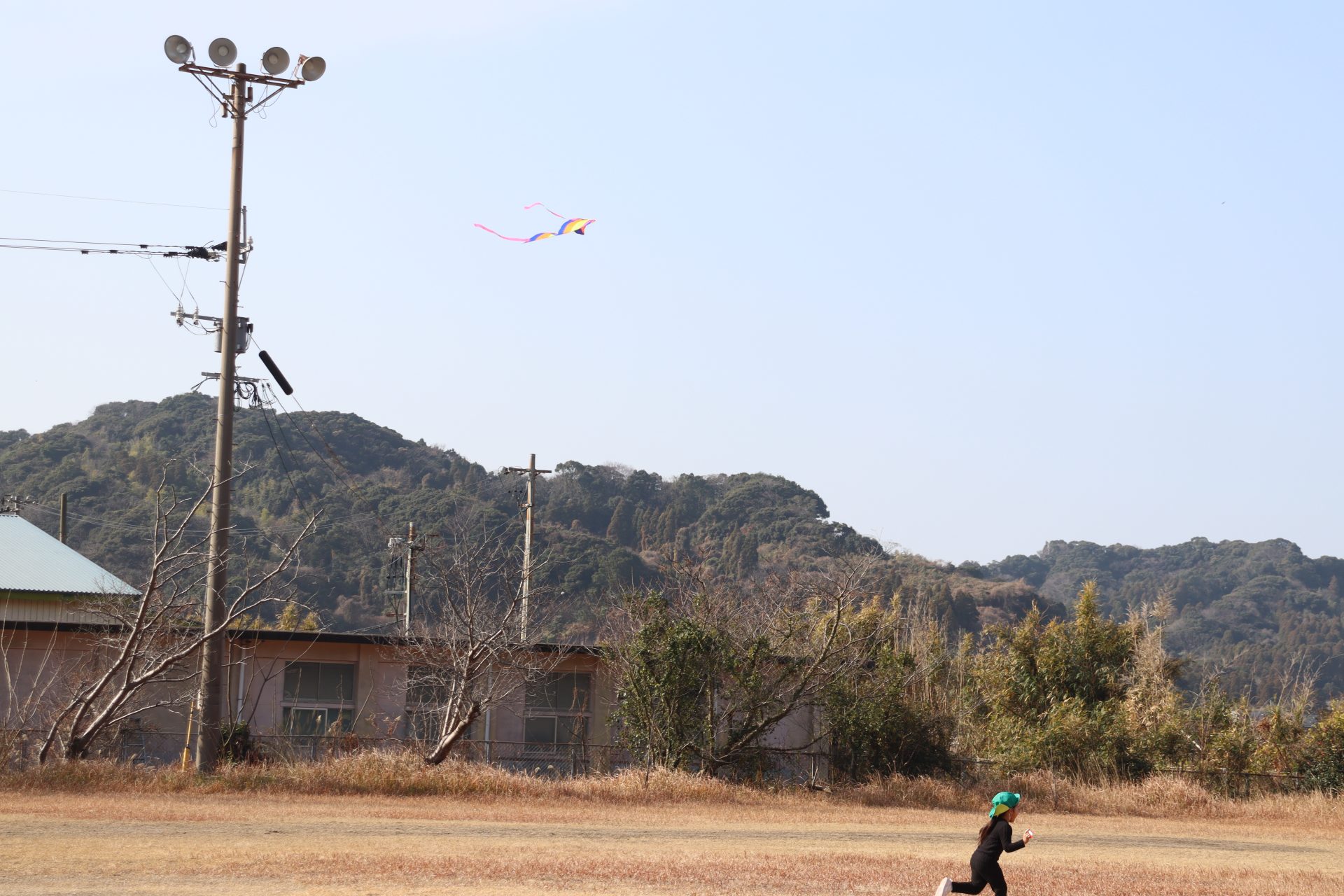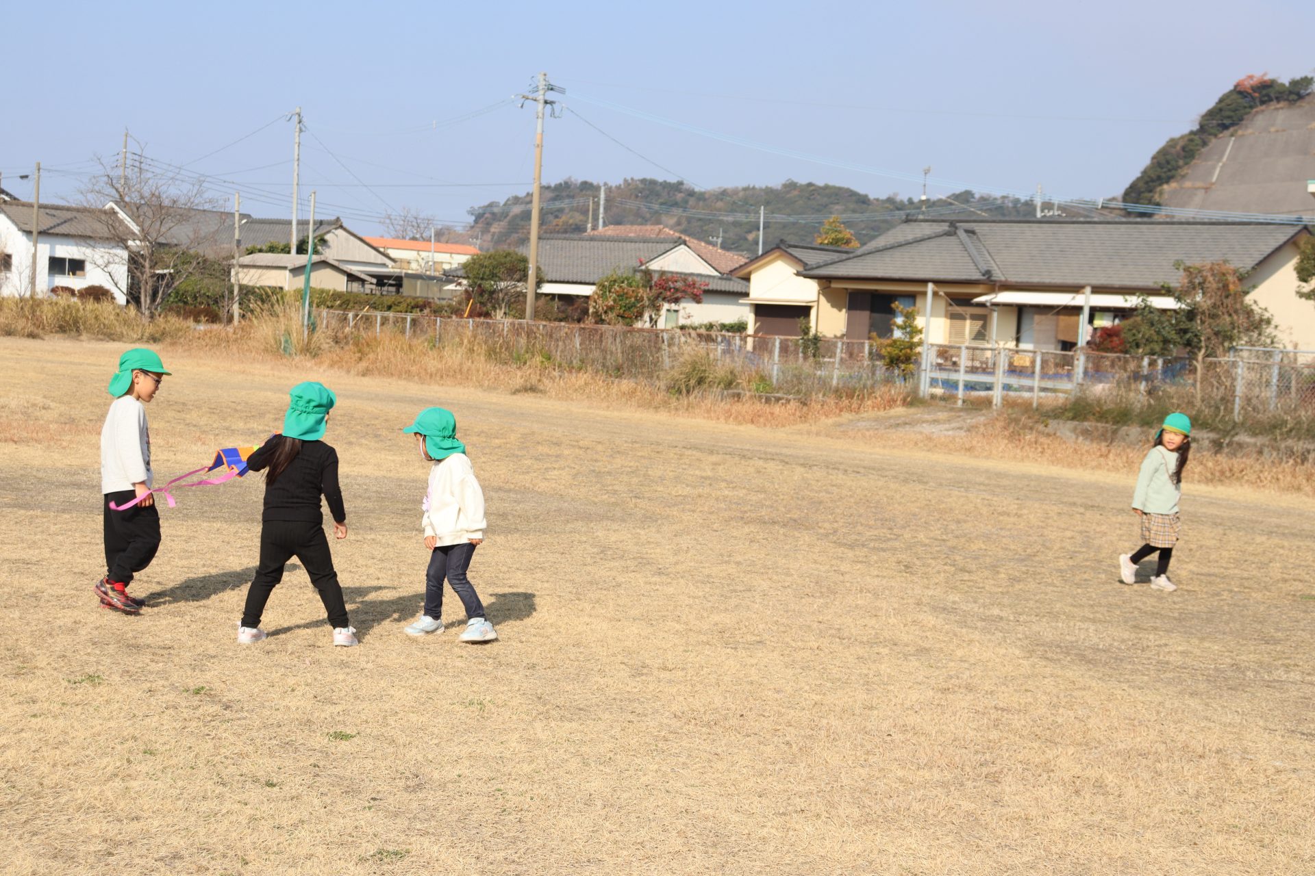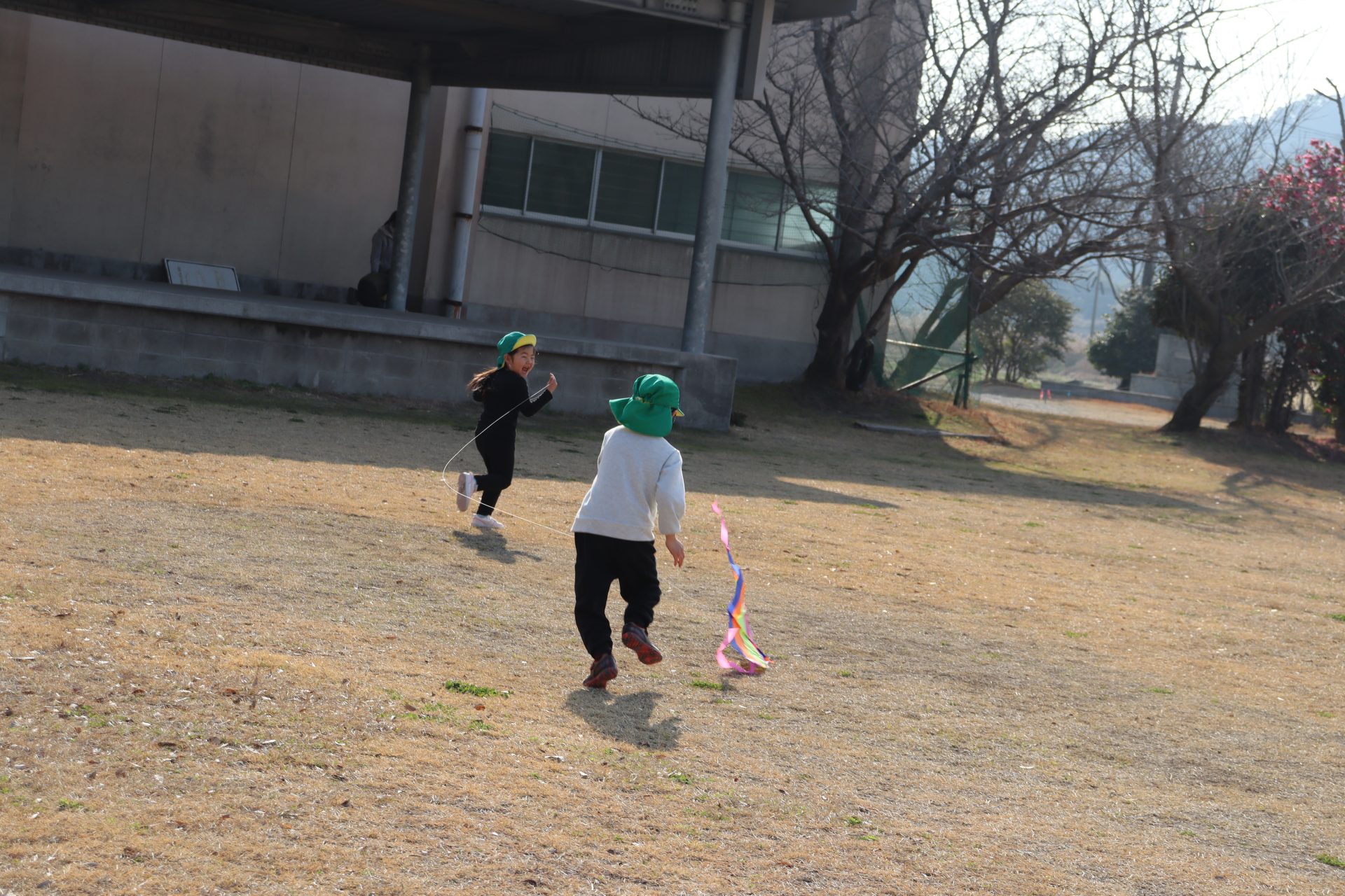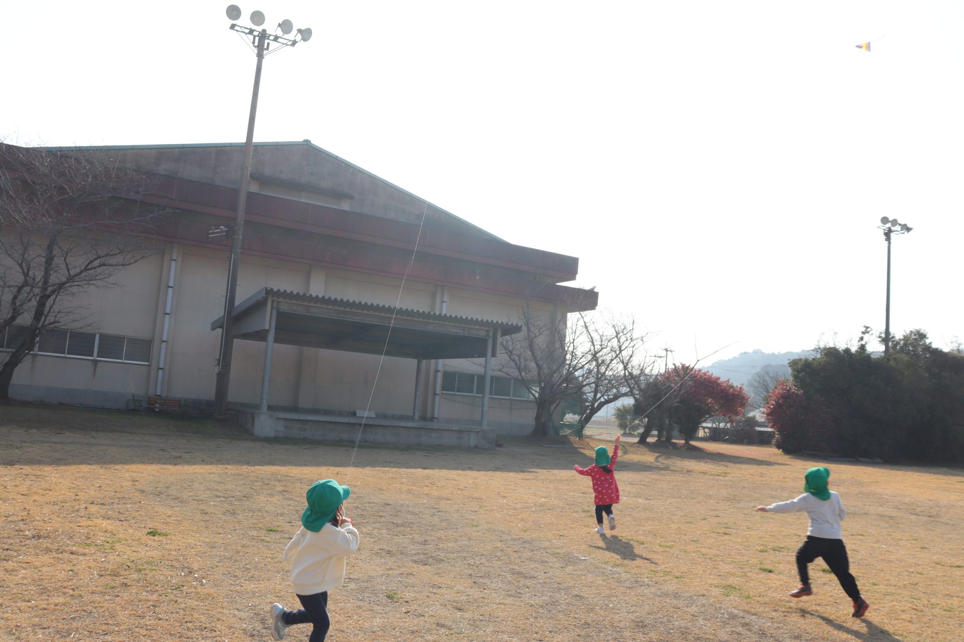 風が程よくあったので、グラウンドで凧あげをしました(*’▽’) 2つしかなかったのですが、子ども達は自然と分かれて、凧が上がるためのお手伝いをしてくれたり、一緒に駆け回ったり、交代をしたりしてそれぞれ楽しんでいました💕上手に上がった凧✨写真が遠いです💦
