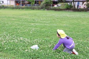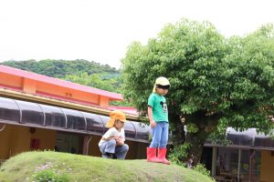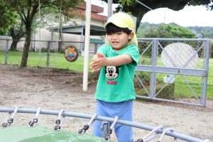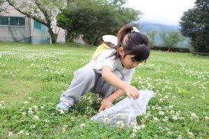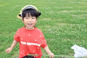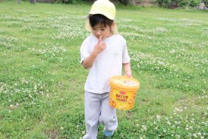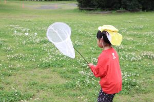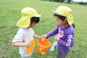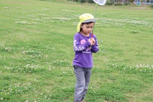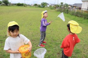 みんなで雨が降っていないことを確認してからお外へ~🎶 早速「グランドに行きたい!」と言って、虫網と容器を持ってグランドへ!(^^)!
