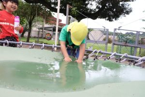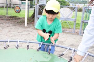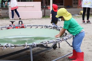 Rくんはトランポリンに溜まった水に興味津々✨トランポリンを押したら水が流れてきて~水の流れは大人も興味津々で子ども達と一緒に見ています(^^♪