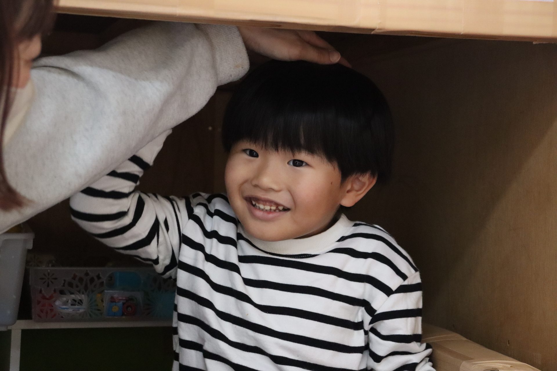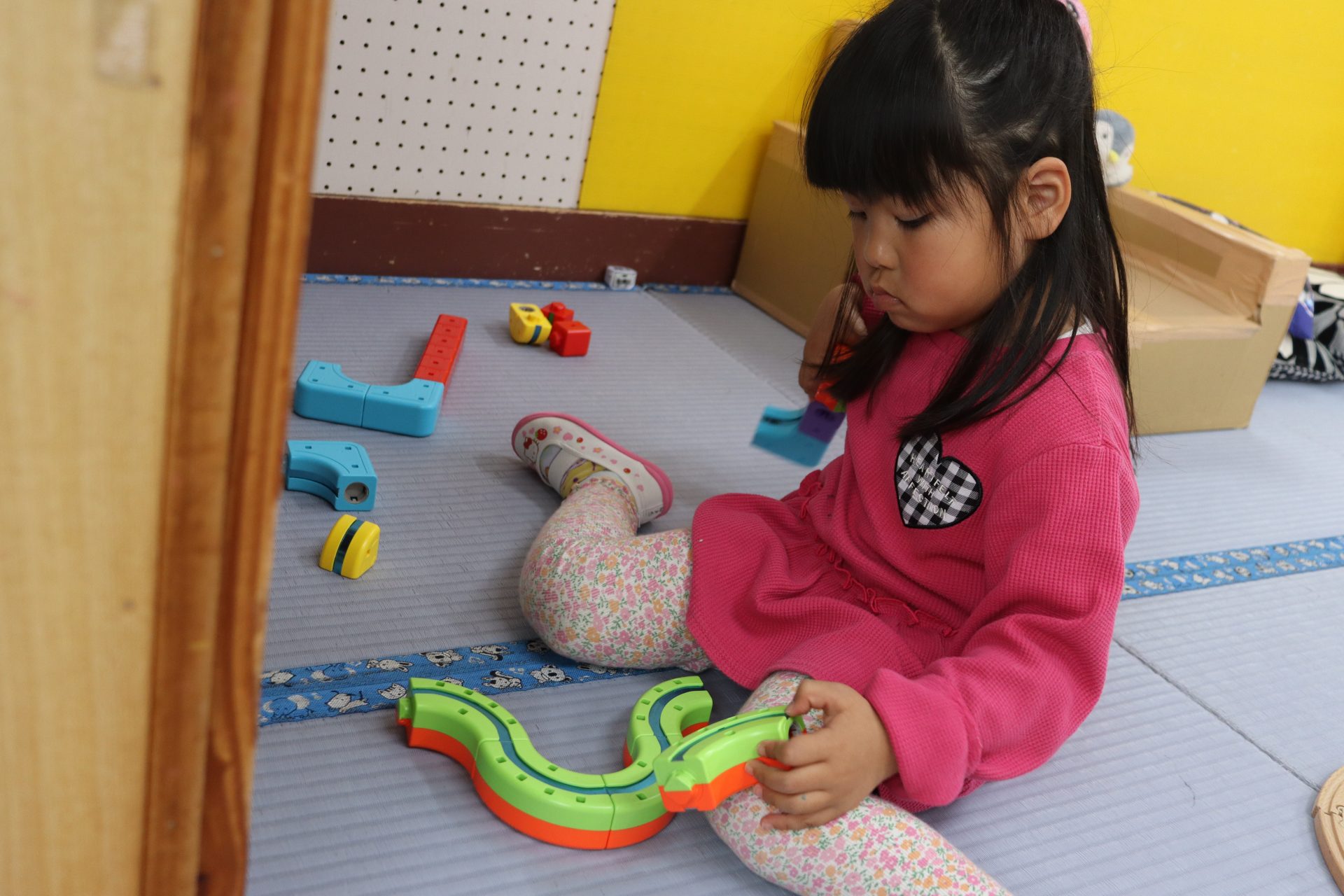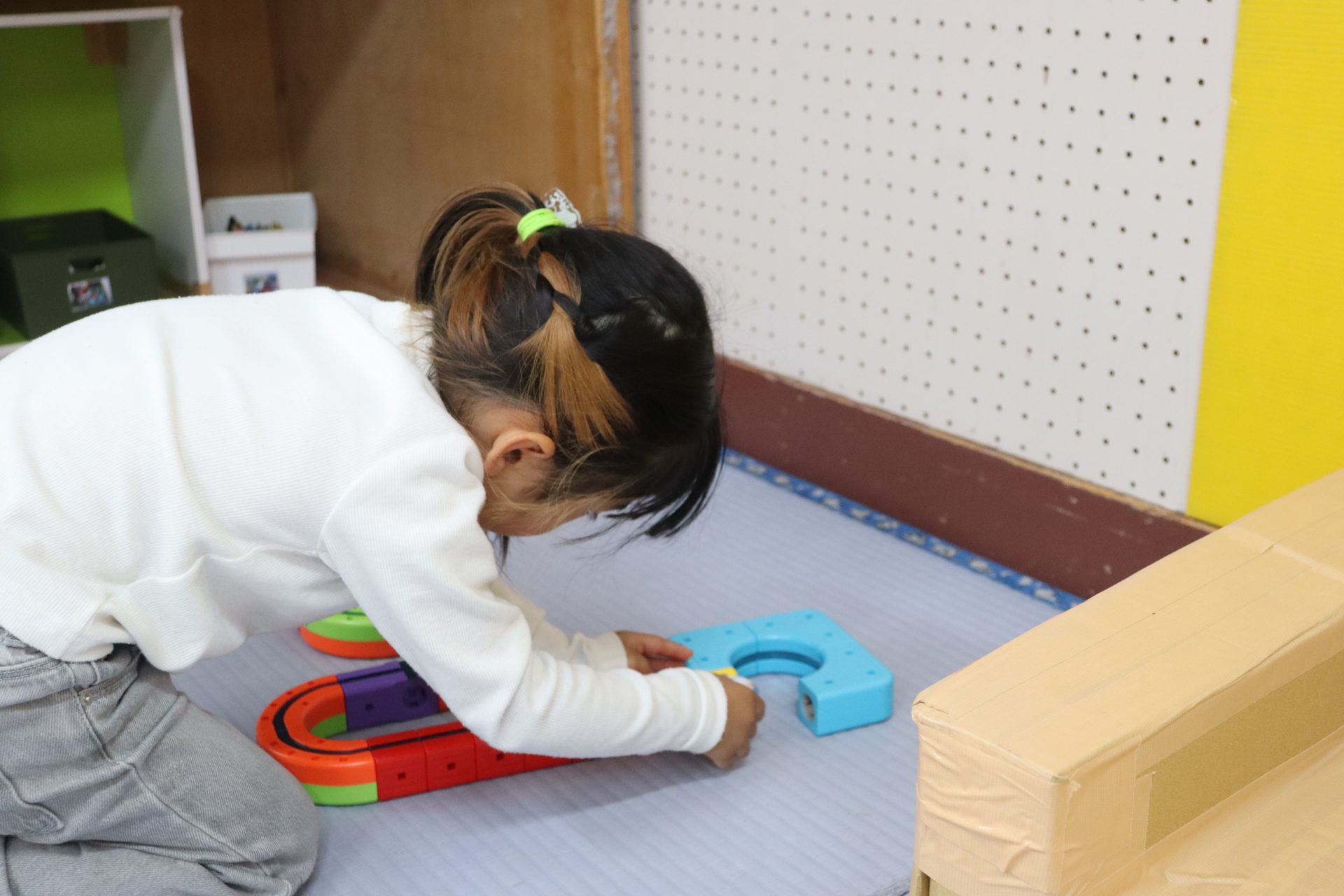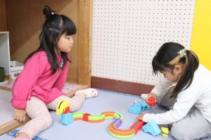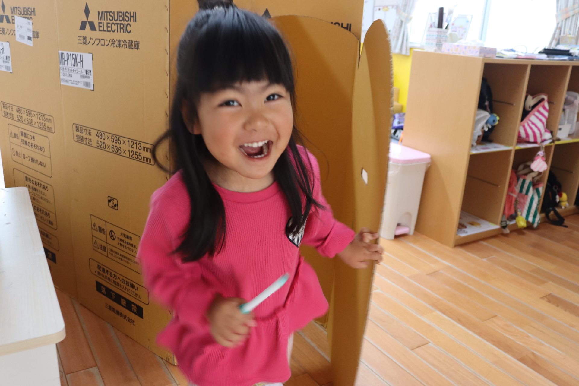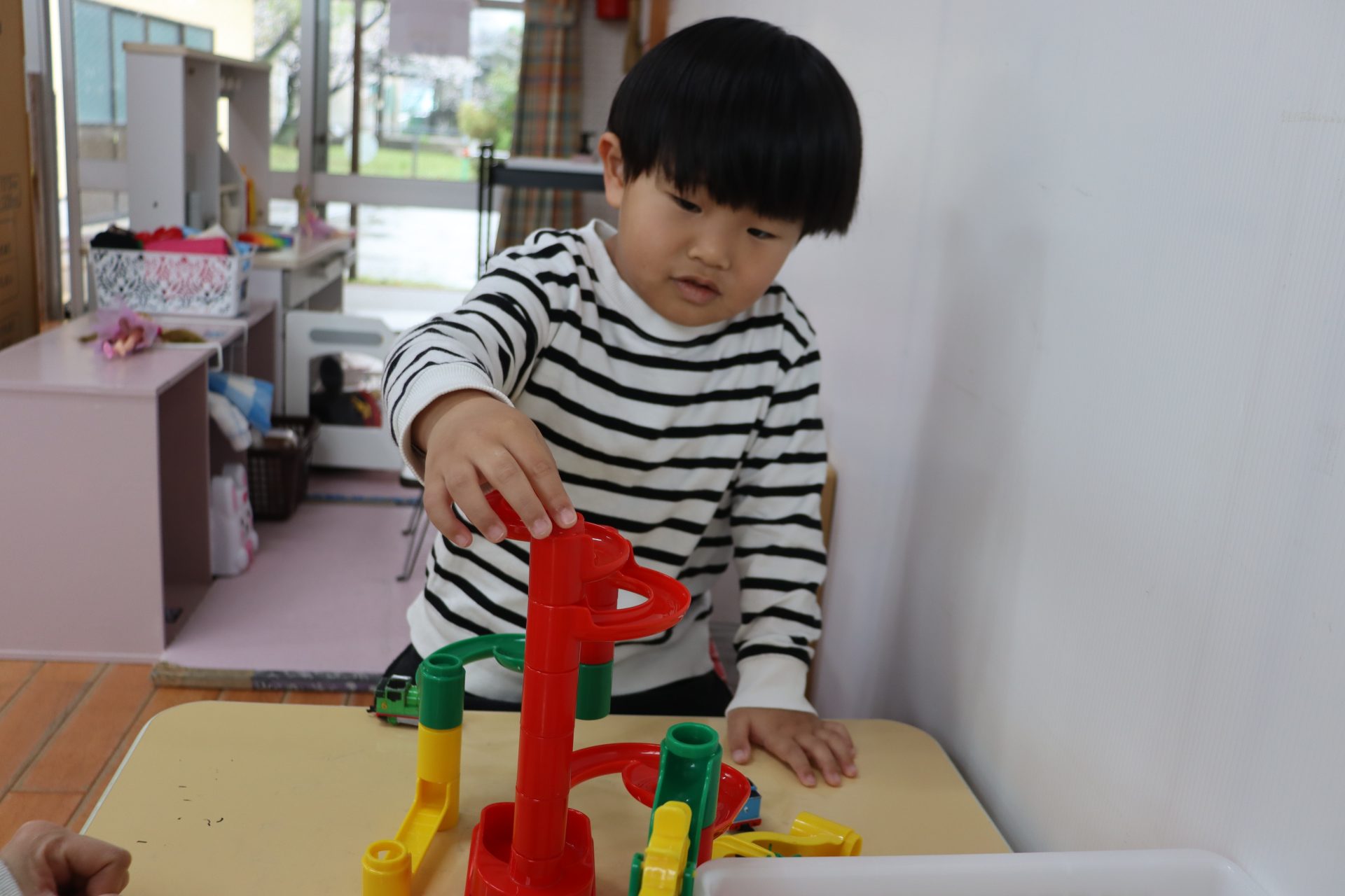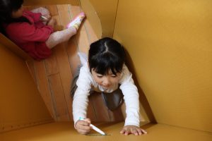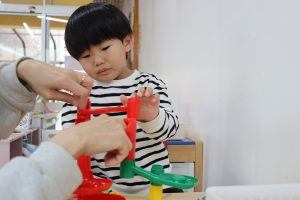 進級おめでとう✨ (ばら組) 今日からいよいよ ばら組での園生活スタート(/^^)/✨ お部屋に入ってきょろきょろ👀「……👀」見慣れたはずのばら組さん…何か変わっている✨という様子でした(*^^)v 早速新しいおもちゃを見つけました💕 ちょっとここで休憩🎶段ボールハウスに落書き中!(^^)! 『くみくみスロープ』つなげ方でビー玉の落ちる位置が変わるのですが、大人でも難しいんです(>_<)💦 実は子ども達 あと1つ見つけていないおもちゃがあるんです( *´艸`) 発見するまでヒミツにしていたいと思います( *´艸`)💕