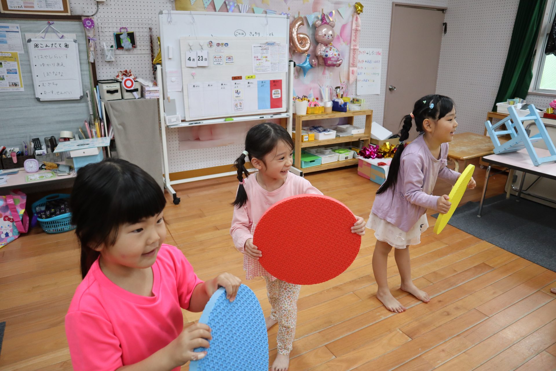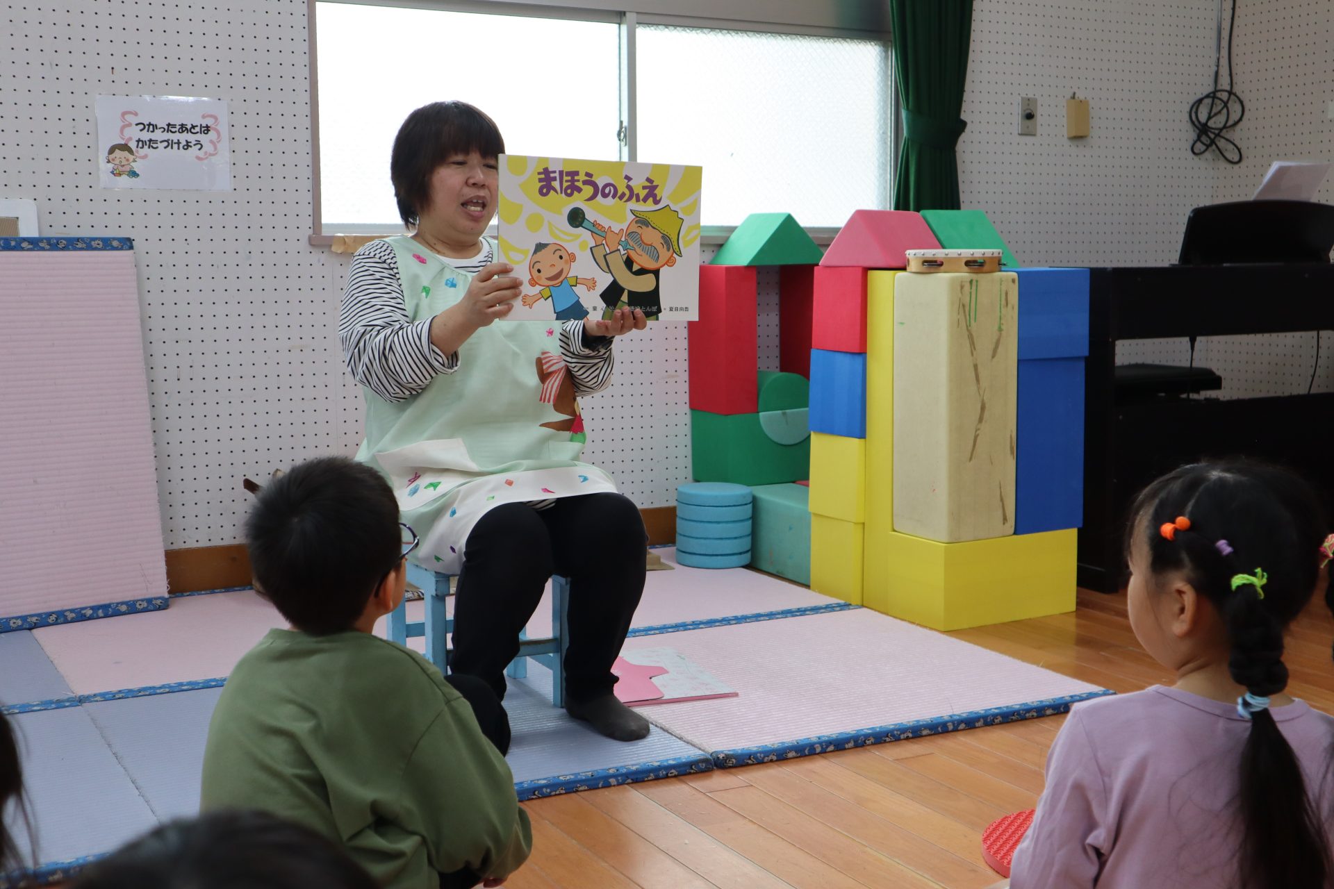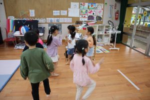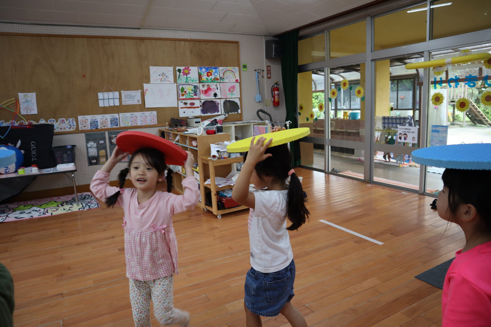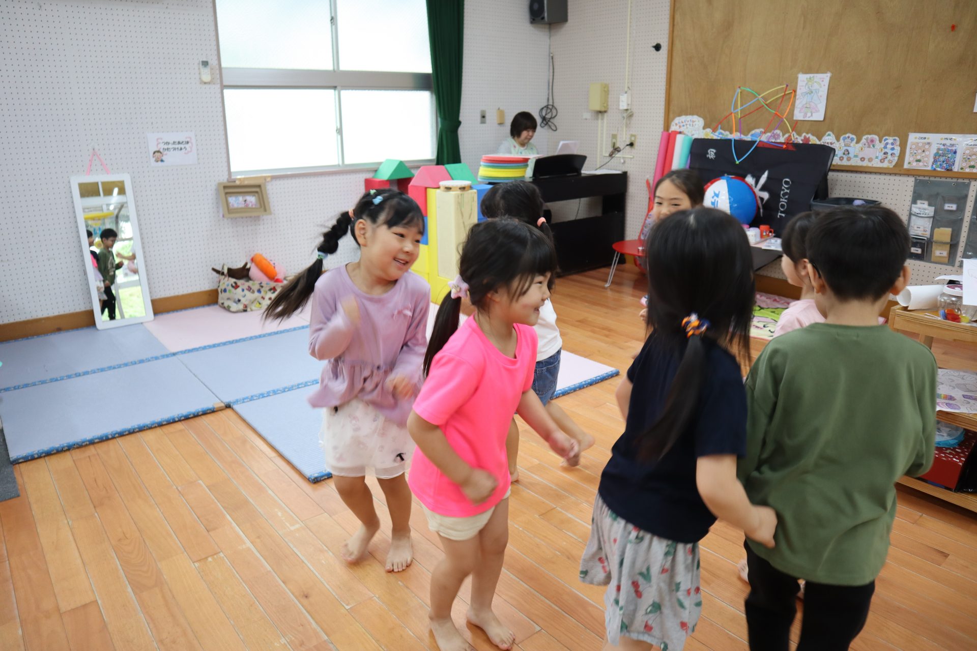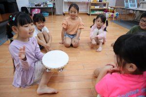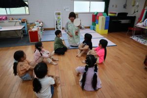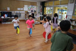 ♬リトミック♬ リトミックの始まり~✨リズムよくタンバリンを叩く👏 「○○ちゃ~ん」「はぁ~い」 「さんぽ」「ちょうちょ」の歌に合わせて体を動かすよ~ そして休憩(笑) 物を使っての遊びもするよ!頭にのせてゆっくり歩く・・・ 跳んだり歩いたり♬音楽に合わせてたくさん体を動かして楽しみました♬