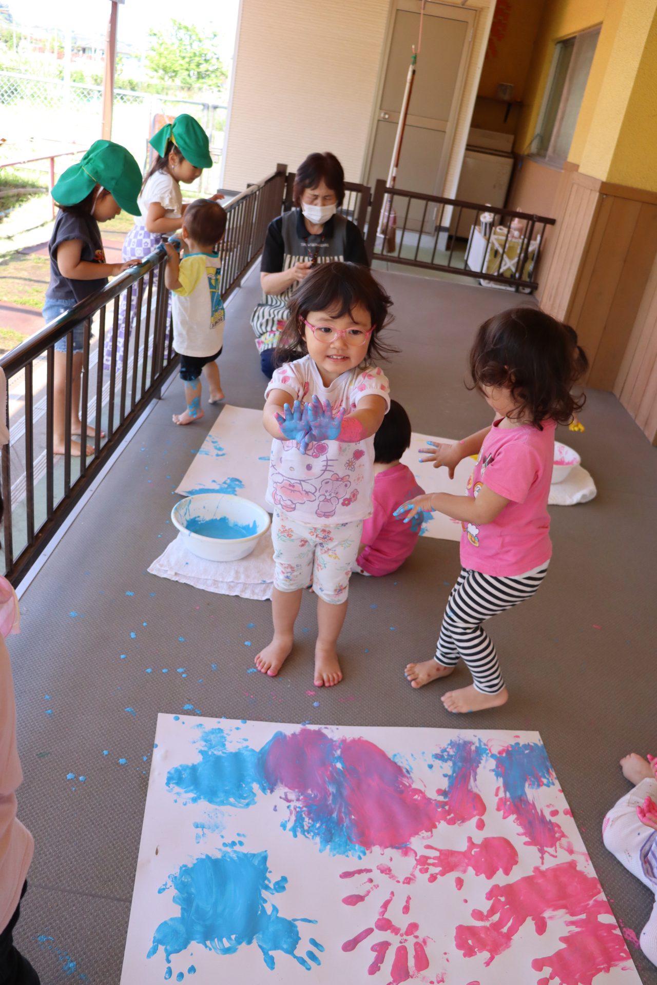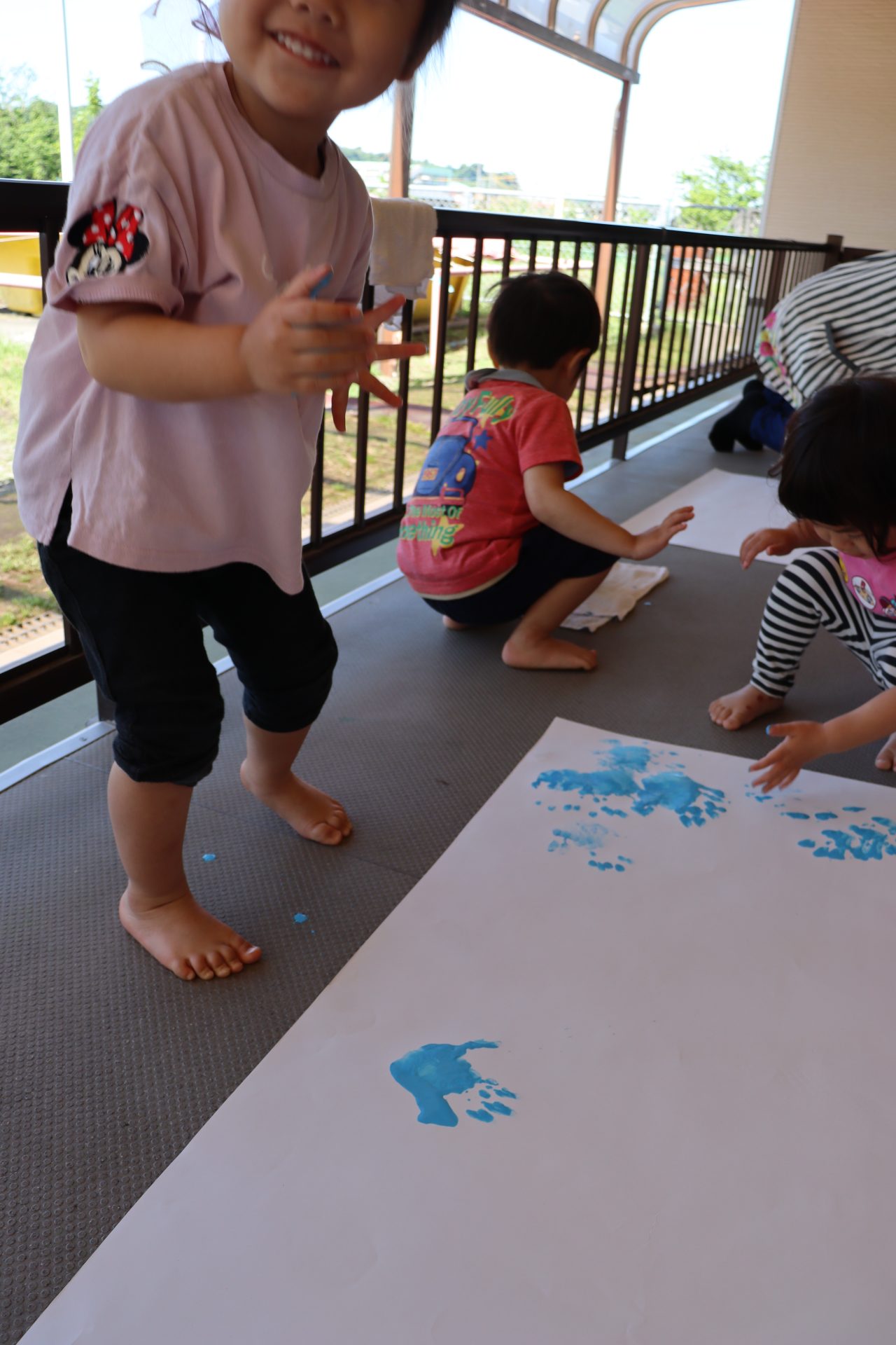 思いっきり楽しんで🌈🎵 絵具を使って感触遊びを楽しみました☺ 「ピンクがいいいな」「みずいろにしようかな」 みんなのワクワクが止まりません✨ ぬるぬる・・・ペタペタ・・・🎵 みんなとっても楽しんでいましたよ~💕 明日も楽しもうね~🎵