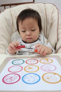 これ…、なぁ~に??(すみれ組) 初めての素材…クレヨン…🖍🖍 ラックに座って…手に取っているSくん…😄😄 クレヨンを見つめる目が、とーーっても真剣…👀👀 さてさて…Rくんの反応は…😁 “これ…なぁーーにっ!!”とびっくり顔…😲(^^♪ 恐る恐る…手に持ってみたら、なんだかいい感じだよ…🎵 クレヨンを手にしているだけで、なんだか…嬉しい気分…✨✨ 足をばたつかせてしまう位…😁😁 二人とも描く事よりも、クレヨンを手にした事に大満足したみたい…(^^♪ 今度は、大きな紙に描いてみようかなぁーーっ…💕🥰