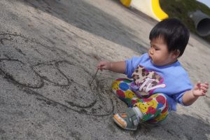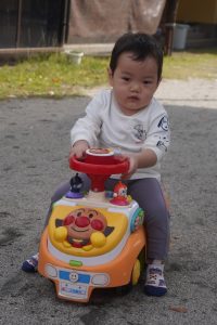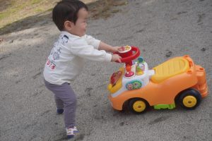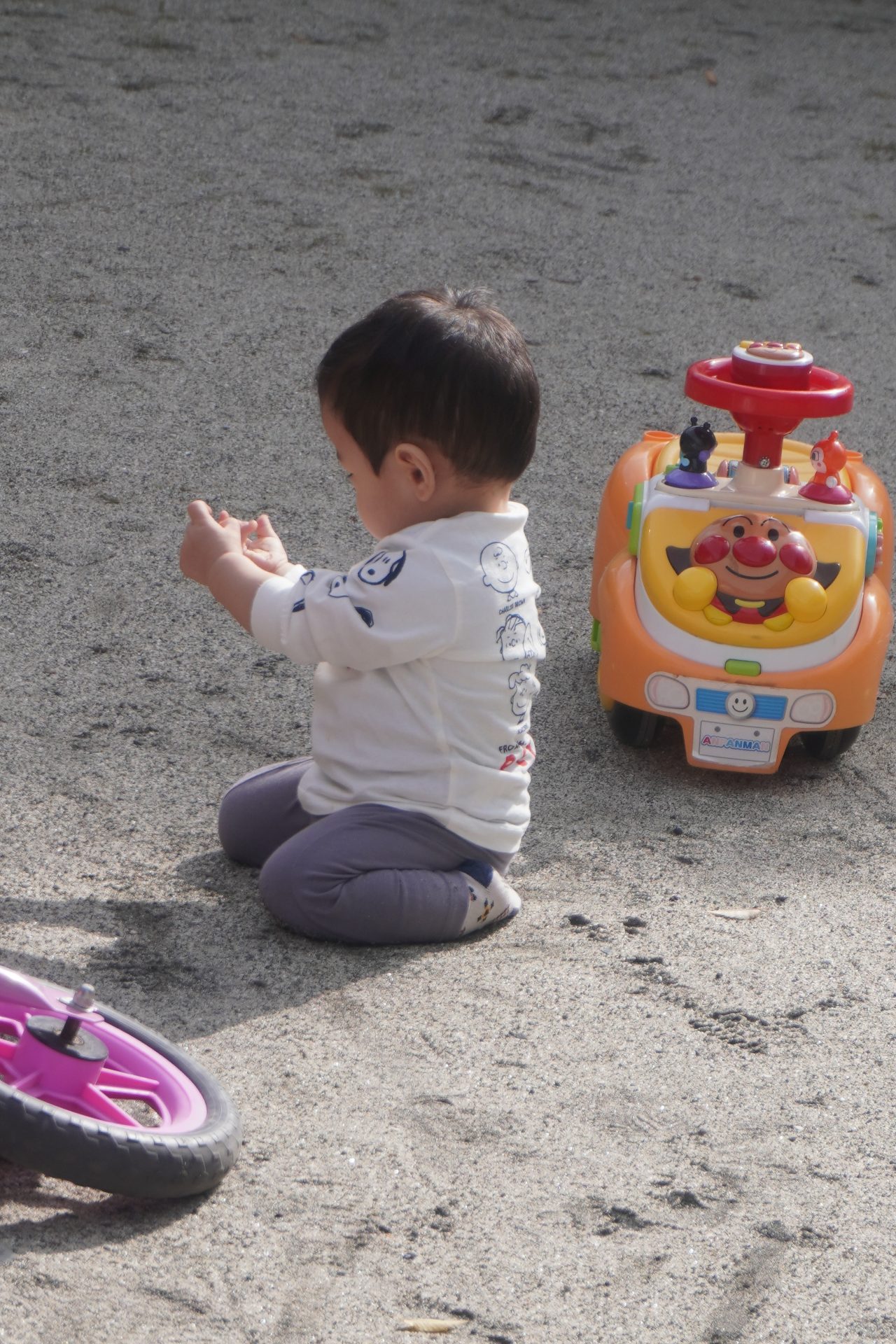 アンパンマンの車を押して遊んだり、砂に触ってみたり…