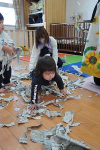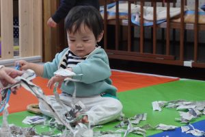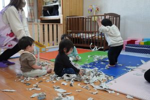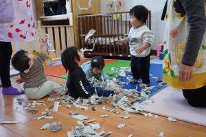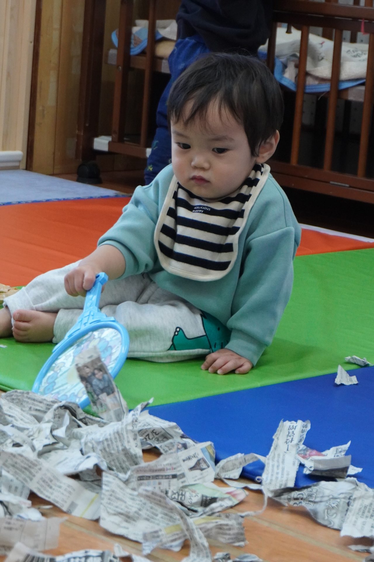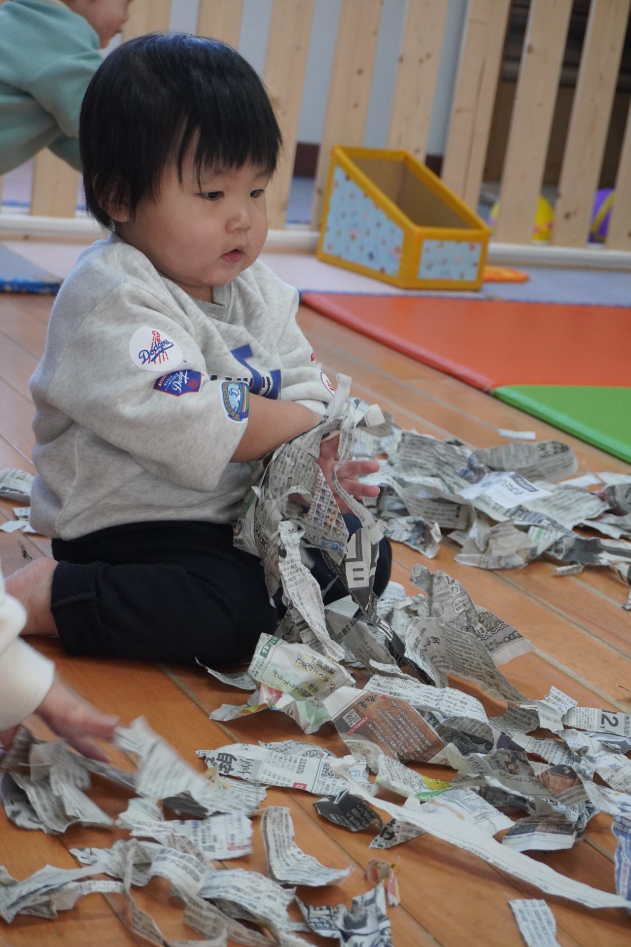 びりびり――っ!!新聞紙で遊ぼう💕🥰(すみれ組) 今日は“園庭で遊ぼう…”と思っていたら、風が冷たかったので お部屋遊びでした…🌝 新聞紙が登場すると…🎵 破った新聞紙を手にしたり、感触を楽しんだり、投げてみたり…と それぞれの楽しみ方…✨✨ 破った新聞紙が一杯になったので、空から新聞紙の雪が…❄⛄❄ 「うわーーっ!!」と大きな声を上げたり、 保育者の真似をして、自ら新聞紙を投げる姿も…🥰 新聞紙遊びで盛り上がっているお友達を、 ベッド越しに眺めているKくんでした…💕🥰