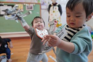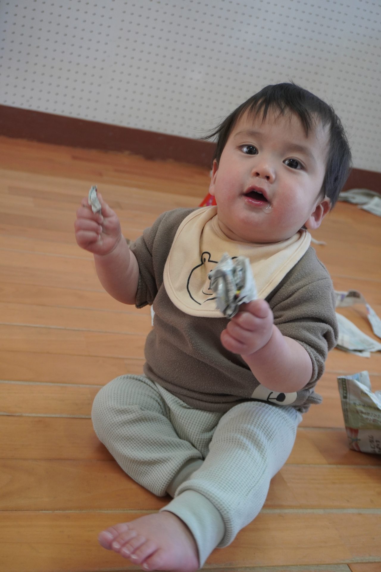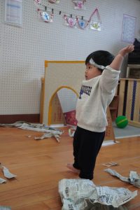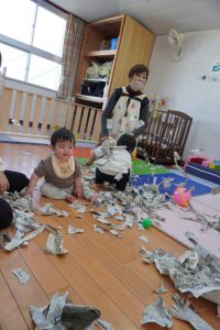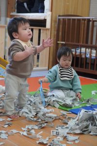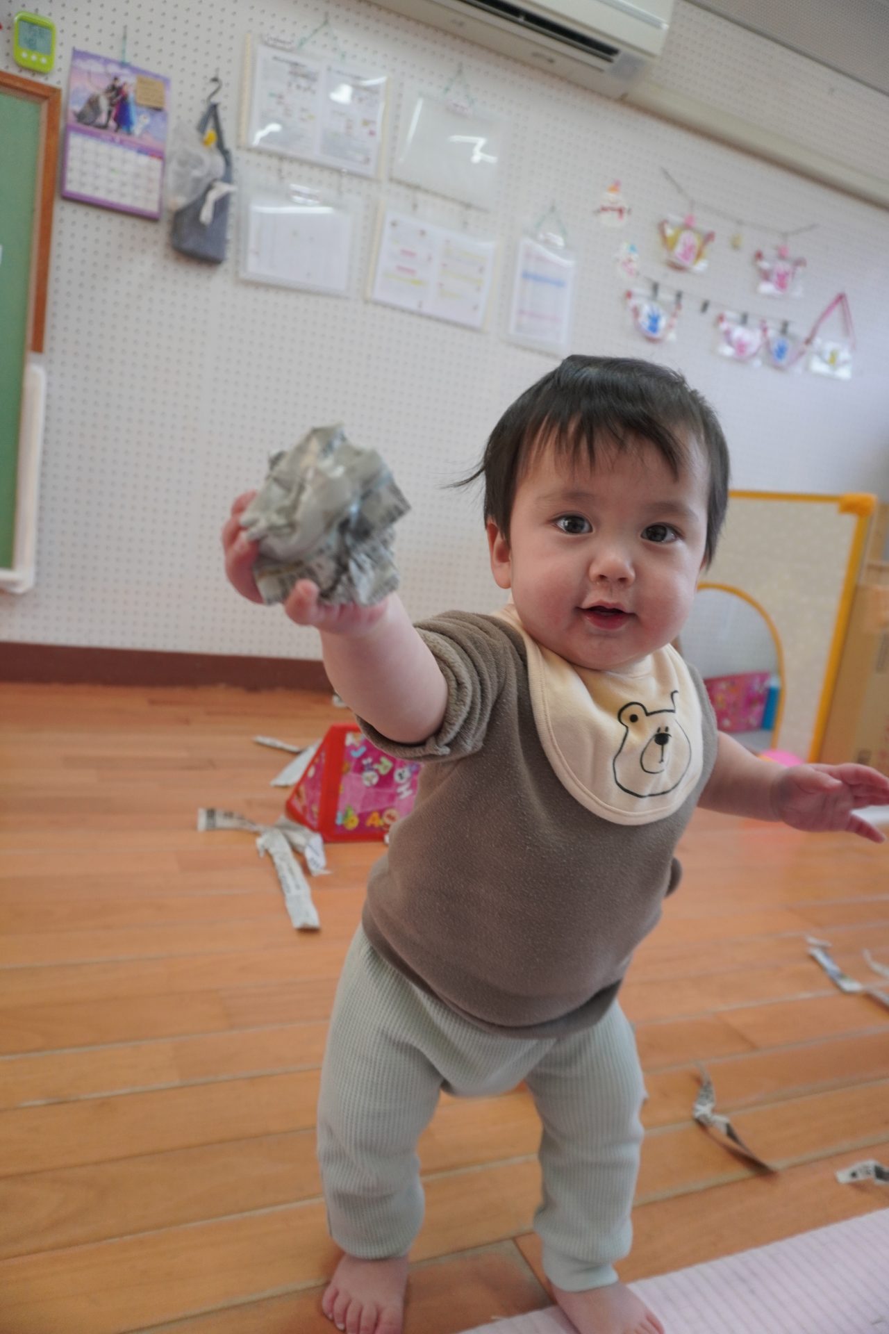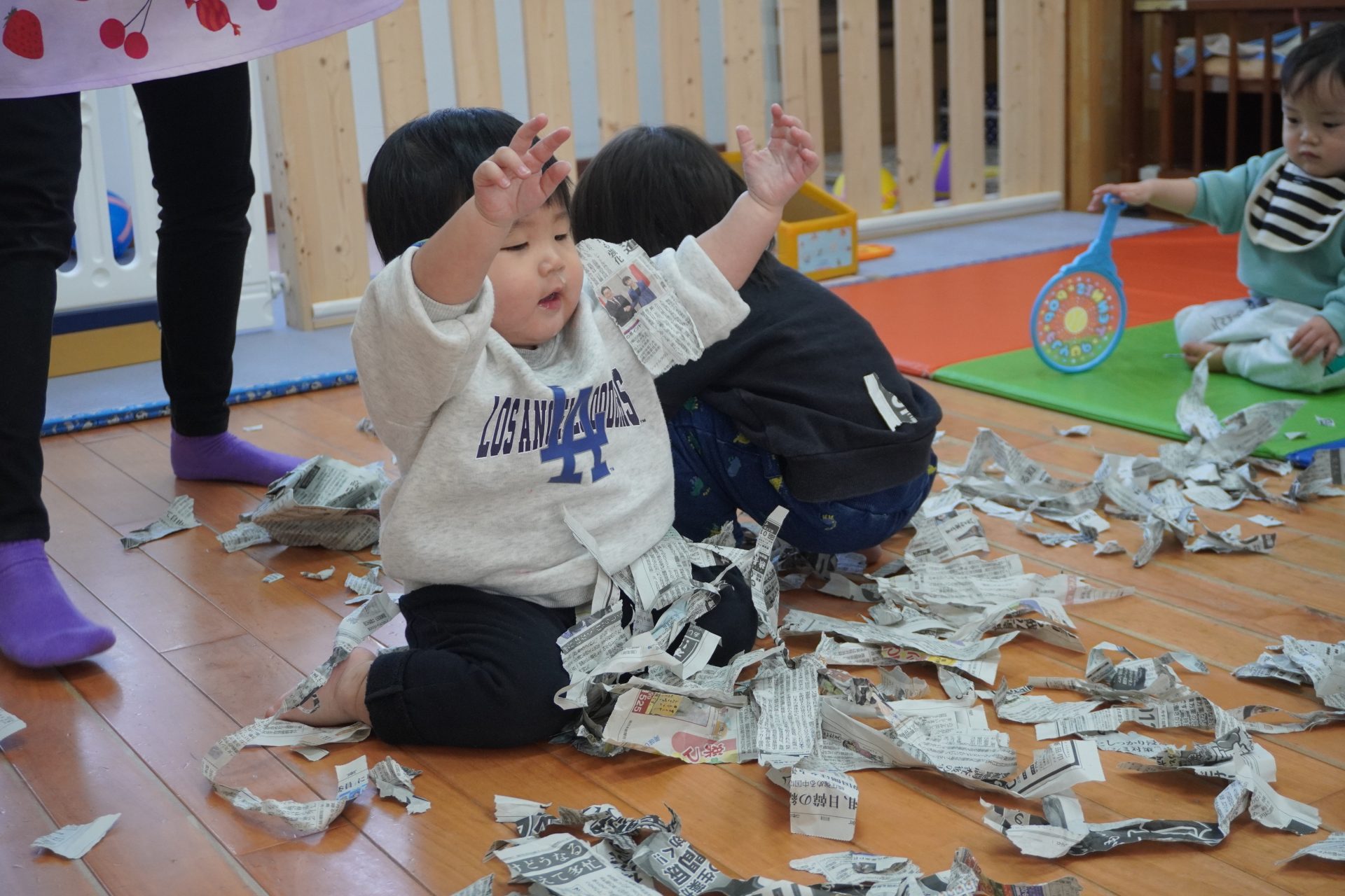 びりびり――っ!!新聞紙で遊ぼう💕🥰(すみれ組) 今日は“園庭で遊ぼう…”と思っていたら、風が冷たかったので お部屋遊びでした…🌝 新聞紙が登場すると…🎵 破った新聞紙を手にしたり、感触を楽しんだり、投げてみたり…と それぞれの楽しみ方…✨✨ 破った新聞紙が一杯になったので、空から新聞紙の雪が…❄⛄❄ 「うわーーっ!!」と大きな声を上げたり、 保育者の真似をして、自ら新聞紙を投げる姿も…🥰 新聞紙遊びで盛り上がっているお友達を、 ベッド越しに眺めているKくんでした…💕🥰
