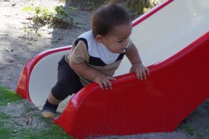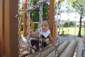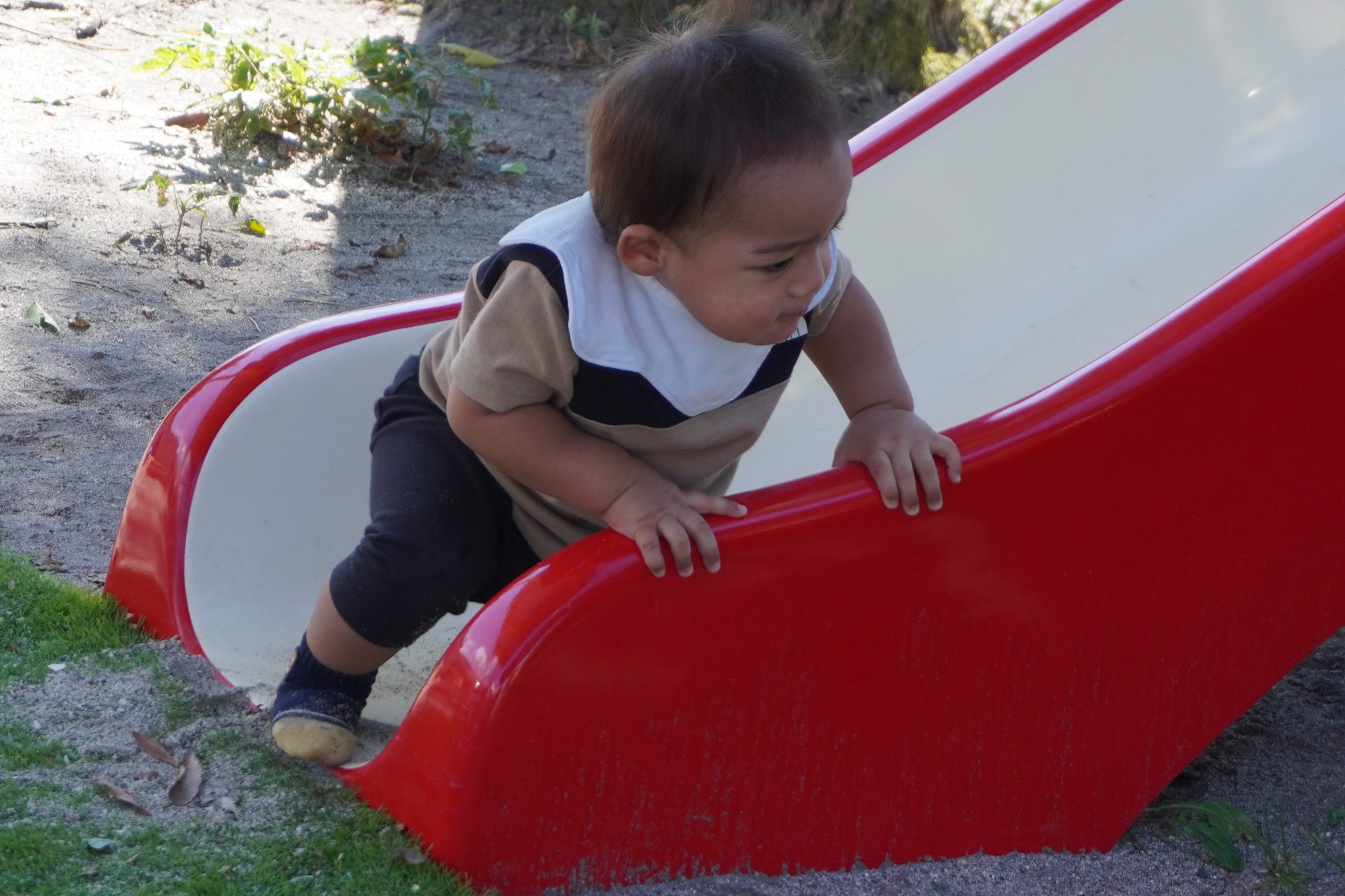 滑り台に登ったり、揺れる丸太に乗ってみたり…と