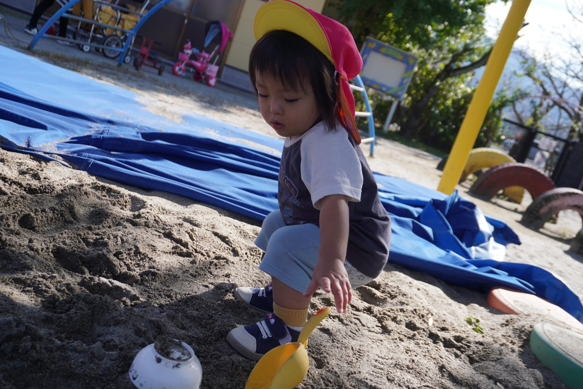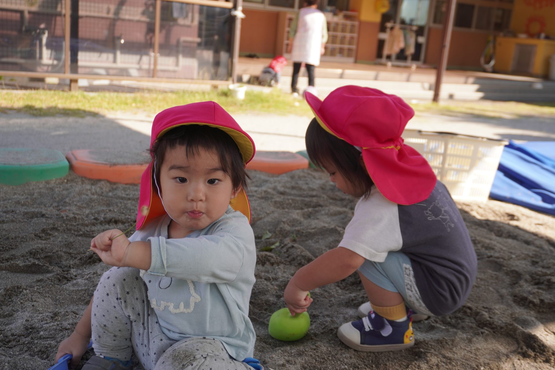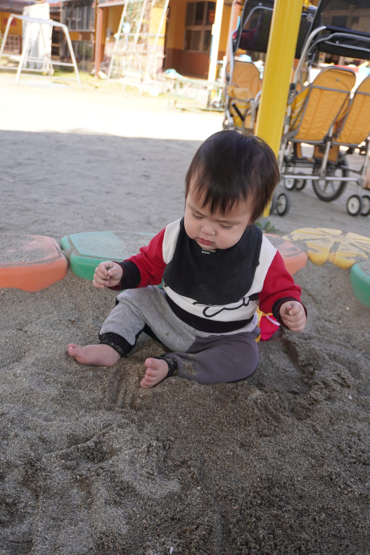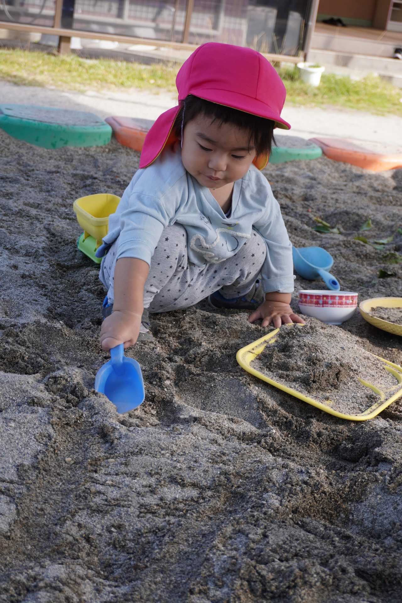 今日もいい天気🌞お外に行こう…✨✨(すみれ組) 11月に入って秋めいてきましたが…、今日もとーーっても良い天気🌞 大好きな💖園庭に遊びに行こう😄 今日も人気の砂場で遊ぼう…🎵 砂場で遊んでいると心地よい風が…とっても気持ち良く遊べます…😄😄 砂場★デビューした子ども達も砂場がお気に入りに…💕💕 ザラザラとした砂の感触が、楽しくて★面白くて…たまらないみたい✨✨ Rくんは、歩く事が楽しくて…どんどん進んでいきます👣👣 気持のよい季節…一杯お外遊びを楽しんでいきたいです💖