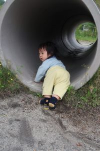 園庭で遊んでいたRくん…(^^♪ ぼた山の土管のトンネルに興味津々の様子…😁