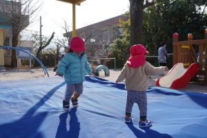SくんとKくんは、砂場のシートをトランポリンに見立てて、