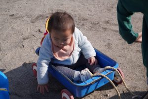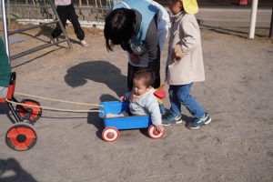 Yくんを見付けたお兄ちゃん(^^♪トロッコに乗せて、園庭を仲良くドライブだよ😄