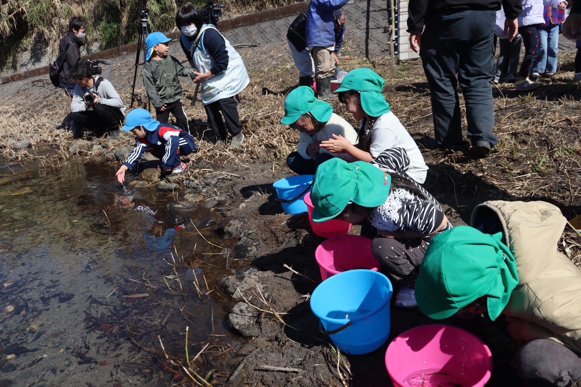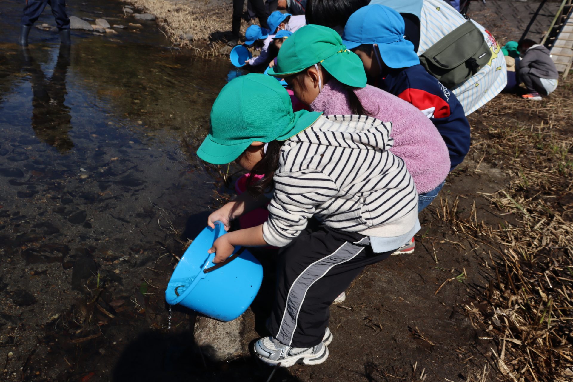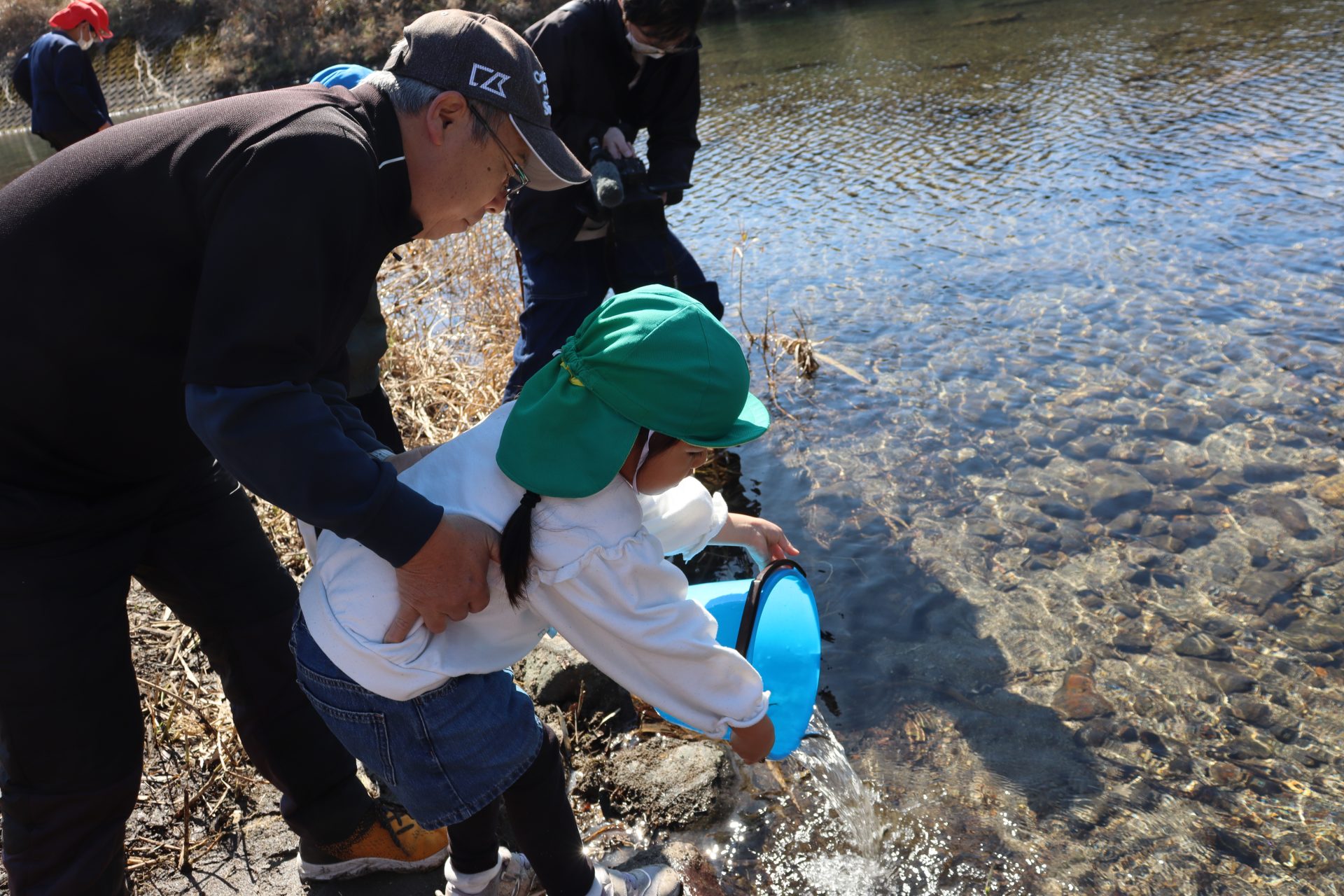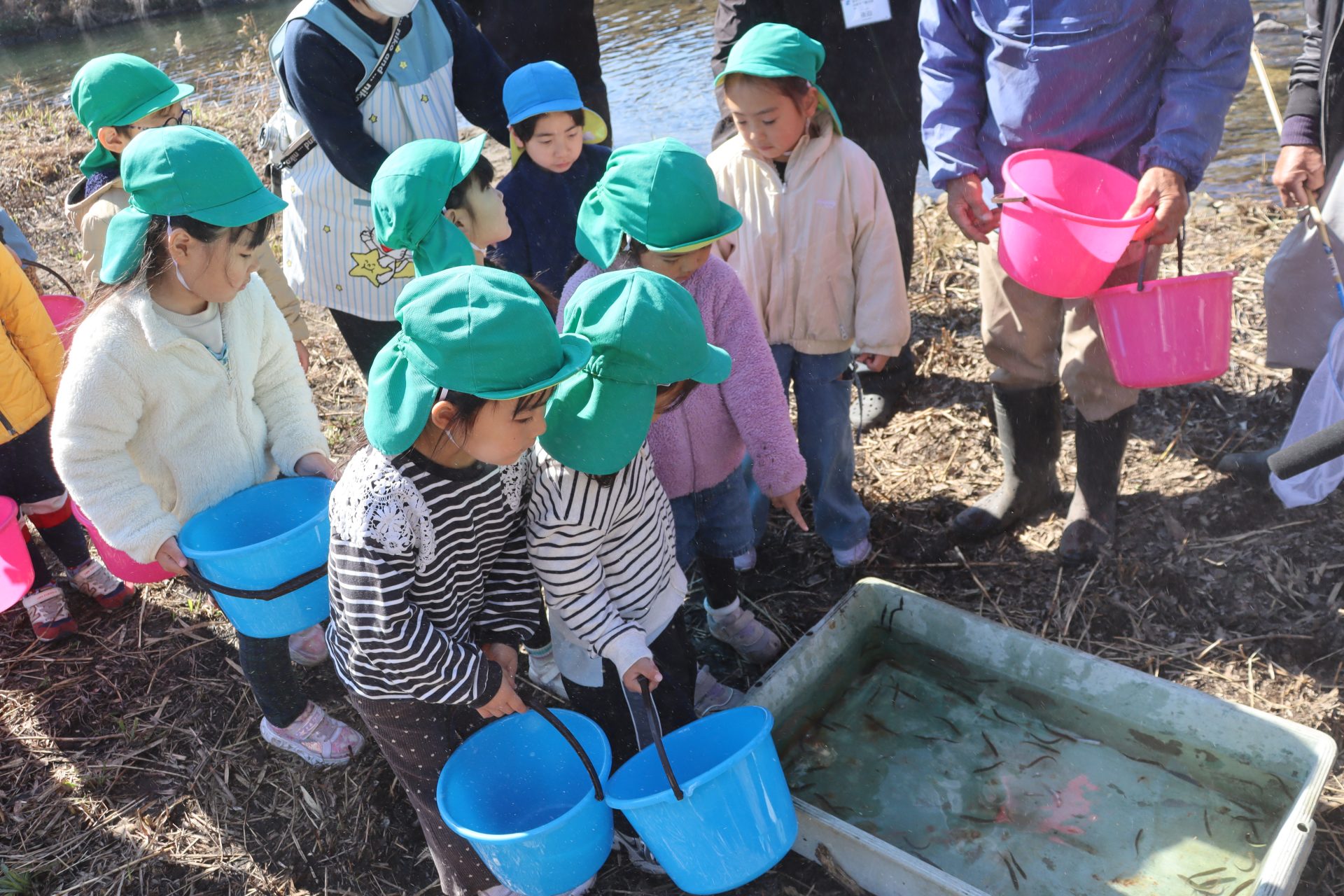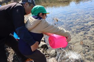 放流の後「アユ思ったより小さかったね」「アユの色が黒かったね」と話をしました(*’▽’) 最初は「魚怖い」と言っていたお友達もアユを見ると興味津々に✨バケツにアユを入れてもらう時は目がキラキラしていました(^^)v