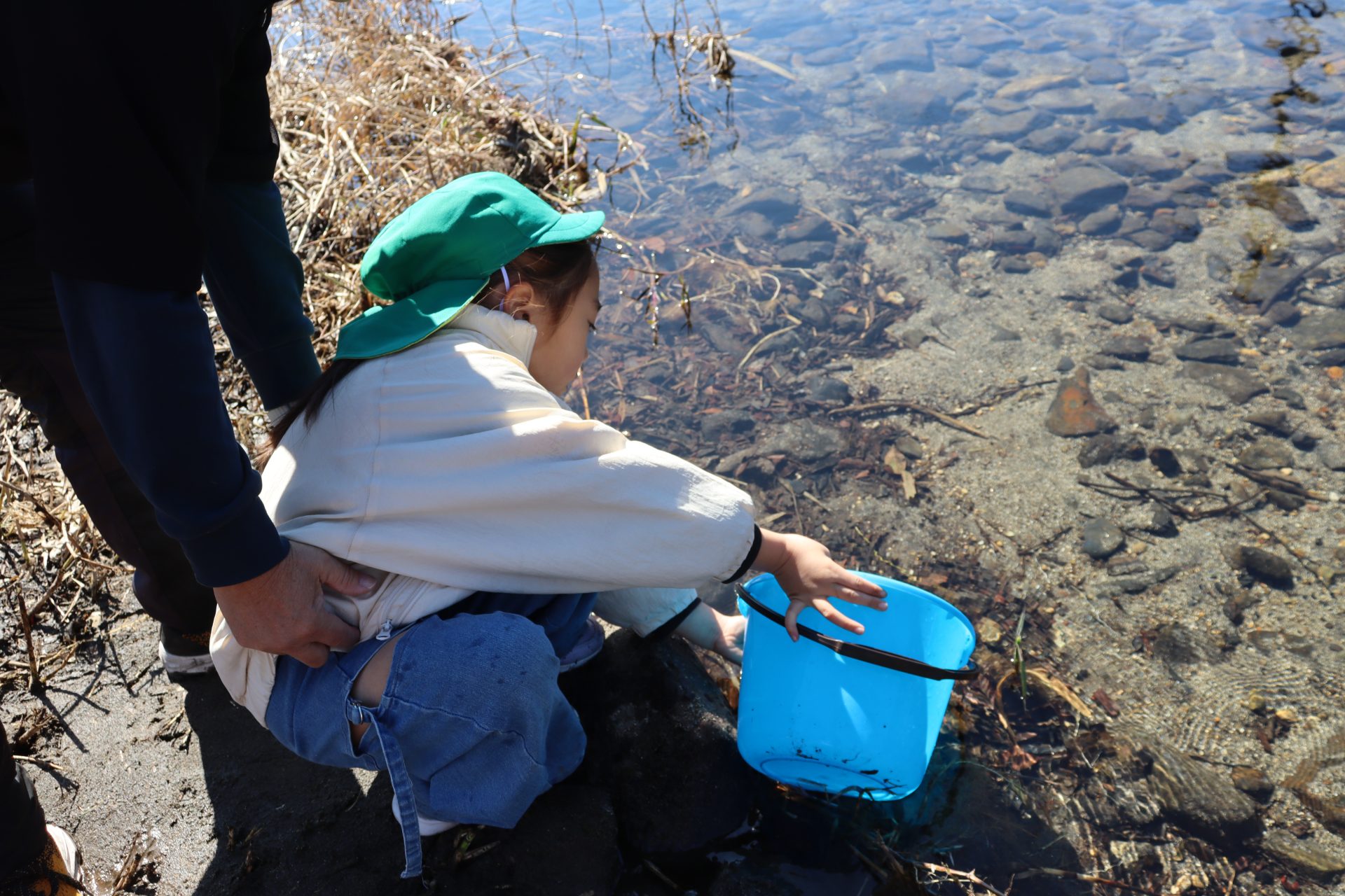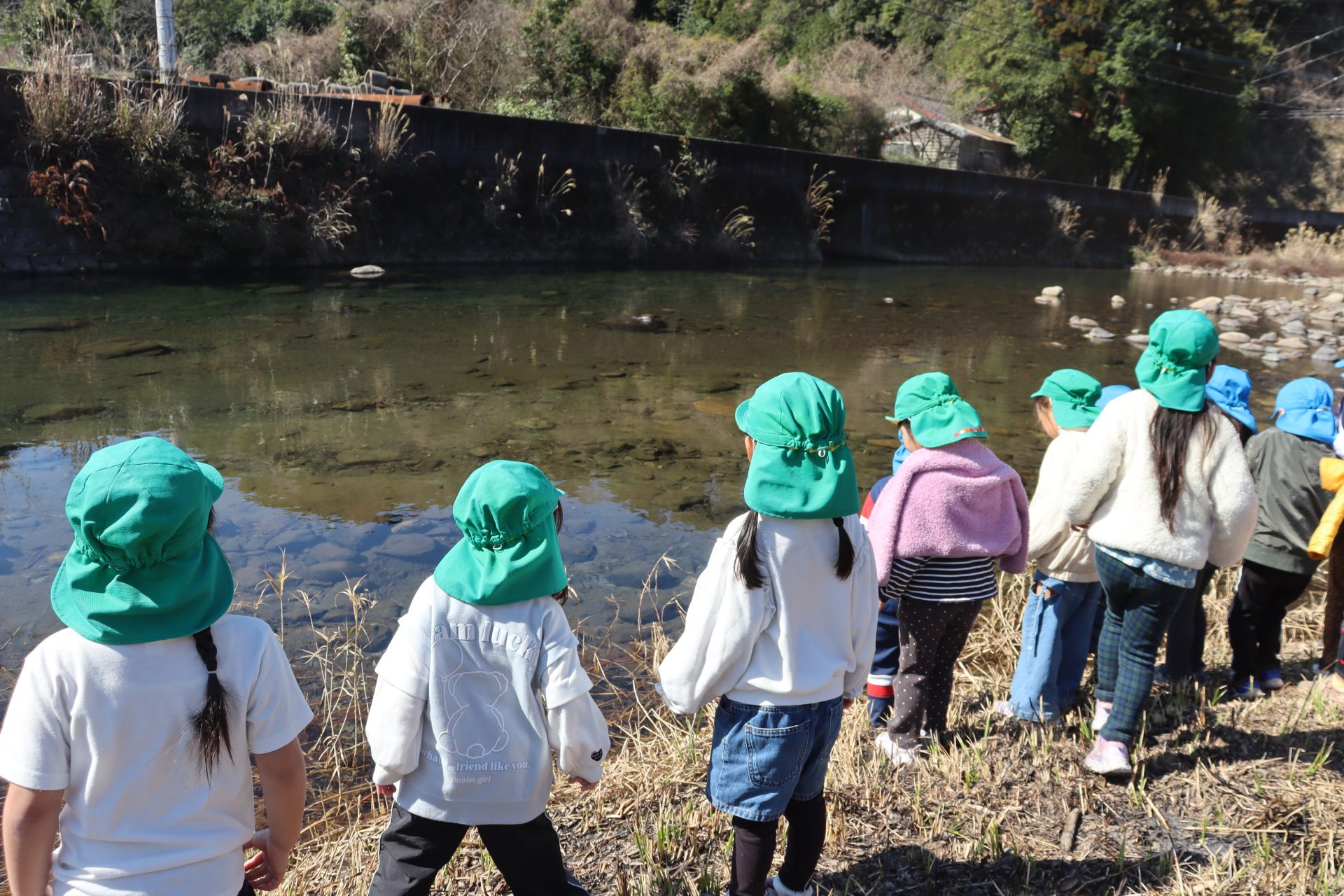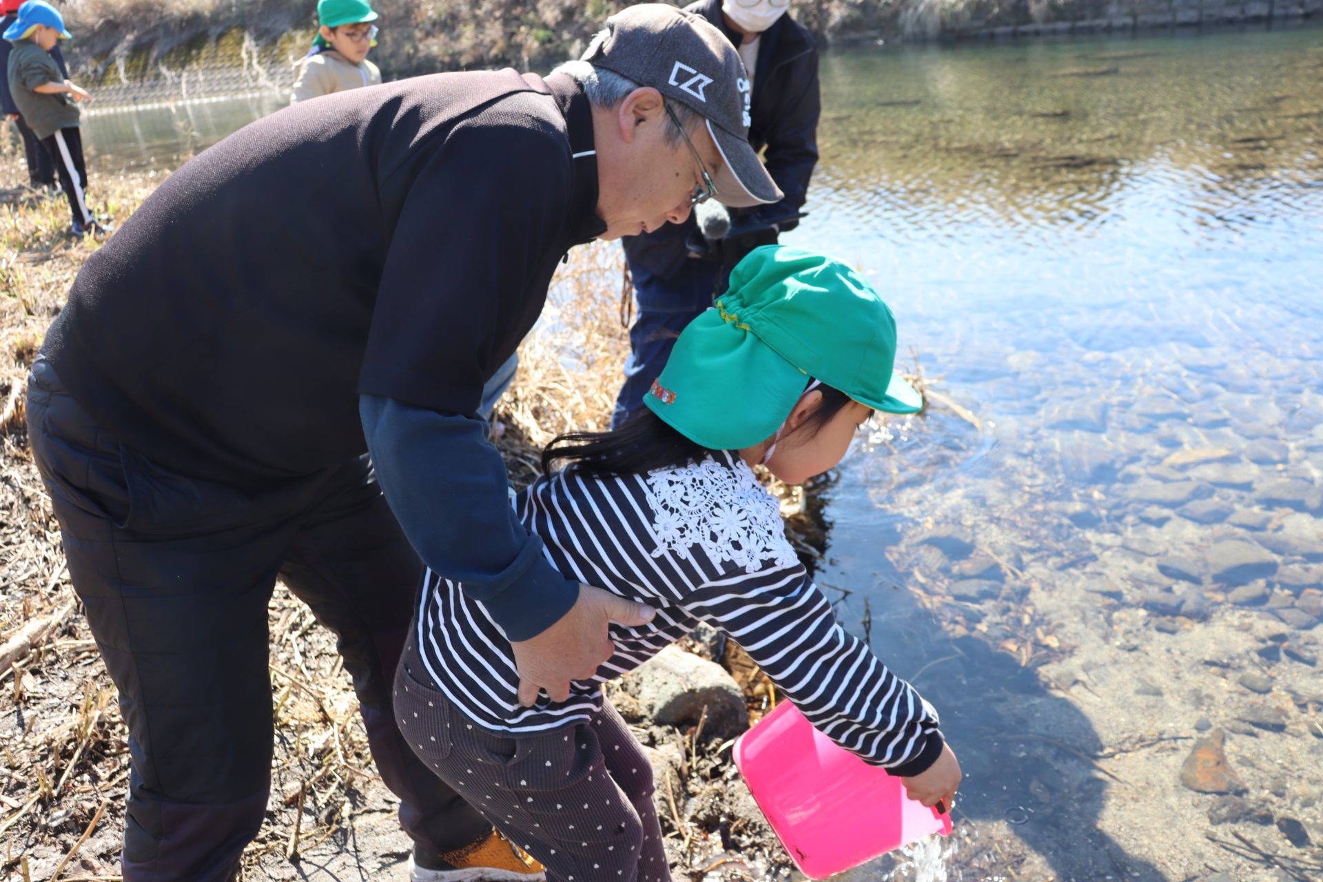 放流の後「アユ思ったより小さかったね」「アユの色が黒かったね」と話をしました(*’▽’) 最初は「魚怖い」と言っていたお友達もアユを見ると興味津々に✨バケツにアユを入れてもらう時は目がキラキラしていました(^^)v