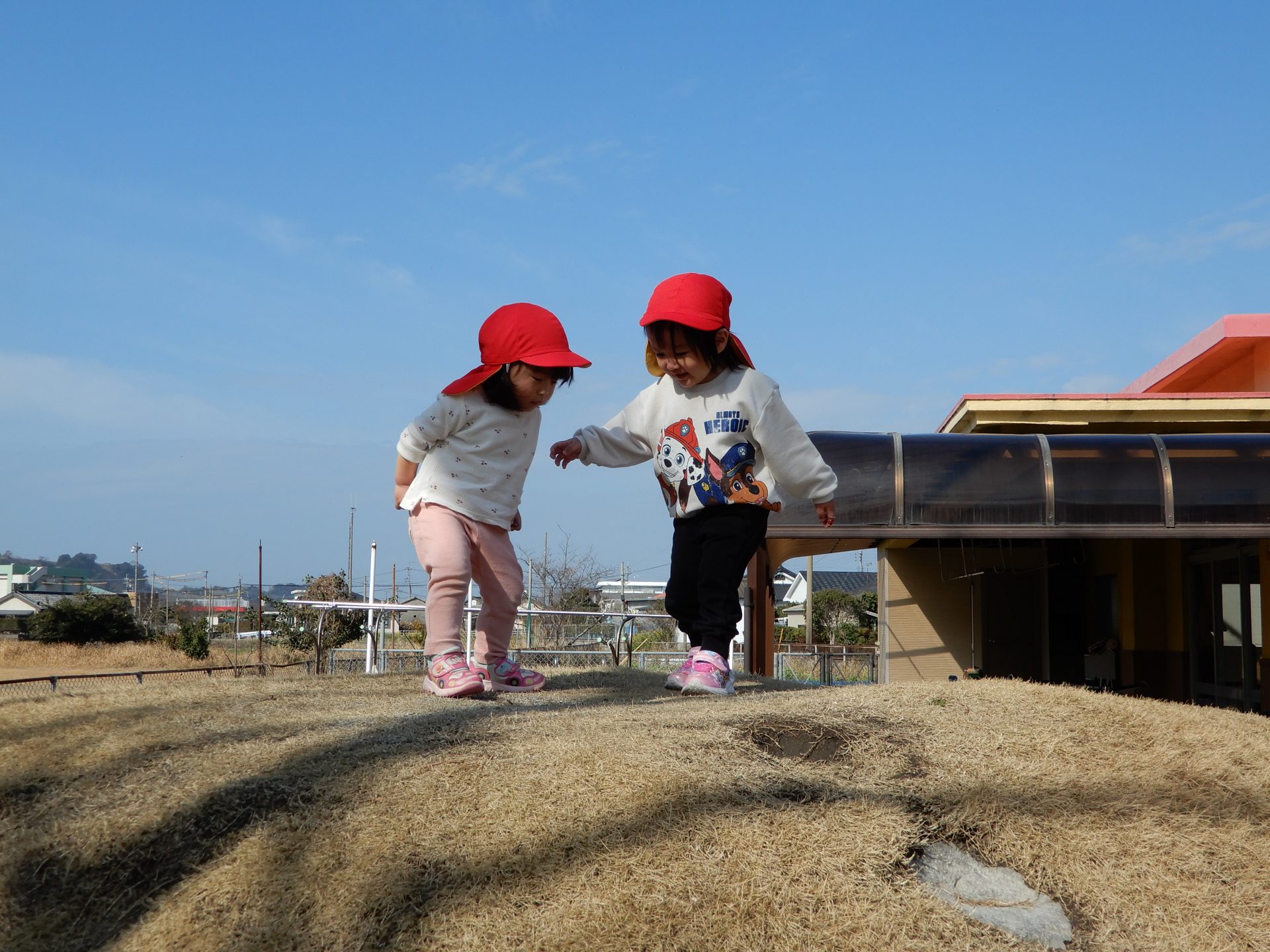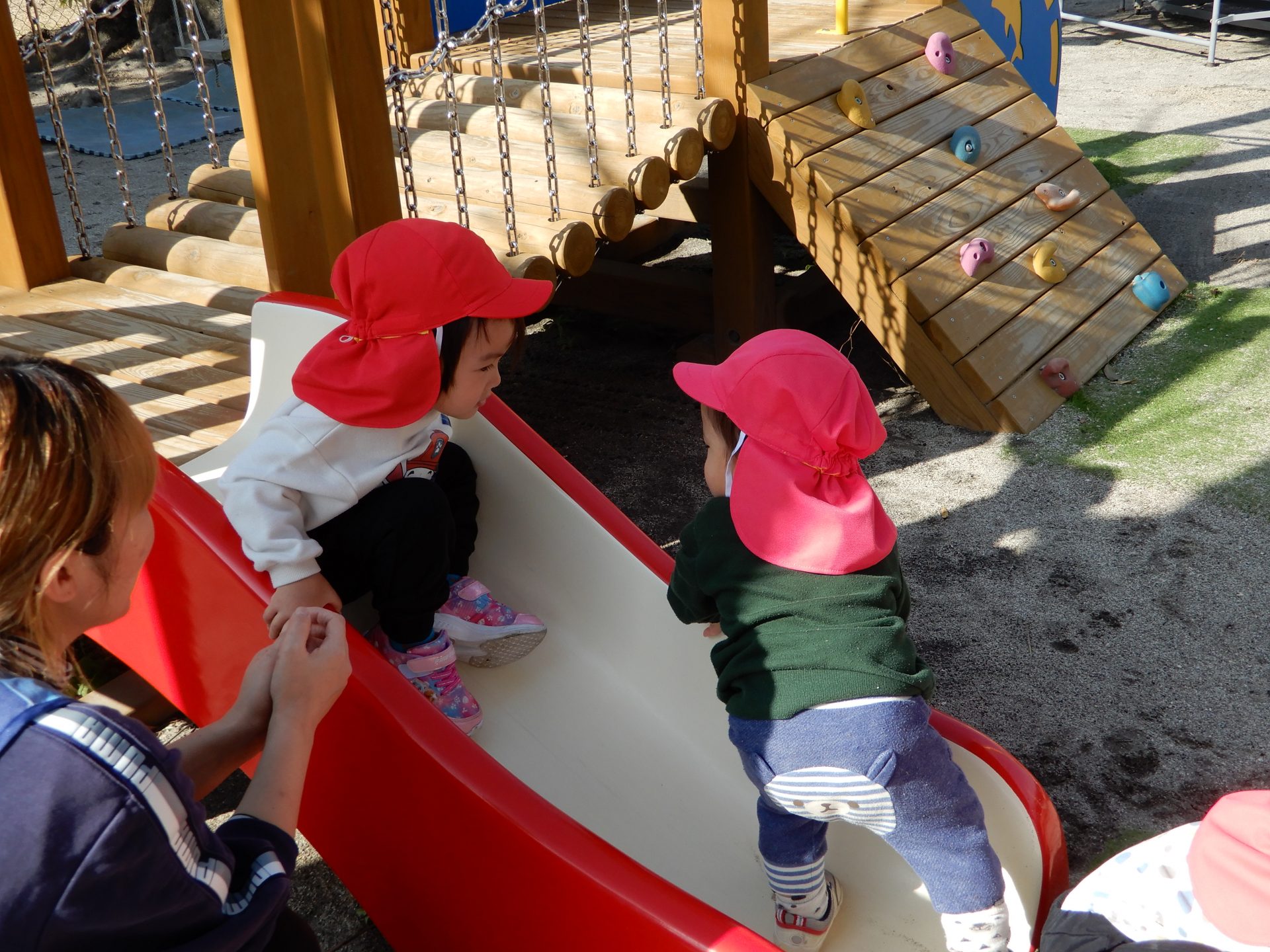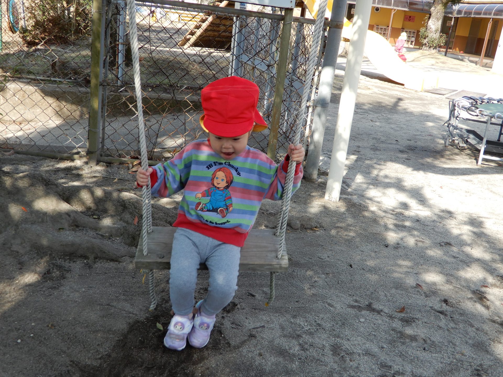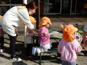 「みんなお外行く?」と聞くと「は~い」と元気いっぱいの声が返ってきて、「ジャンバーいる?」とたずねる声も・・・「今日は暖かいからいらないよ」と答えるとすぐに靴下を履いて、帽子をかぶって準備をしていました(^▽^)/ 関心ですね😊