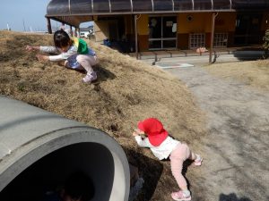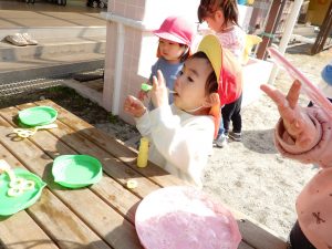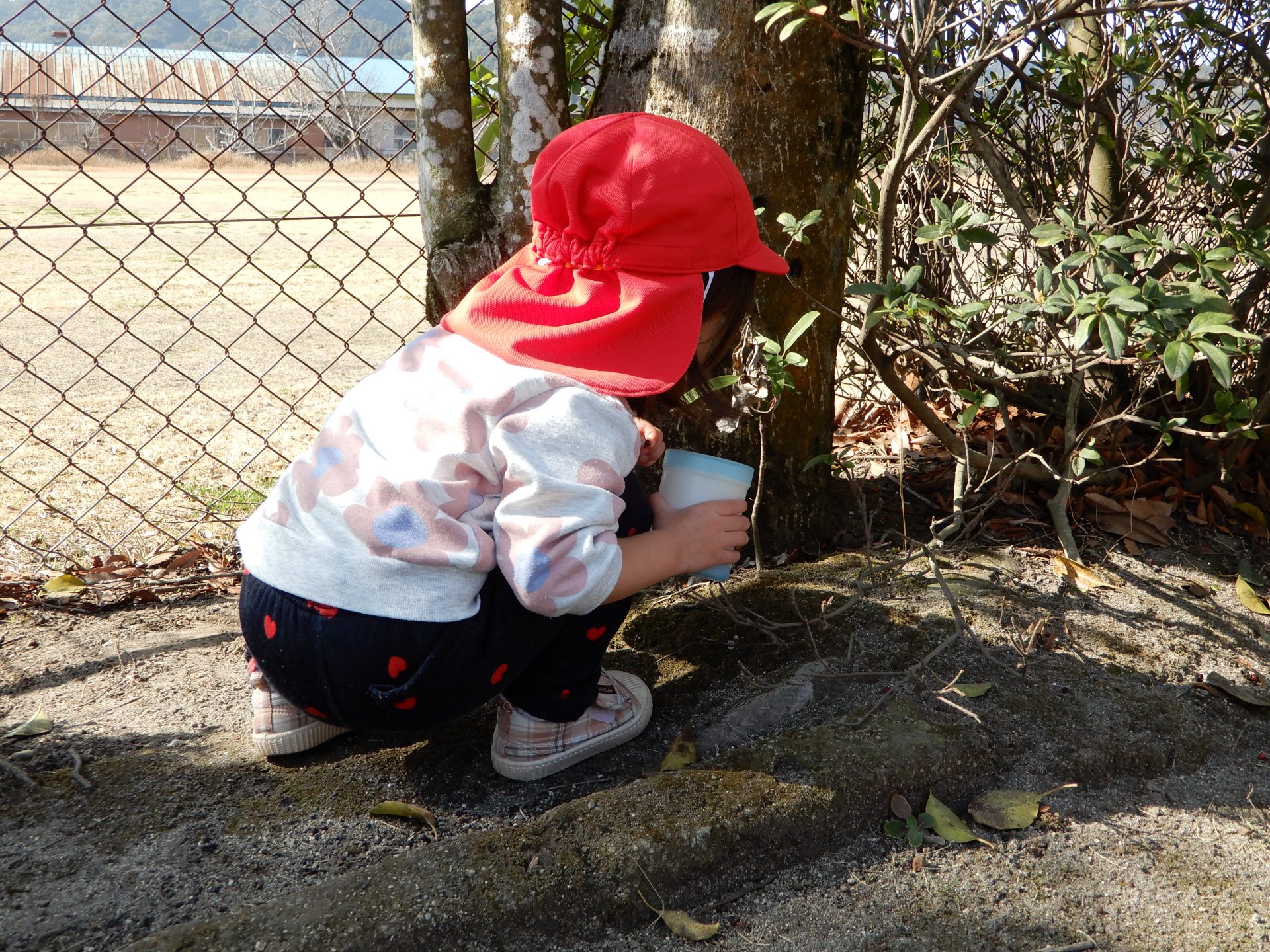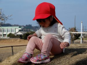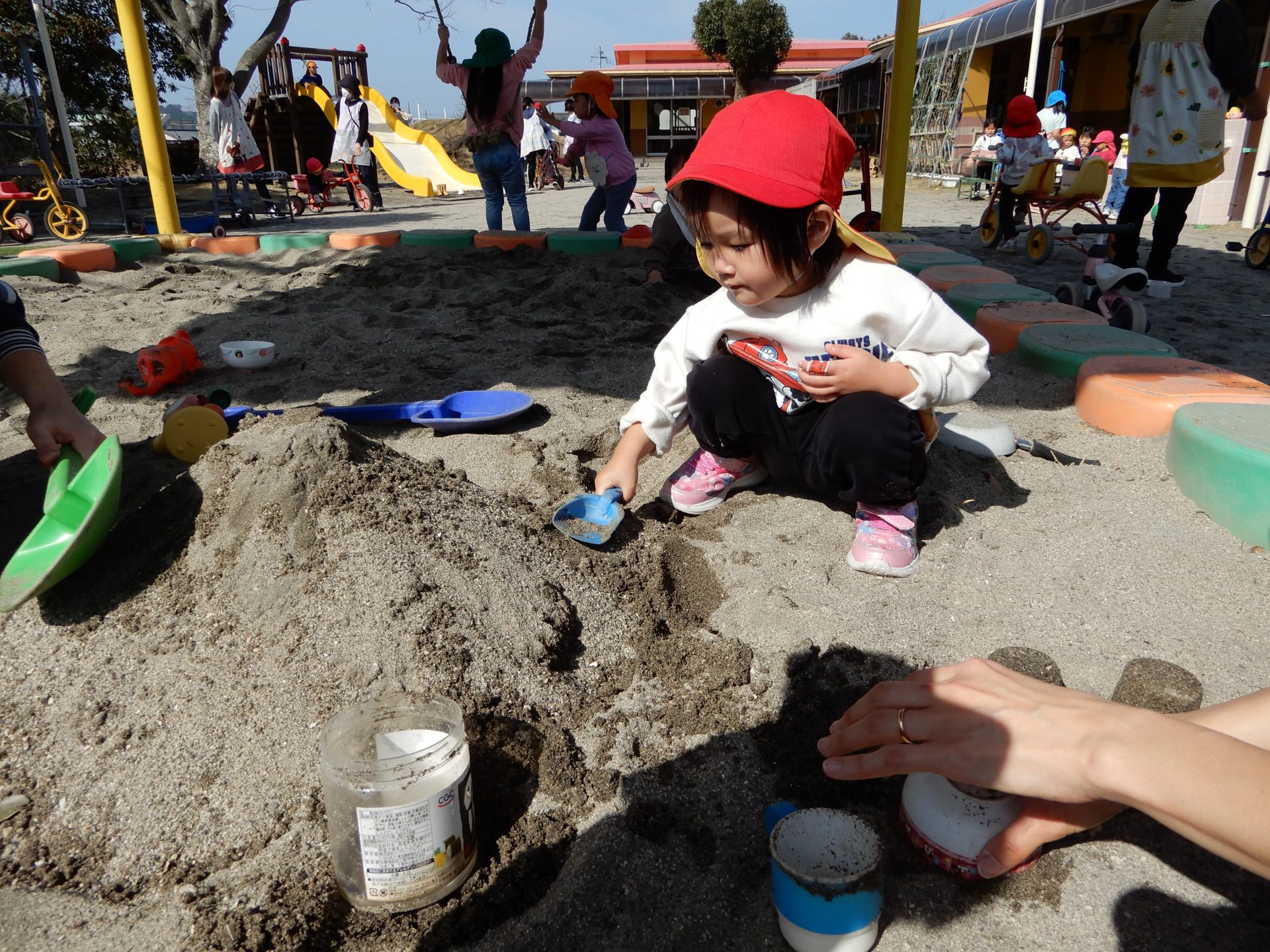 「みんなお外行く?」と聞くと「は~い」と元気いっぱいの声が返ってきて、「ジャンバーいる?」とたずねる声も・・・「今日は暖かいからいらないよ」と答えるとすぐに靴下を履いて、帽子をかぶって準備をしていました(^▽^)/ 関心ですね😊