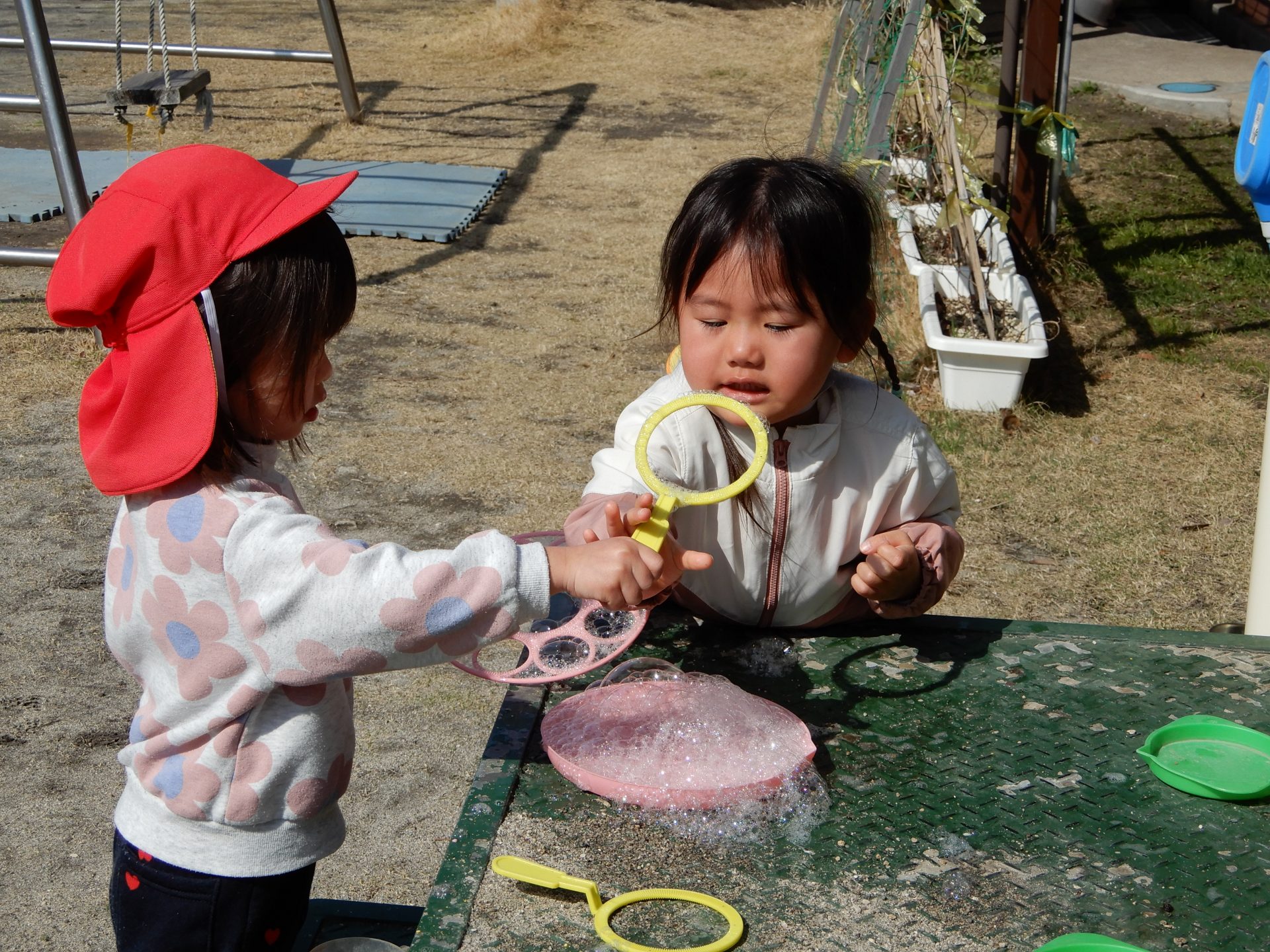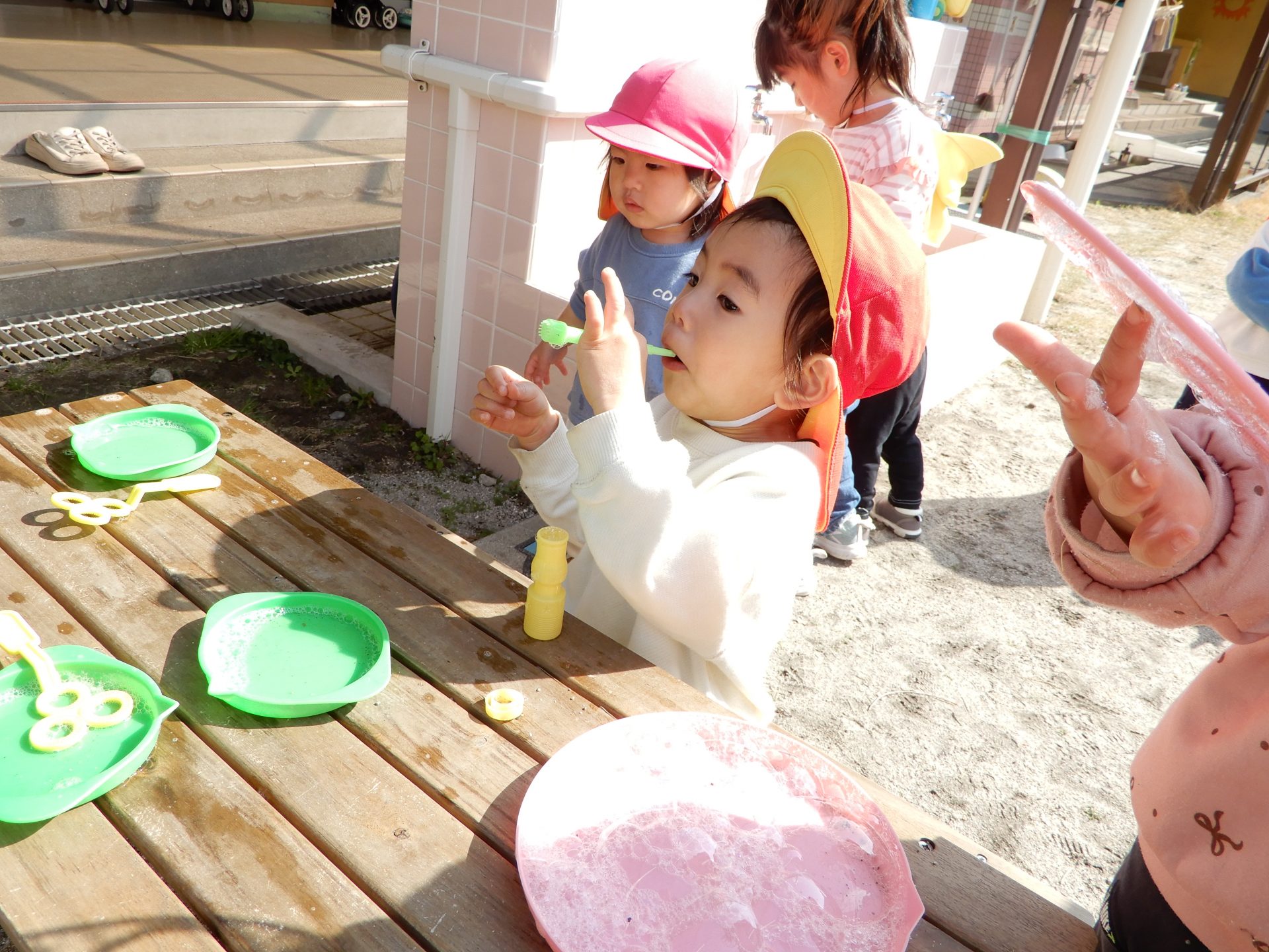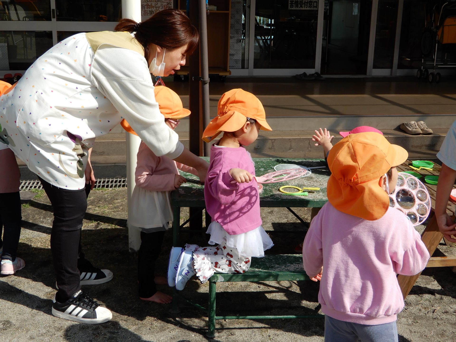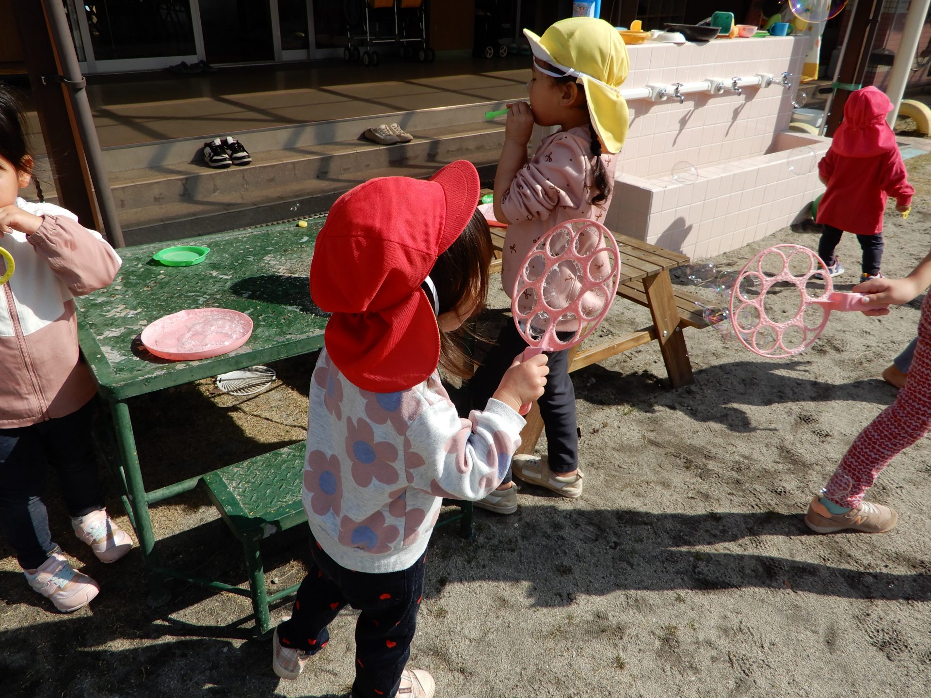 しゃぼん玉遊びにも夢中です⭐2歳児さんも興味深々で遊んでいます✨