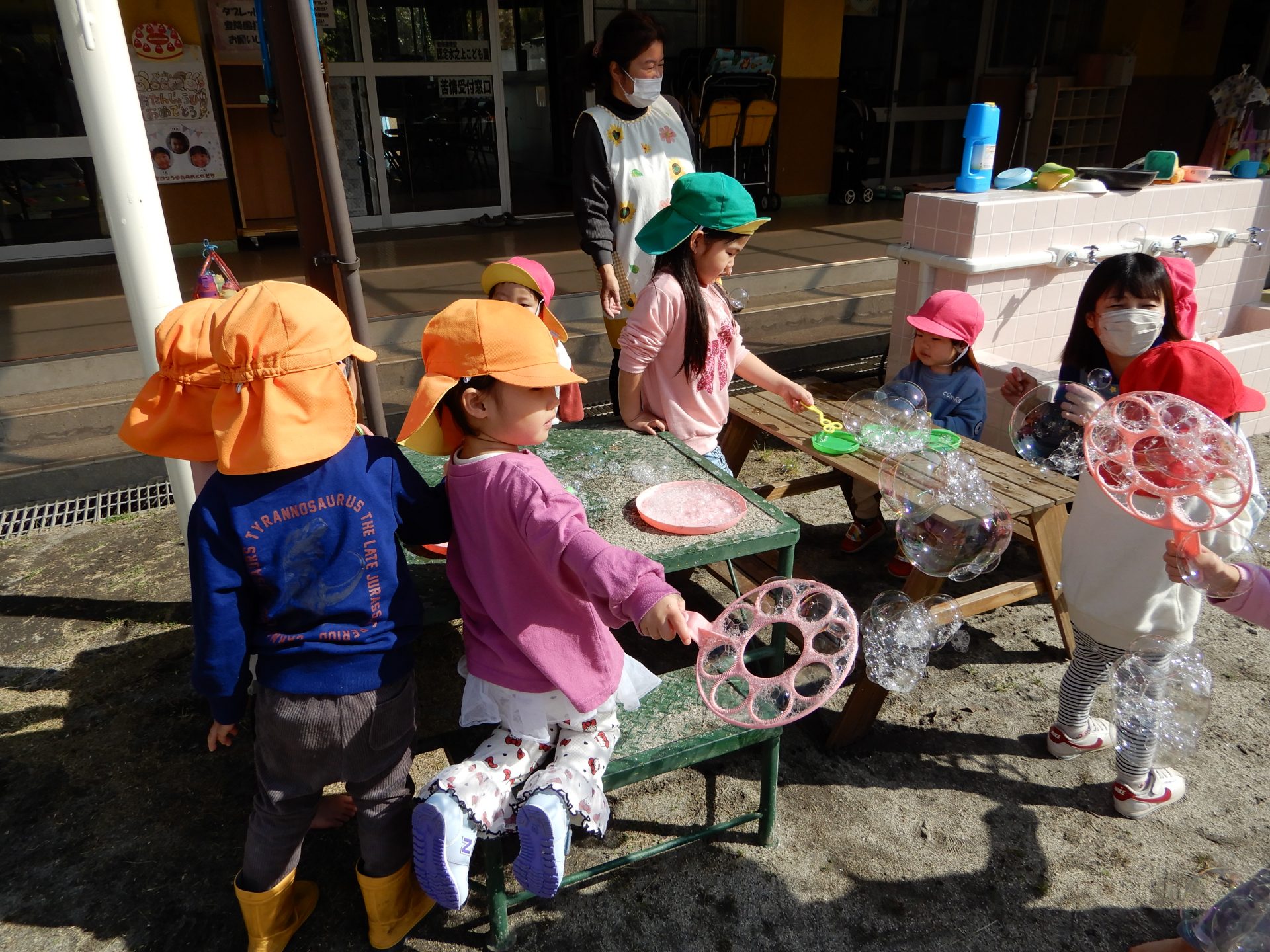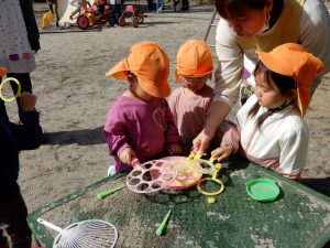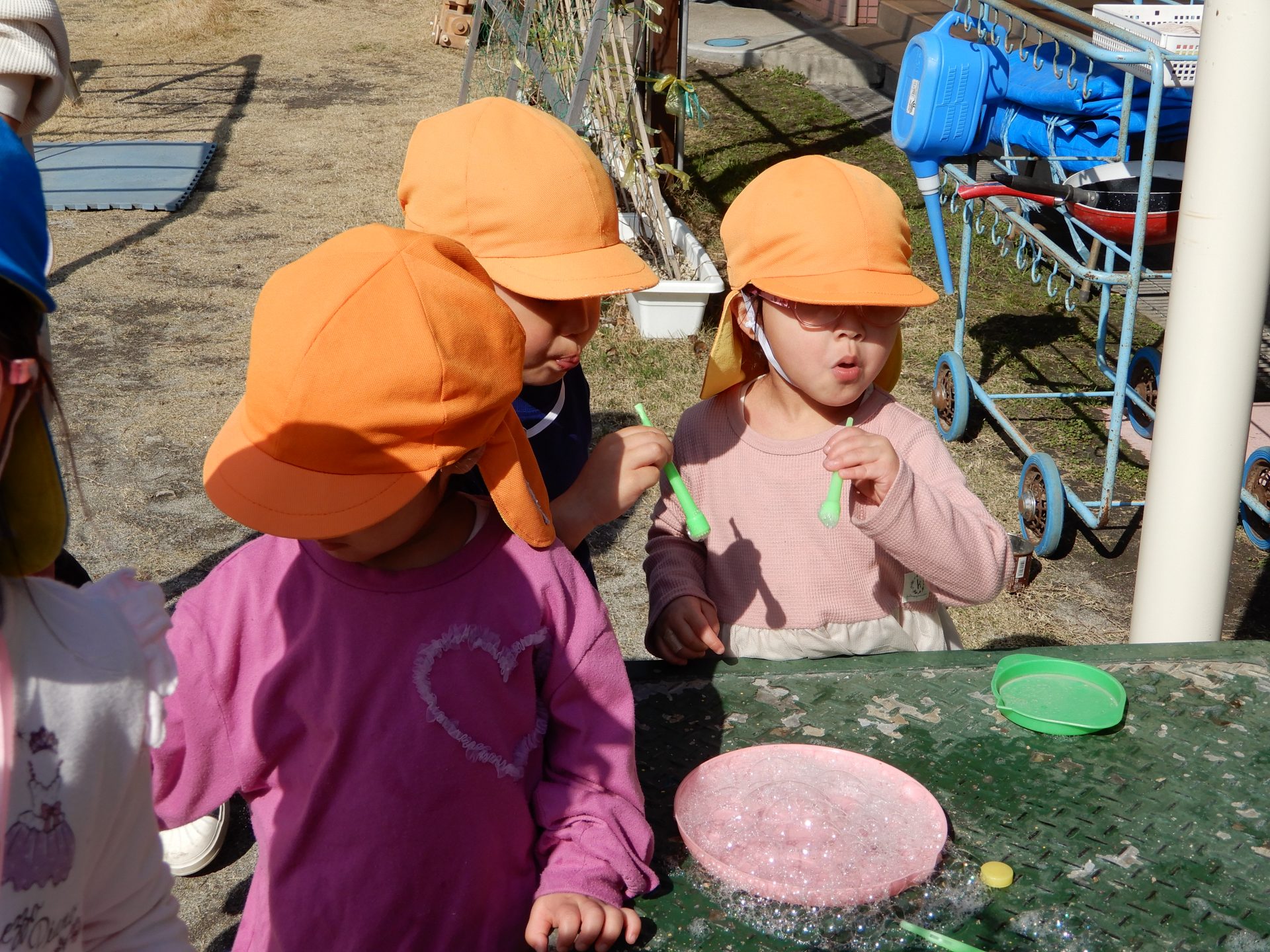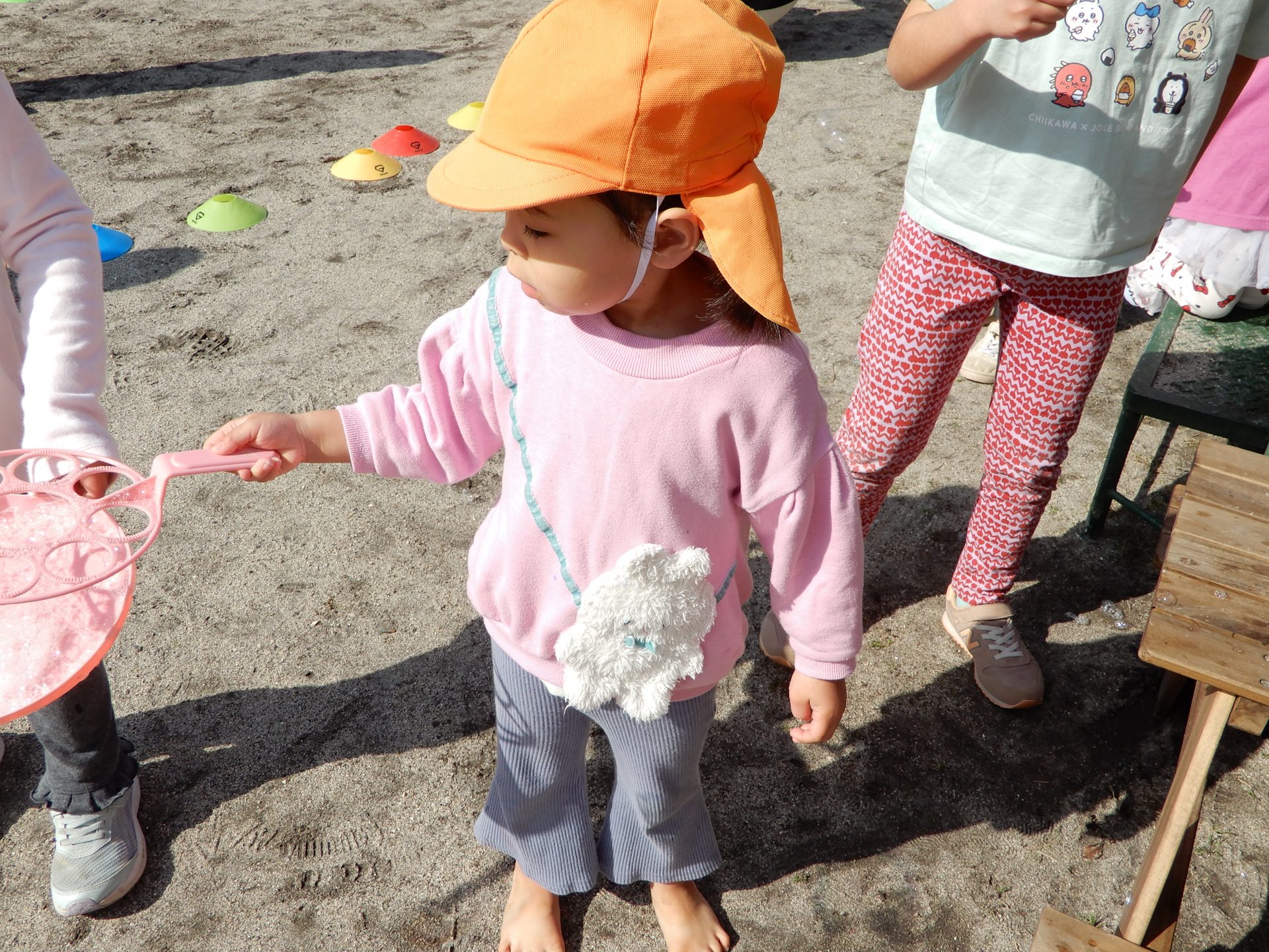 しゃぼん玉遊びにも夢中です⭐2歳児さんも興味深々で遊んでいます✨