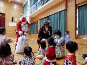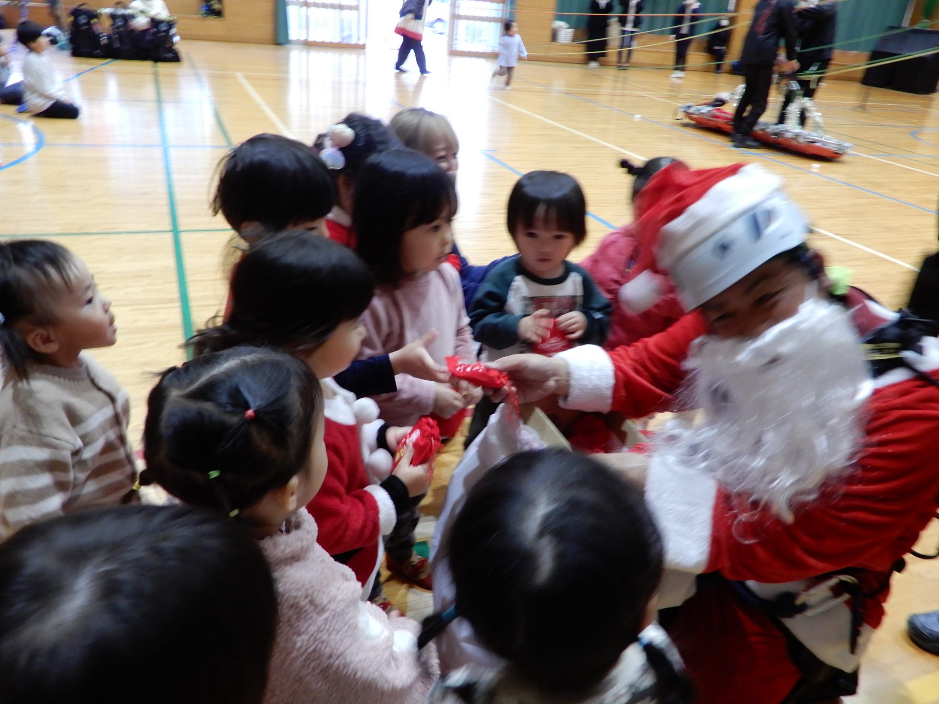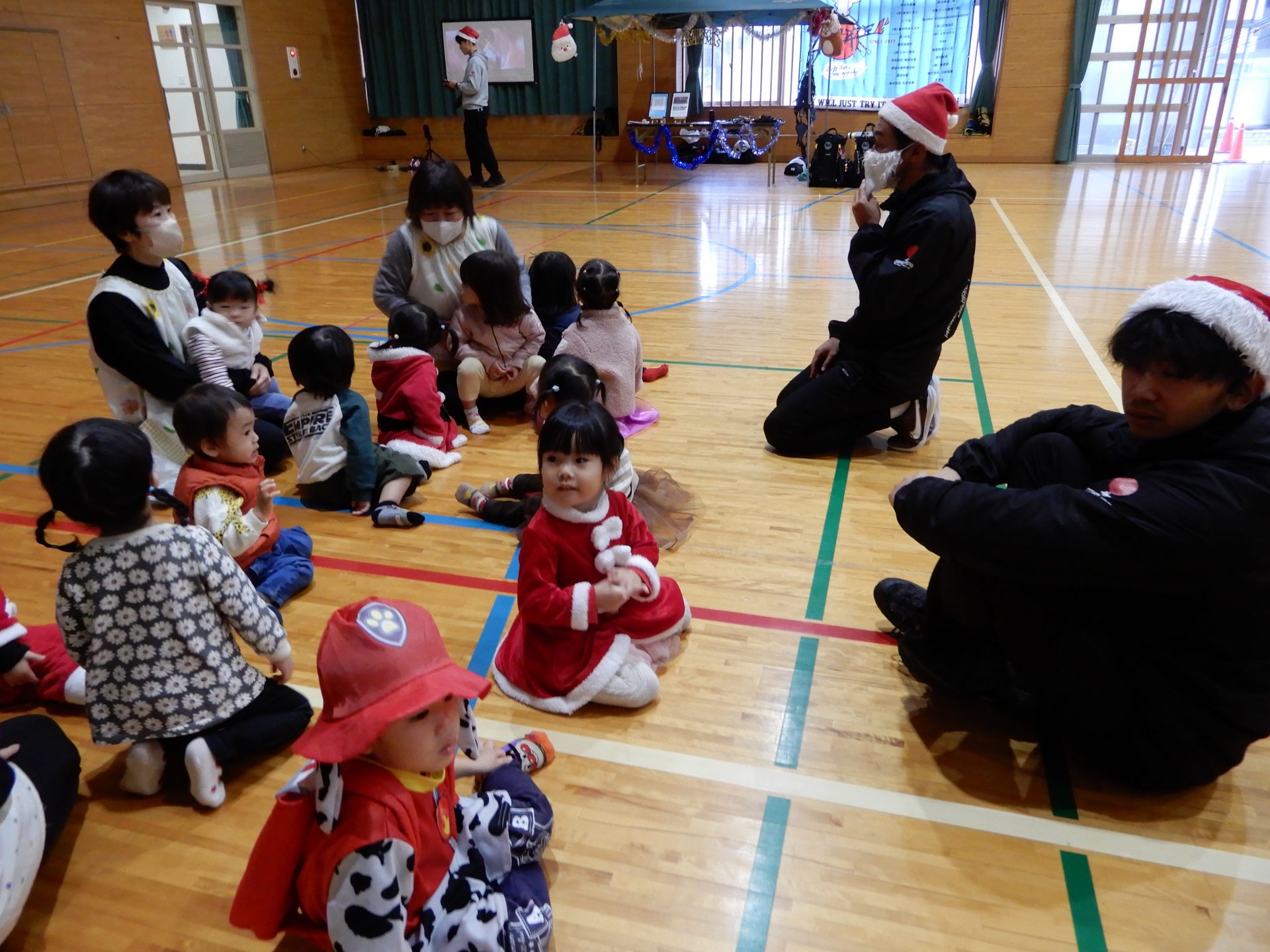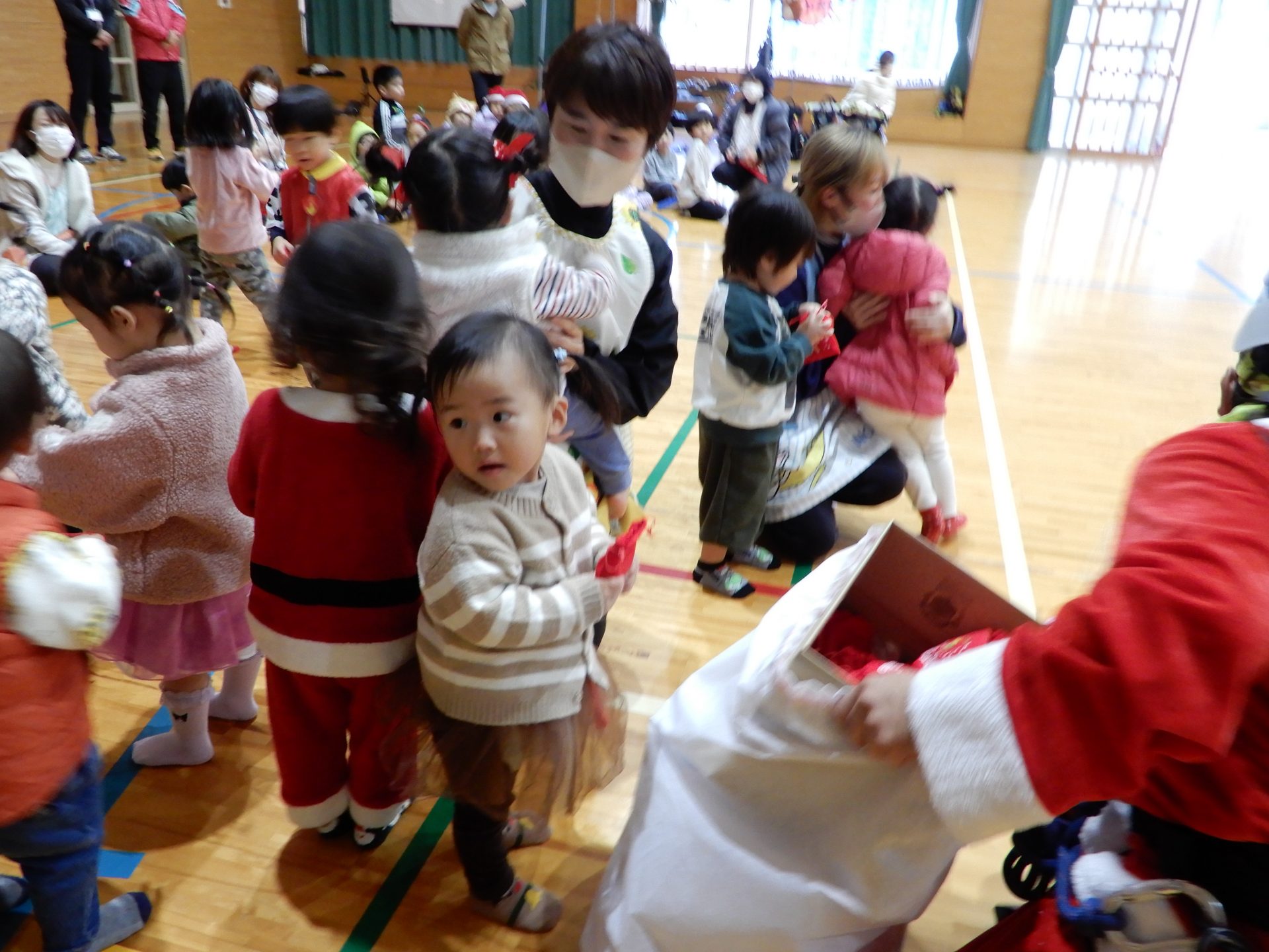 サンタさん🎅ありがとう💕(さくら1歳児) 朝、おやつを食べていると、サンタさんからの招待状をひまわりさんが持ってきてくれました😊 早速、サンタさんの足跡をたどって会いに行きます⭐ ちょっとドキドキ(>_<) 会場に到着すると、何が始まるのかなと興味深々・・・ なんとトナカイさん、サンタさんの登場にちょっとびっくり!しましたが、プレゼントをもらってにっこにこ😊の子どもたち😊 お忙しい中、すてきなクリスマス会をありがとうございました💕