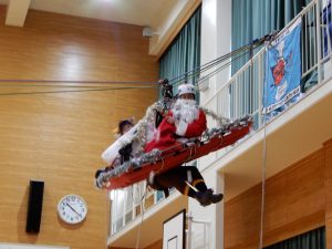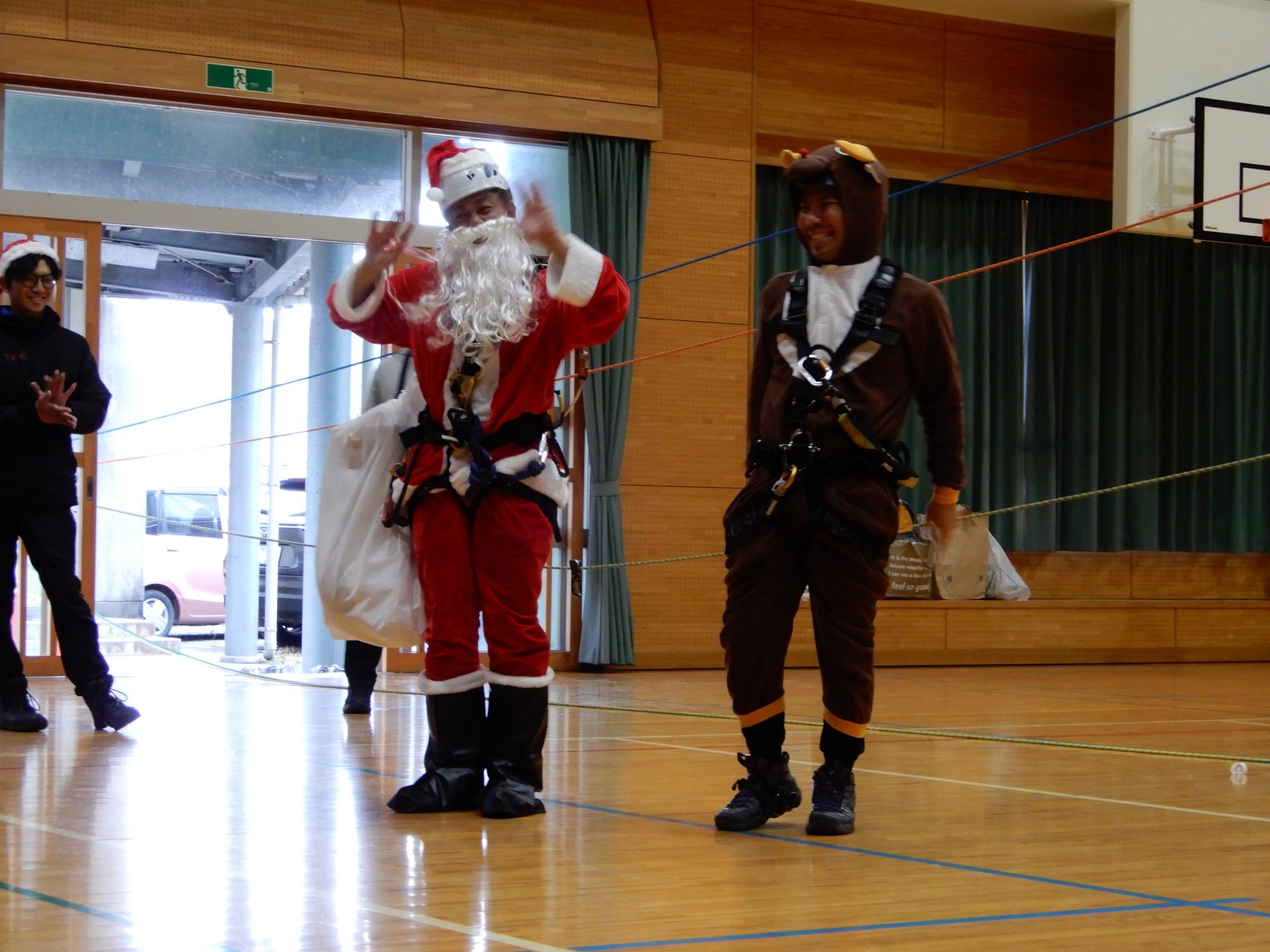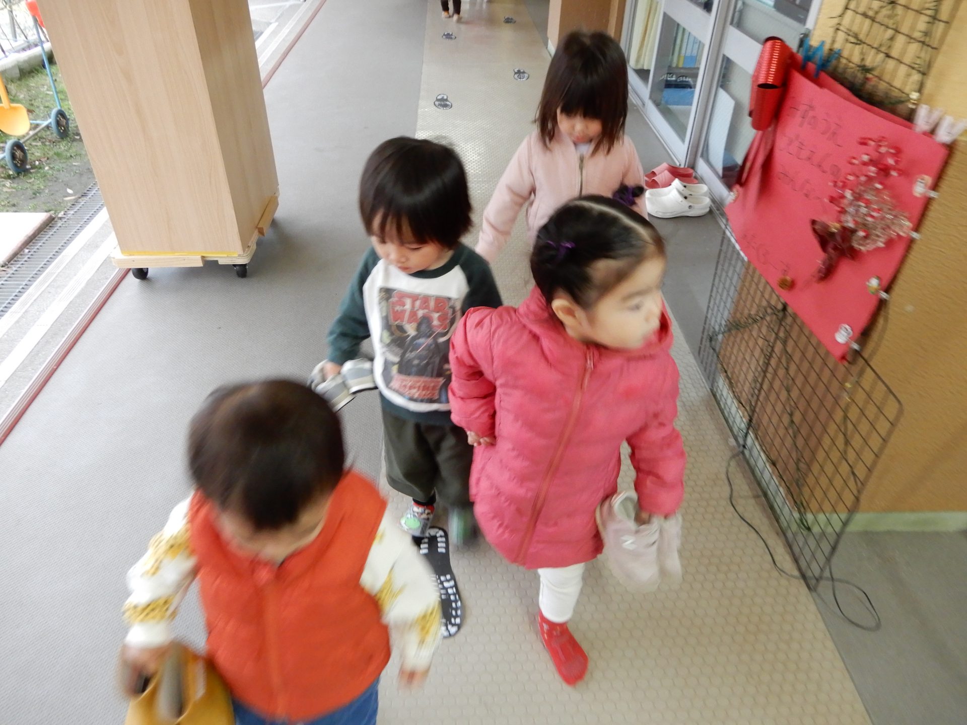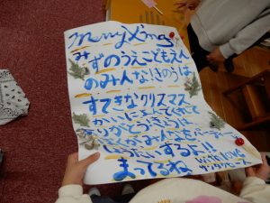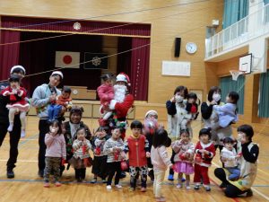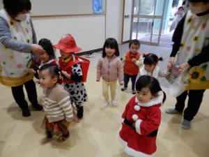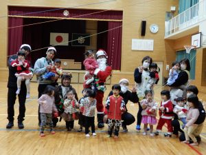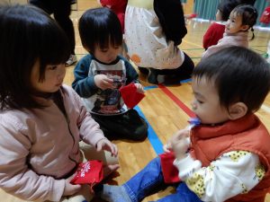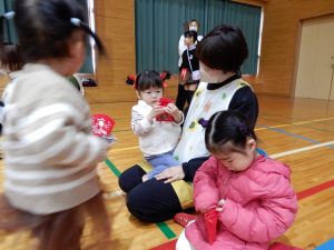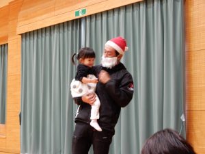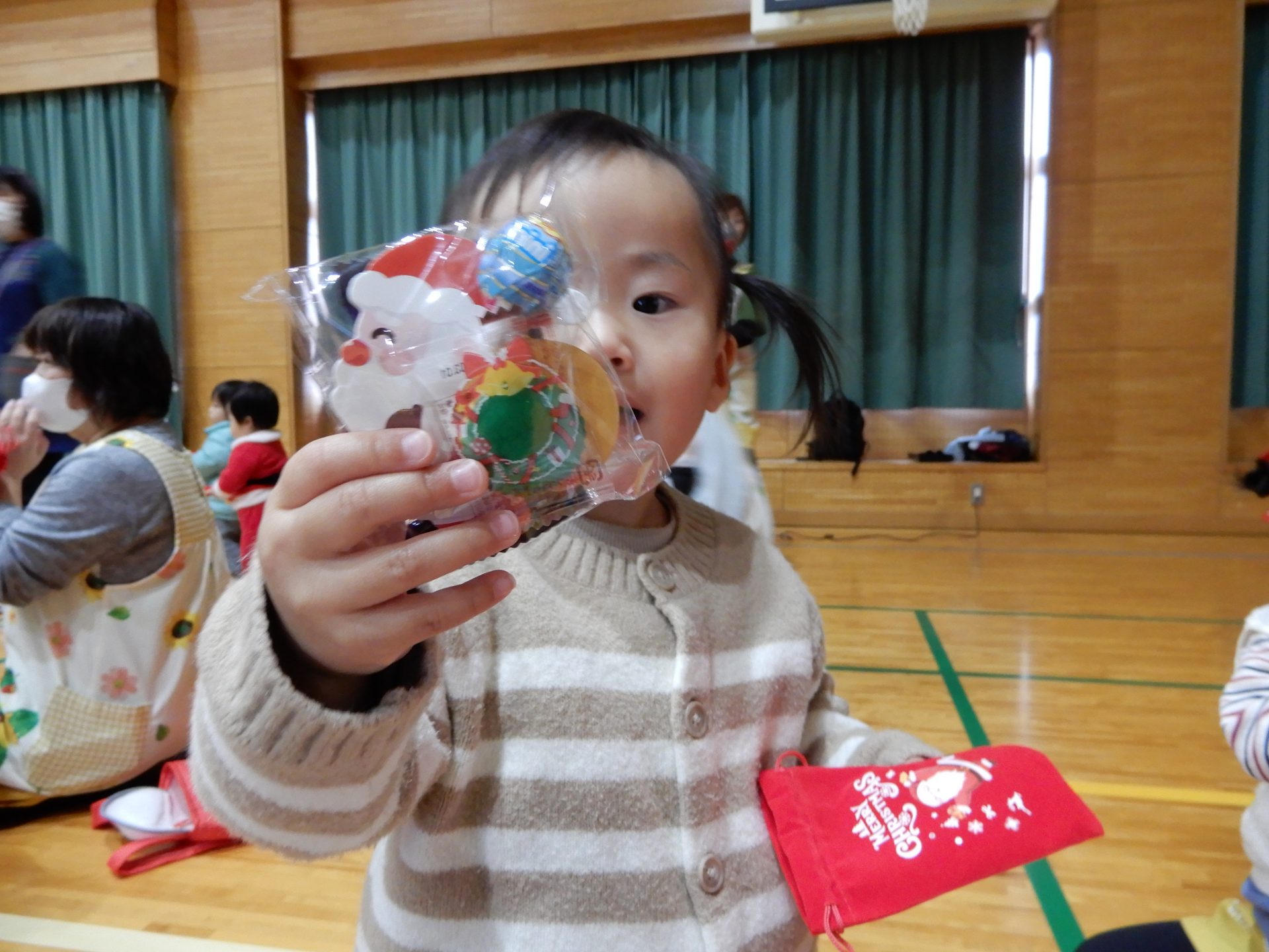 サンタさん🎅ありがとう💕(さくら1歳児) 朝、おやつを食べていると、サンタさんからの招待状をひまわりさんが持ってきてくれました😊 早速、サンタさんの足跡をたどって会いに行きます⭐ ちょっとドキドキ(>_<) 会場に到着すると、何が始まるのかなと興味深々・・・ なんとトナカイさん、サンタさんの登場にちょっとびっくり!しましたが、プレゼントをもらってにっこにこ😊の子どもたち😊 お忙しい中、すてきなクリスマス会をありがとうございました💕
