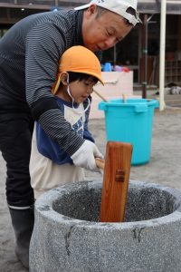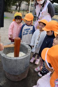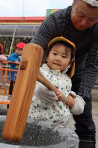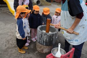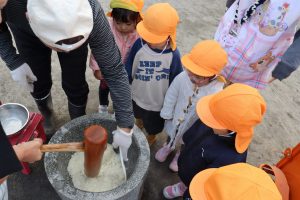 園庭に行くと、臼や杵、もくもくと大きな鍋からゆげが出る光景に