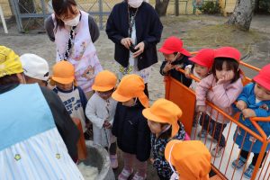 保育室から餅つきの準備する光景を見ていたお友だち🎵