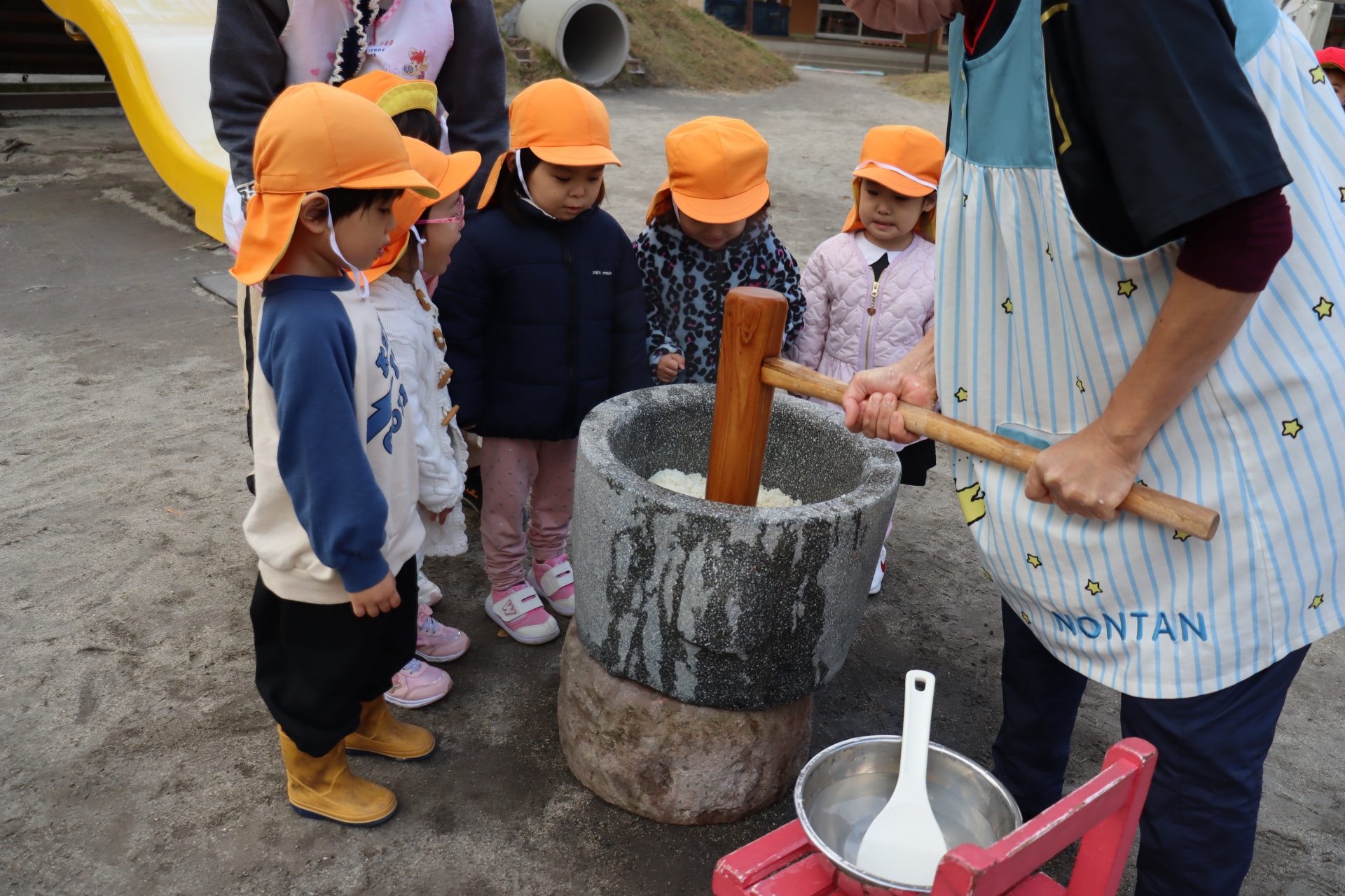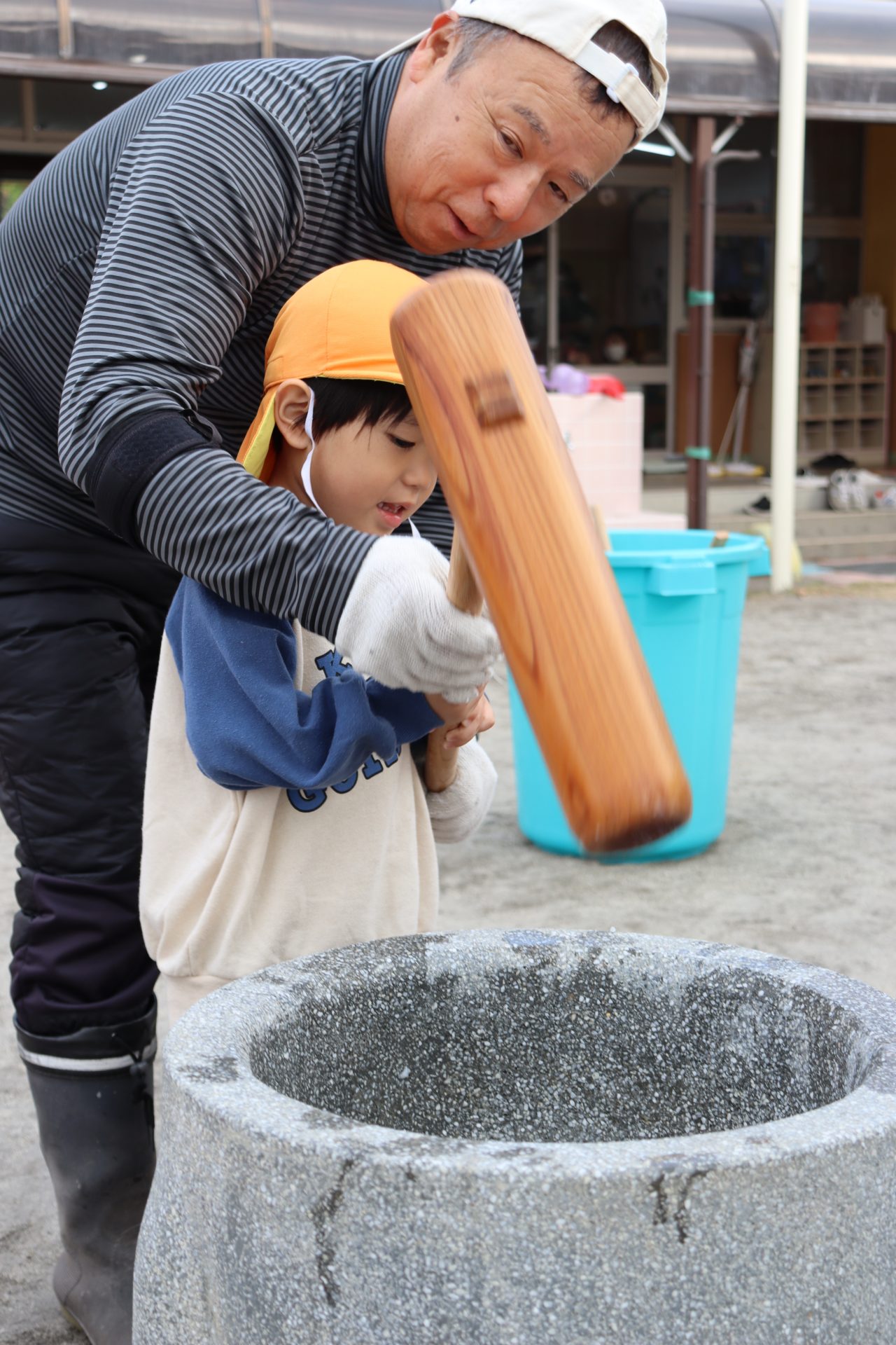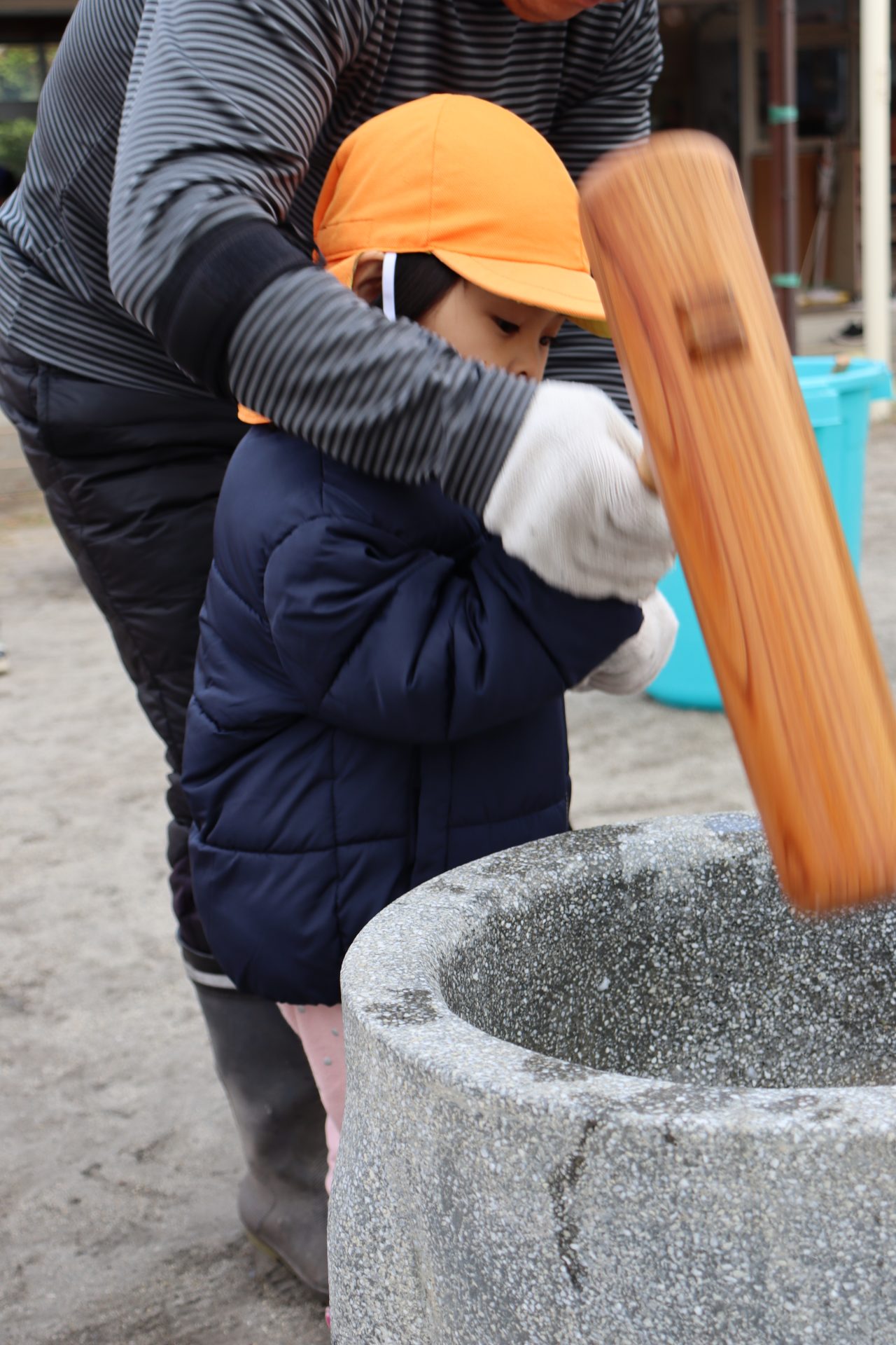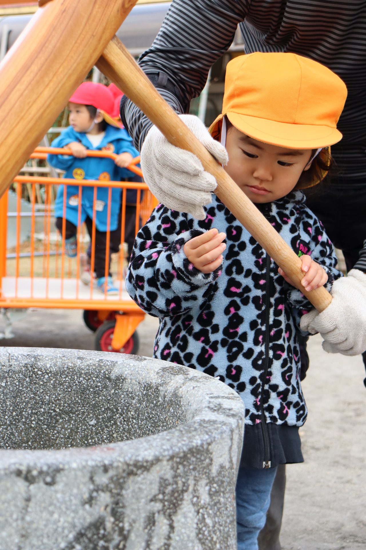 園庭に行くと、臼や杵、もくもくと大きな鍋からゆげが出る光景に
