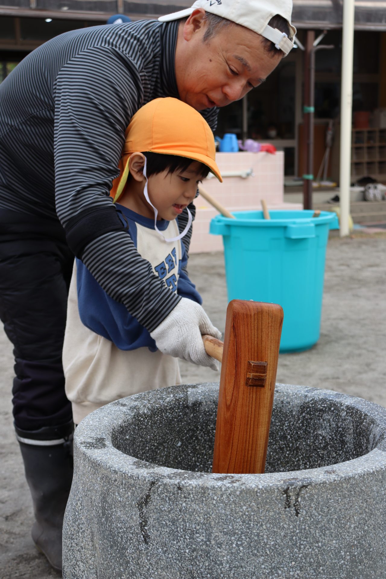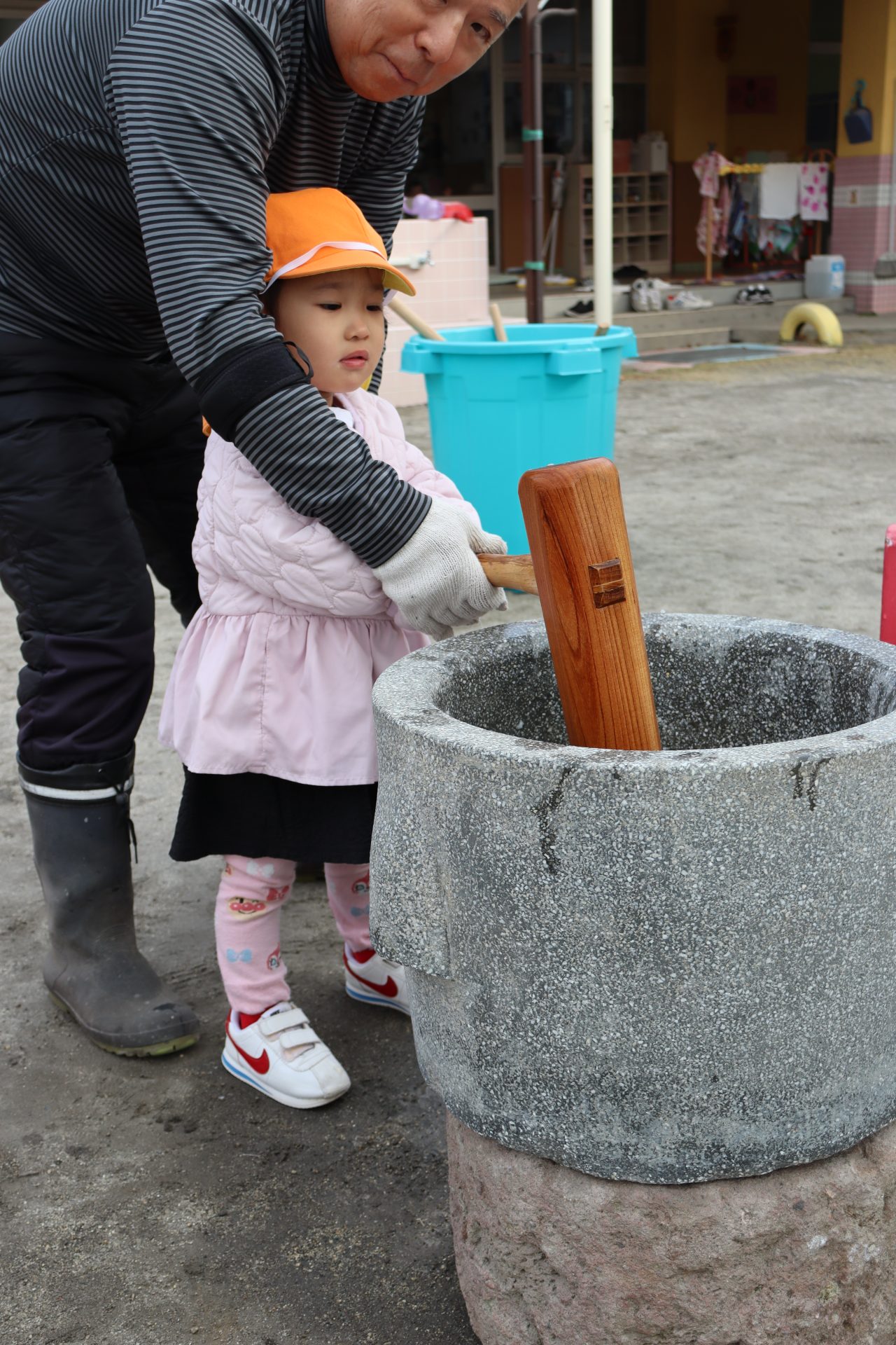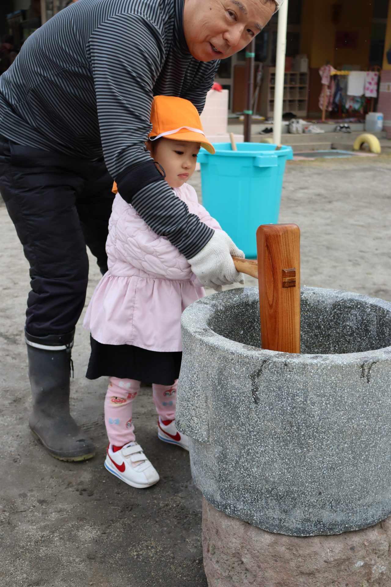園庭に行くと、臼や杵、もくもくと大きな鍋からゆげが出る光景に