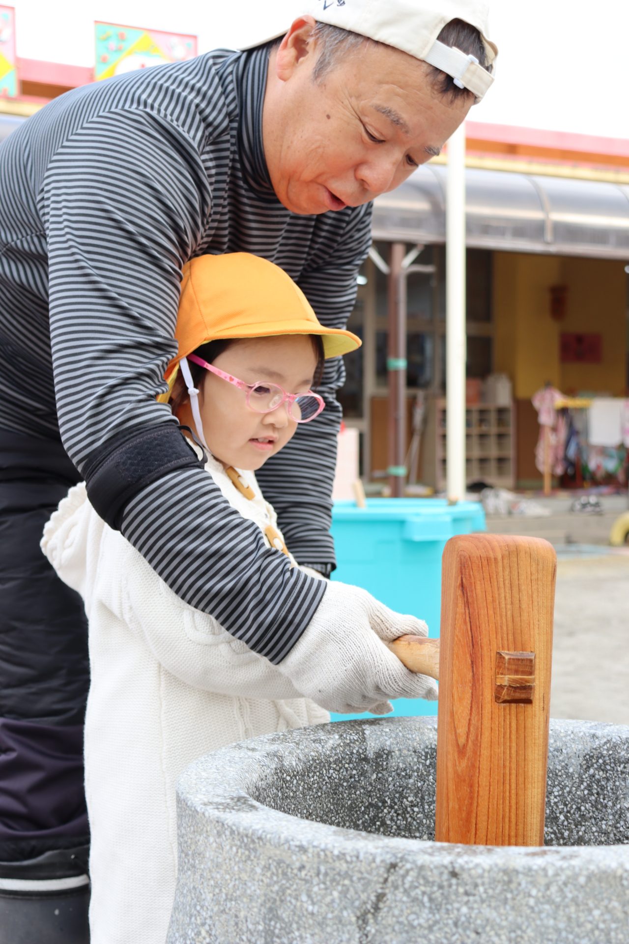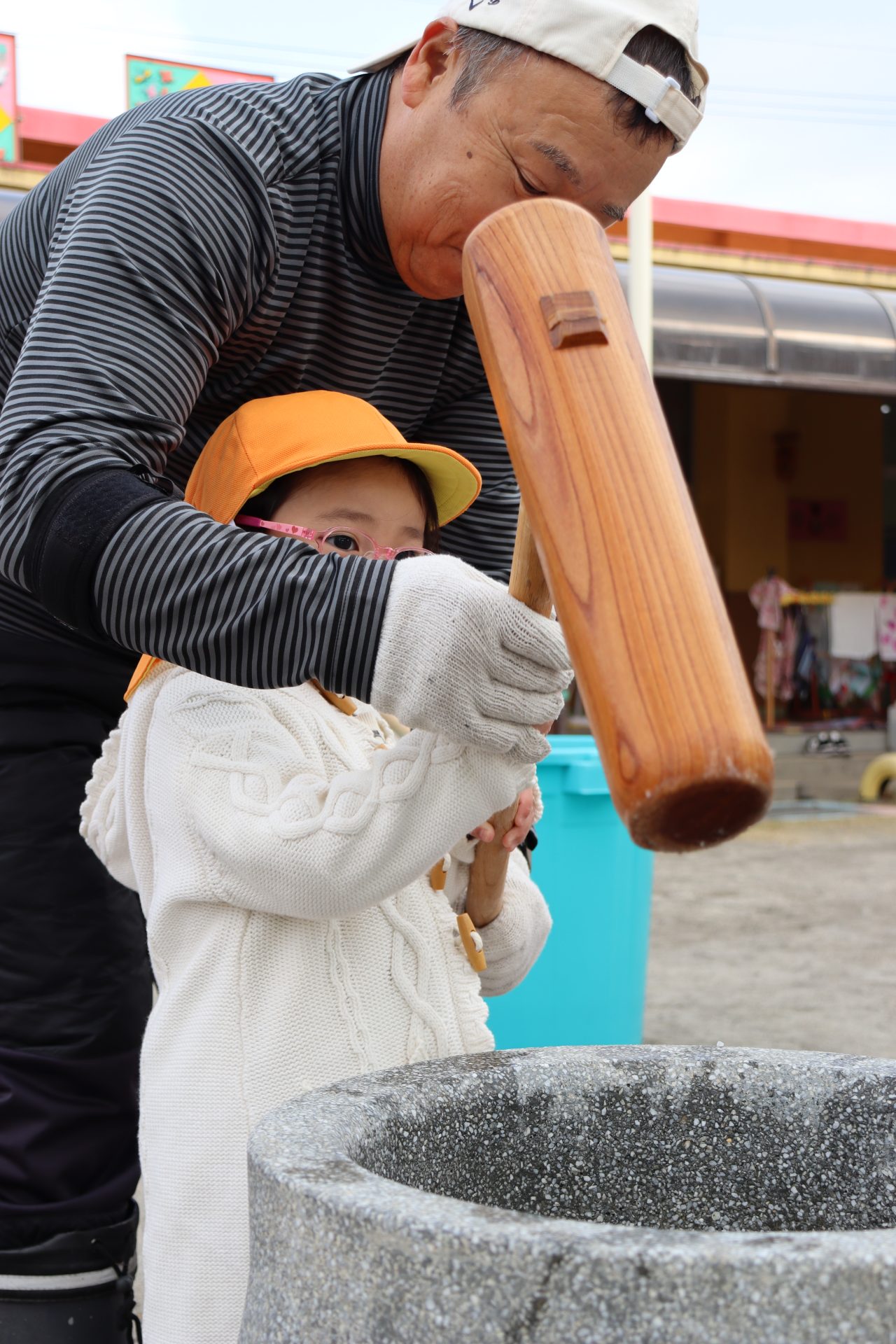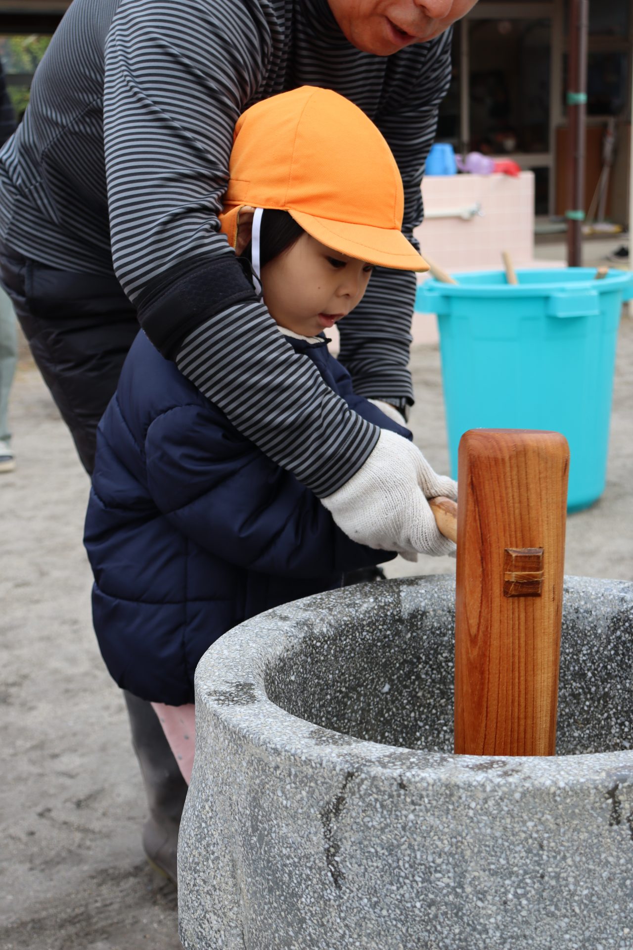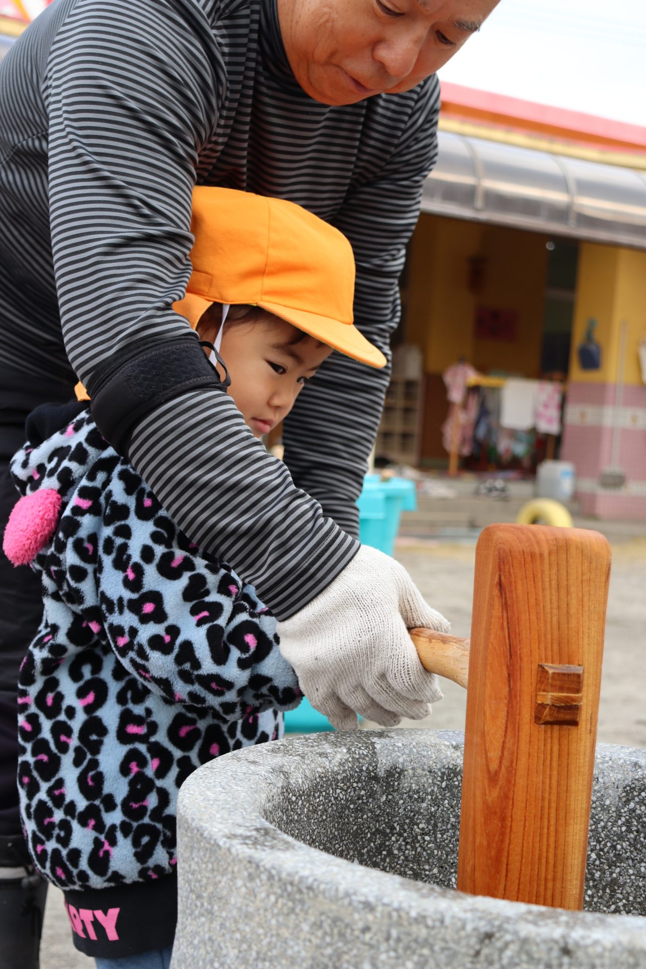 園庭に行くと、臼や杵、もくもくと大きな鍋からゆげが出る光景に