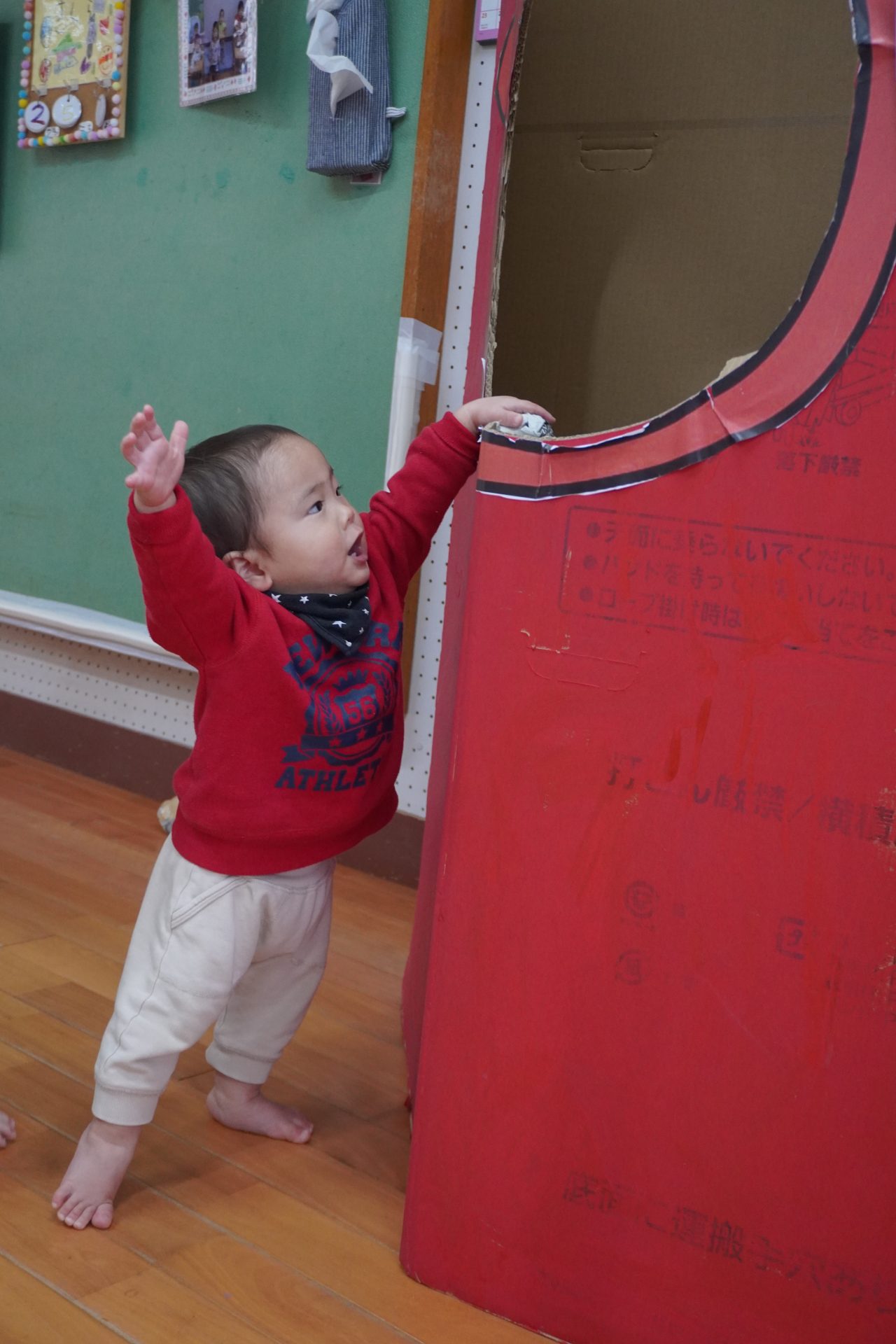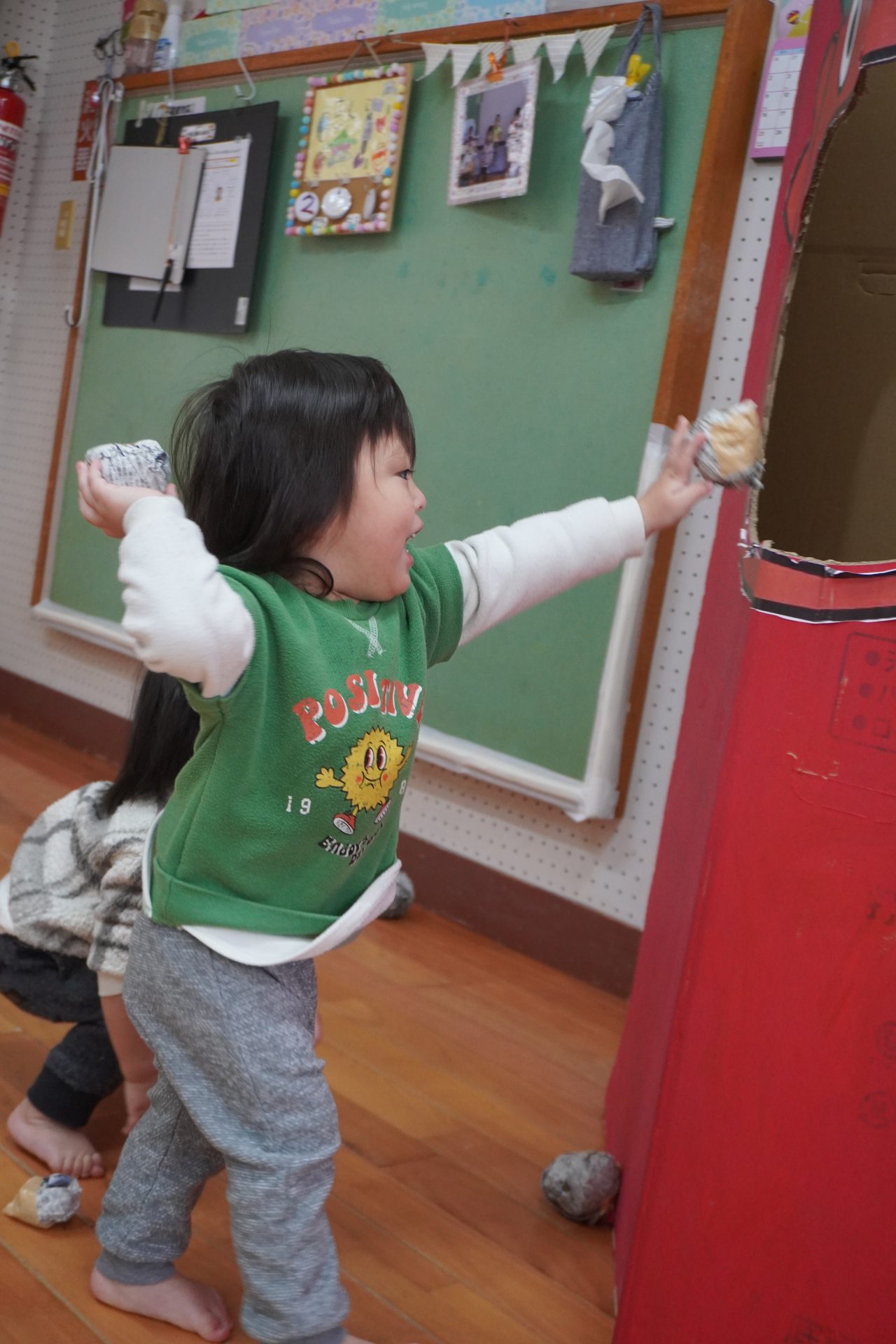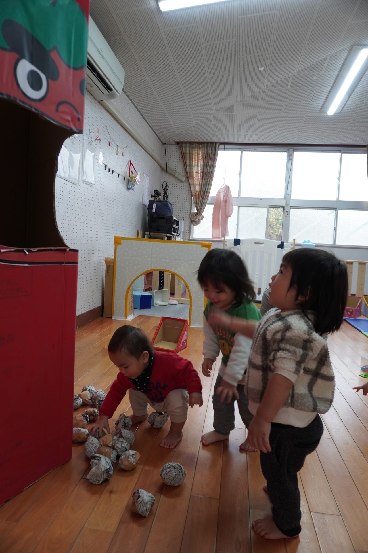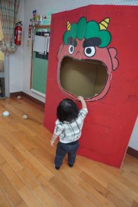 大きな赤鬼さんに驚きつつも…新聞紙ボールを投げていたらテンションup⤴⤴