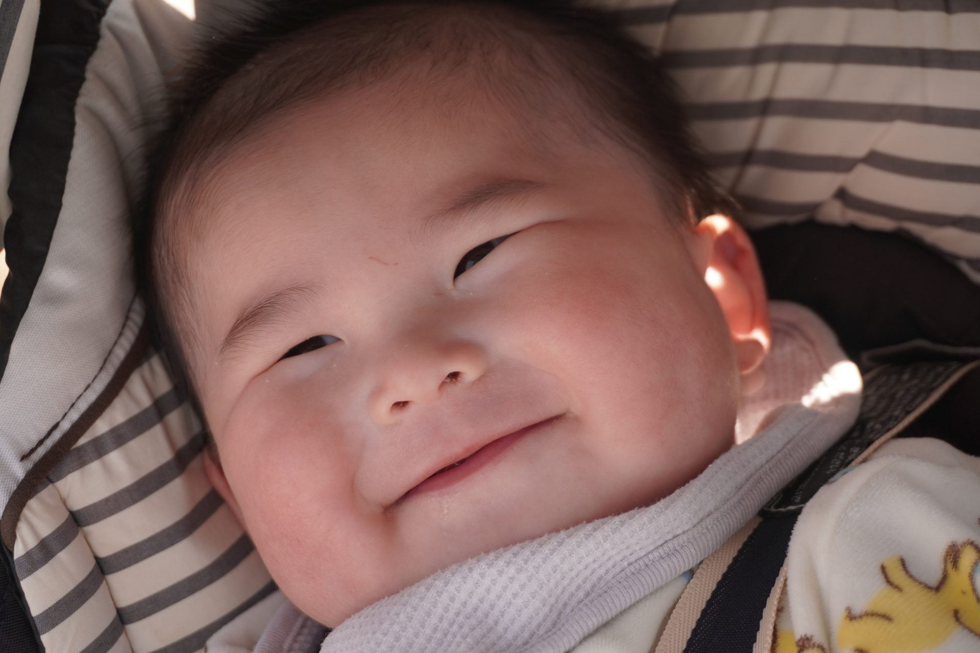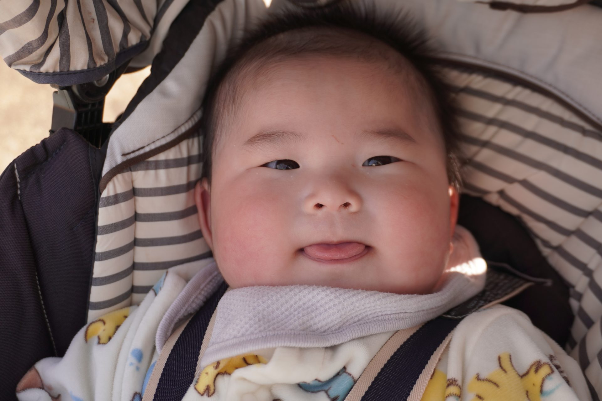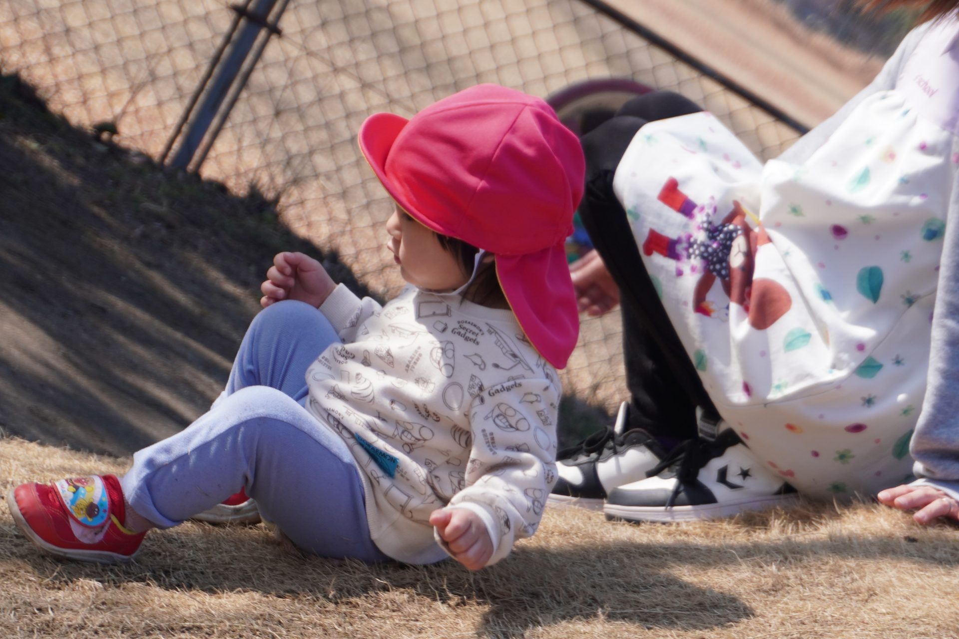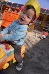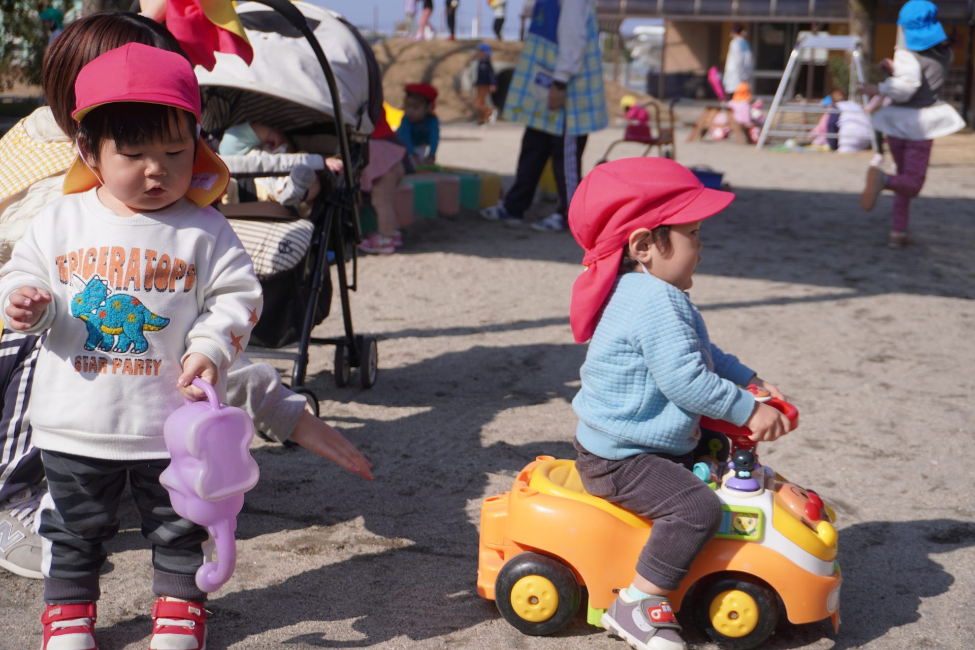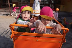 避難車やベビーカーに乗って、ちょっと園庭をドライブ…🚙