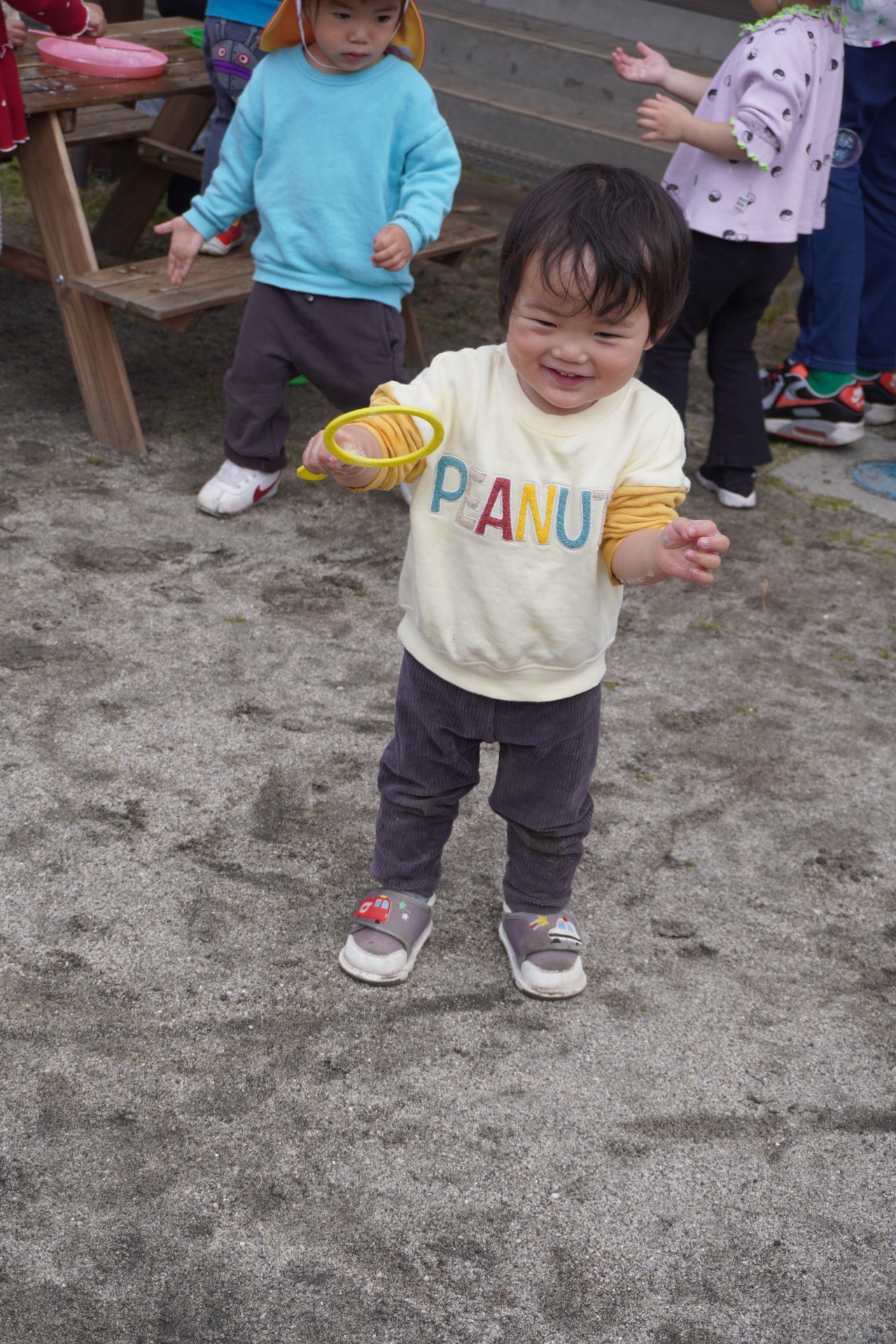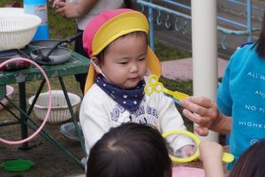 他クラスのお友達がシャボン玉遊びをしていると…興味津々の様子.。o○.。o○