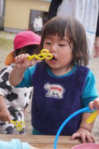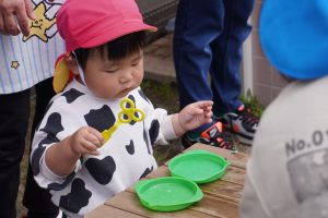 ストローにシャボン液を付けてあげると、口をとがらせてふーーっ…