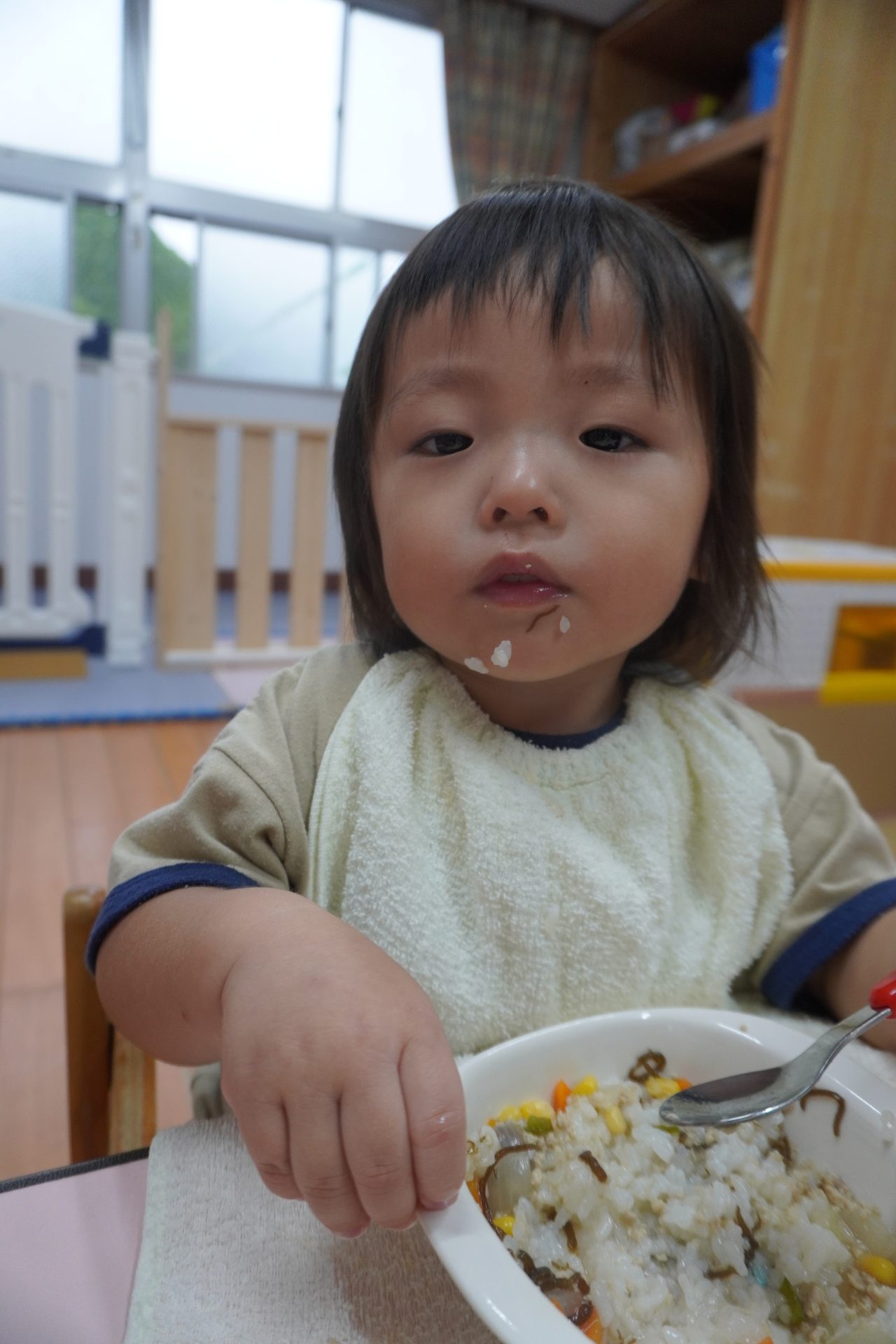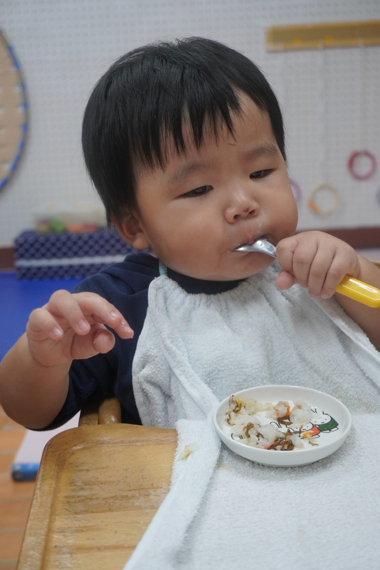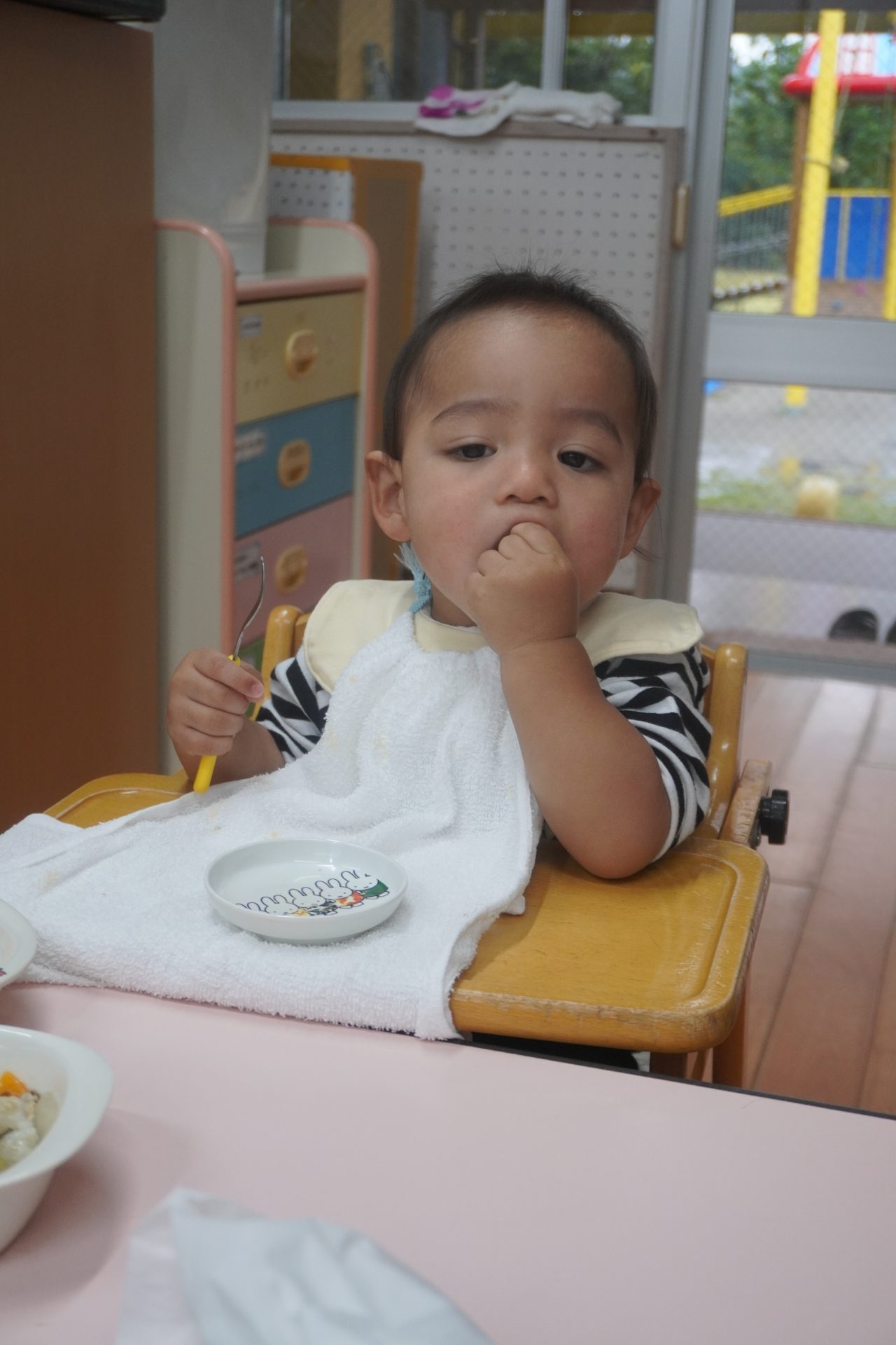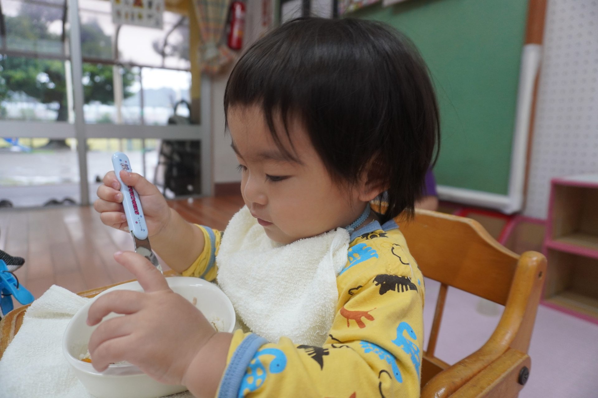 今では、自分で手掴みしたり、食具を持ったりして食べる事にチャレンジ中…😄😄