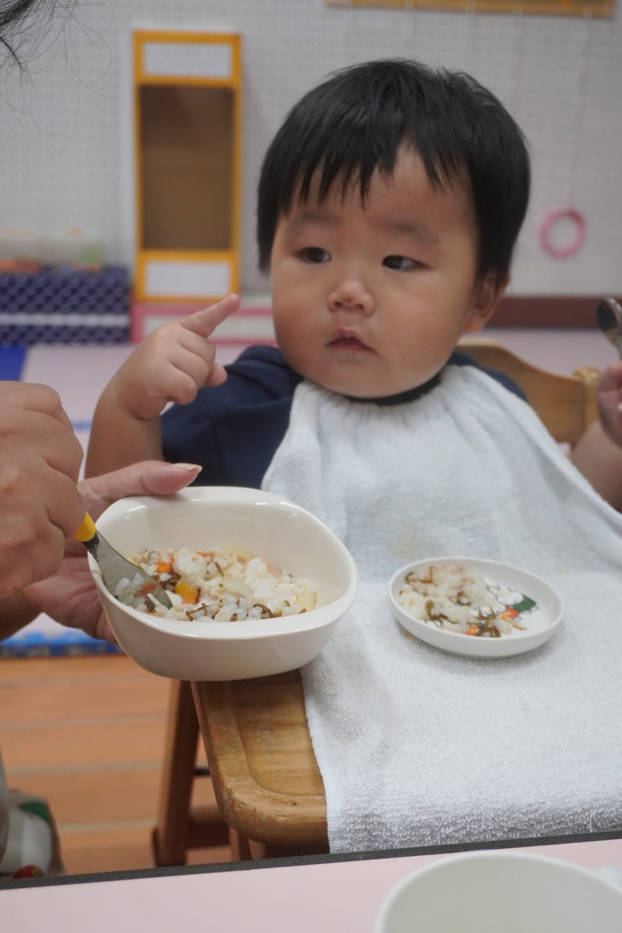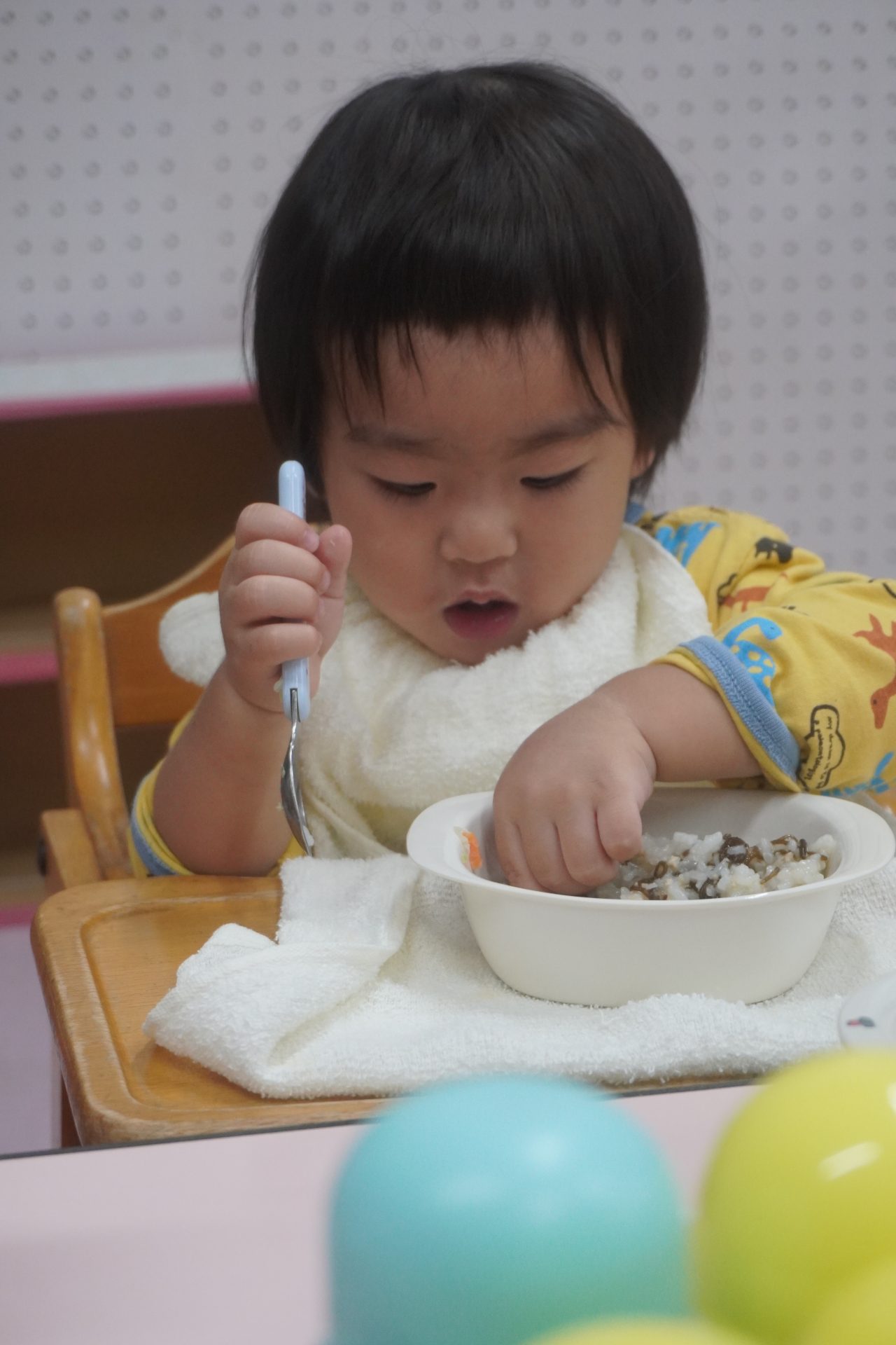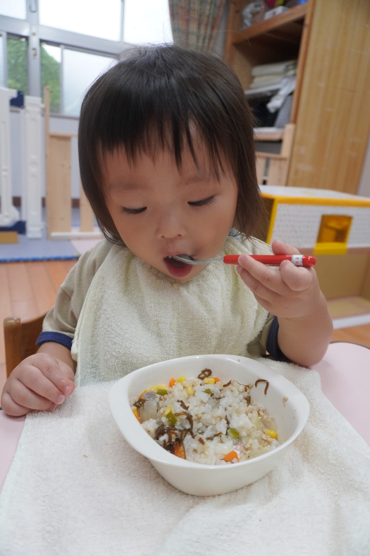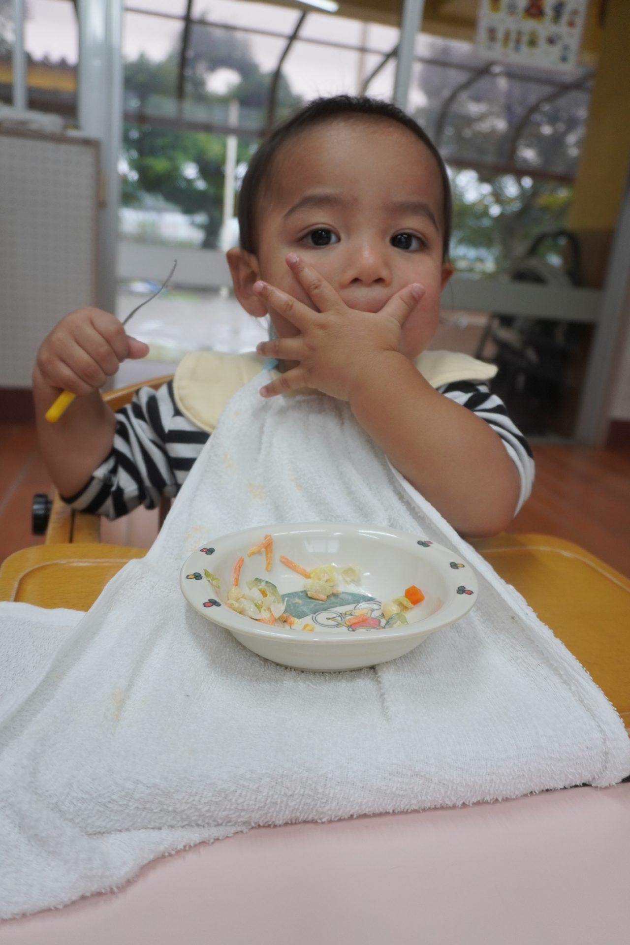 今では、自分で手掴みしたり、食具を持ったりして食べる事にチャレンジ中…😄😄