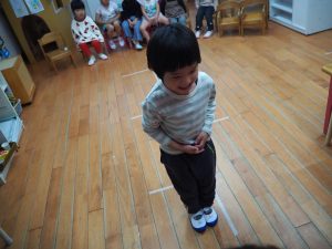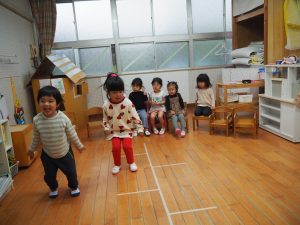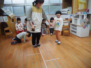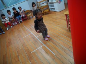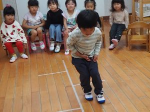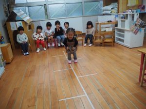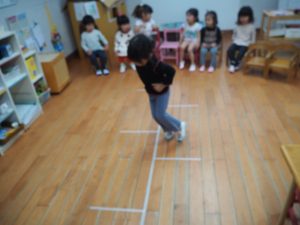 体を使って遊ぼう! たんぽぽ組 雨が続きますね💦子ども達も体を動かしたくてウズウズしているので 今日は体を動かして遊ぶ時間を作りました。 線に合わせてジャンプ。 みんなよく見て跳べていました😊 線の上を歩いたりも楽しいですよ✨